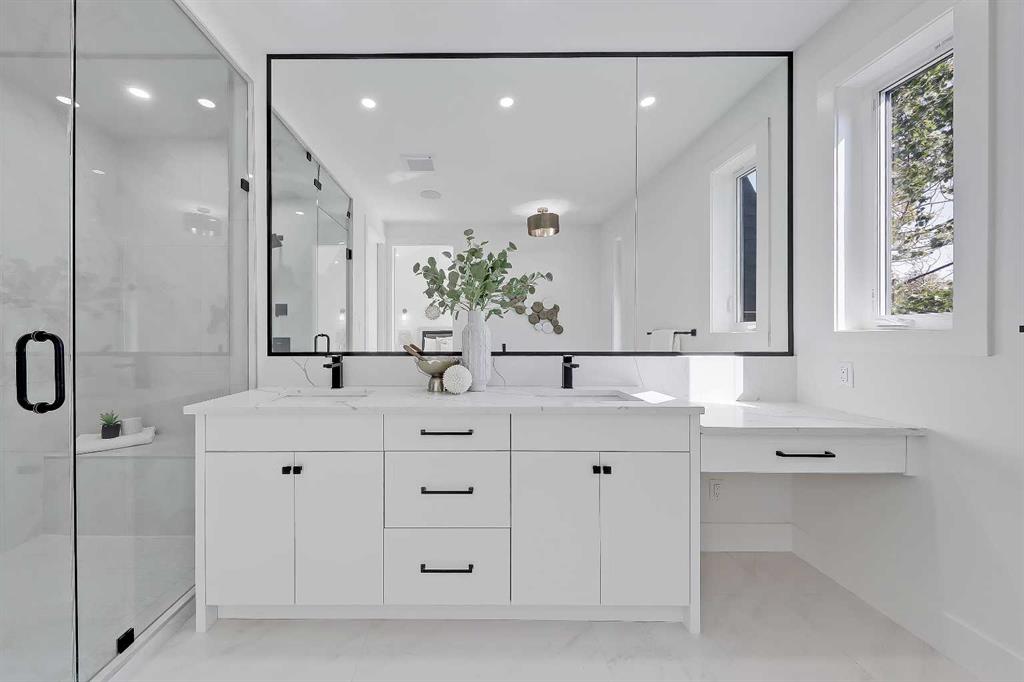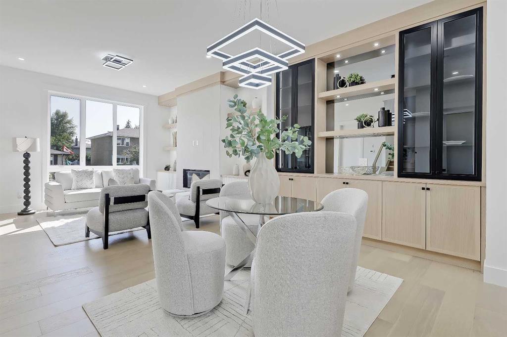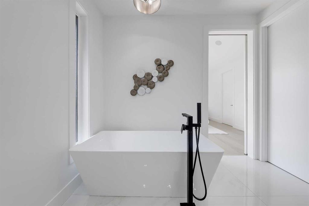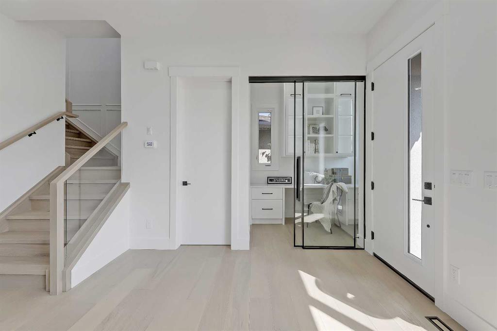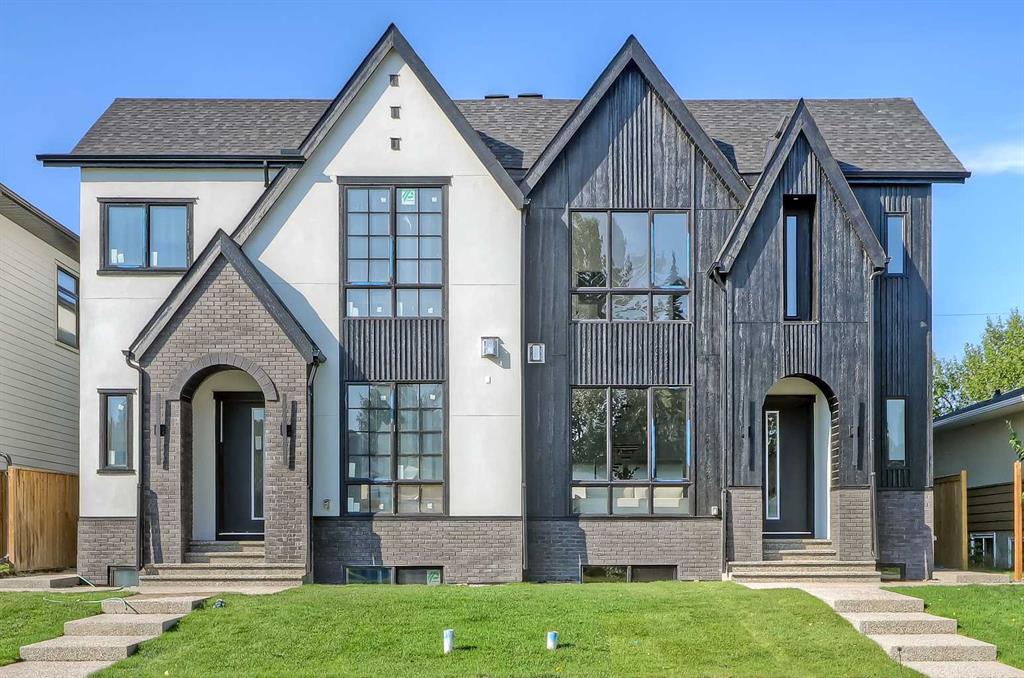 Tucked into the heart of SHAGANAPPI, this brand new 5-BED, SEMI-DETACHED home w/ LEGAL 2-BED SUITE (City approved) blends modern luxury with everyday comfort. Step through the arched entry to a welcoming foyer w/ walk-in coat closet, plus a stylish front OFFICE framed by glass doors, built-in desk & cabinetry—ideal for work-from-home. Wide-plank hardwood flows into the open-concept main floor, designed for living and entertaining. The living room centers on a sleek gas fireplace wall w/ designer tile surround and custom built-ins w/ inset lighting. At the back, the chef’s kitchen steals the show, anchored by a dedicated dining area w/ designer lighting, glass-front built-ins & in-cabinet lighting. High-end S/S appliances—gas range, custom hood fan, and DOUBLE WIDE FULL FRIDGE/FULL FREEZER, microwave & dishwasher—shine against an oversized quartz island built for gathering and stunning quartz backsplash with pot filler. A WALK-IN PANTRY w/ custom shelving adds smart storage. Bi-parting doors open to a large patio, extending the space outdoors. A chic powder room and mudroom w/ custom finishes complete this level. Upstairs, the primary suite feels like a retreat, w/ vaulted ceilings and oversized windows. The spa-inspired ensuite has it all: freestanding soaker tub, huge glass shower w/built in bench & rough in for steam, dual vanities w/ makeup desk, plus a dreamy walk-in closet. Two more bedrooms—each w/ TRAY CEILINGS with built-in lighting—share a stylish Jack & Jill bath w/ separated vanity & bath areas. The loft/study offers open shelving and flexible space for reading, working, or relaxing. A well-planned laundry room finishes this floor. The fully finished EXTENDED BASEMENT adds almost 1100sqft of additional living space. The legal 2-bed suite features quartz counters, S/S appliances, custom cabinets, private laundry, and its own side entrance w/ built-in storage. A bonus third space can connect to the suite or be locked off as a private GYM for the main home making it perfect for guests, family, or a rental incentive. Set in the vibrant Shaganappi community, this home puts Calgary’s best at your door. Golf at Shaganappi, stroll parks and pathways, or zip downtown in minutes. With great schools, trendy restaurants, boutique shopping, and easy transit nearby, this is modern city living at its best. All you have to do is move in! *Photos from show suite, finish may vary