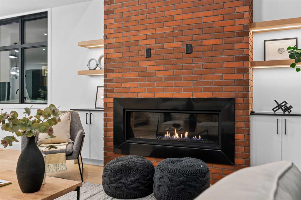The LIVING ROOM is a SHOWPIECE, anchored by a STRIKING BRICK FIREPLACE, CUSTOM MILLWORK, and those same LARGE, OVERSIZED WINDOWS that bring the outdoors into every moment. This space blends ARCHITECTURE and WARMTH seamlessly, offering the perfect setting for gatherings or quiet evenings at home.