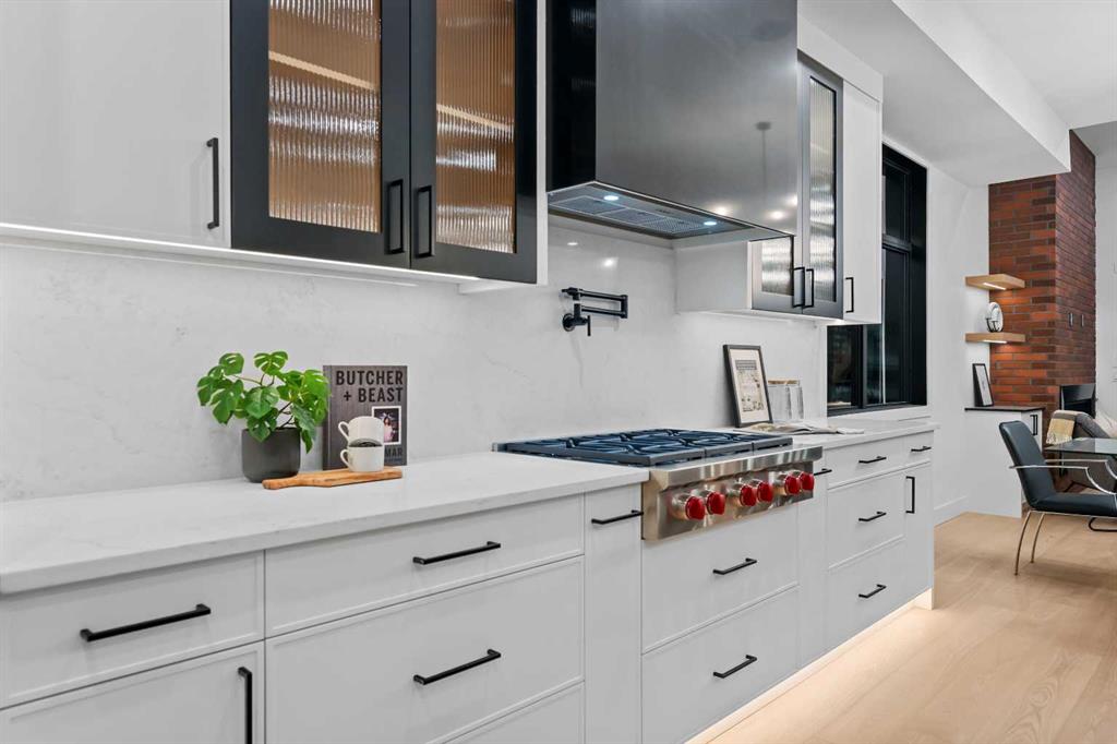 The gourmet kitchen continues the theme of elevated living with a WOLF GAS RANGE, CUSTOM HOOD-FAN CANOPY, OVERSIZED REFRIGERATOR, WATERFALL ISLAND, DOUBLE OVENS, POT FILLER, and HIGH-END FINISHES selected for both BEAUTY and PERFORMANCE.