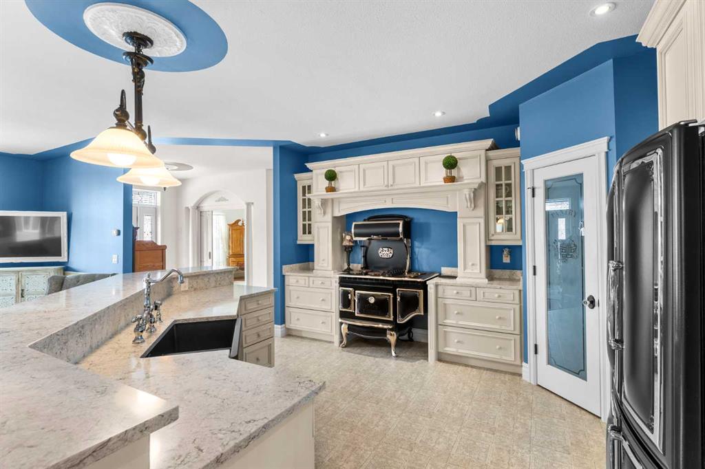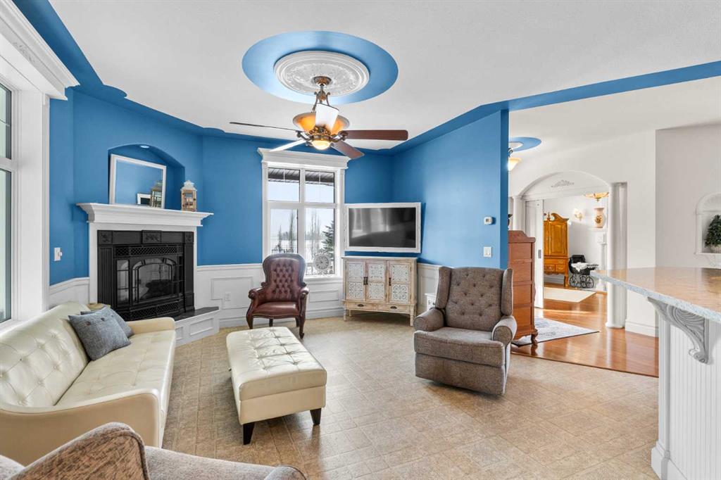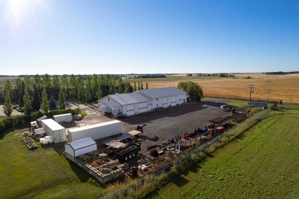 This beautifully landscaped 5.49-acre acreage offers exceptional potential for a small/medium-sized business and additional housing for extended or blended families. Located 5 minutes north of Didsbury, AB, and 10 minutes south of Olds, AB, just off Highway 2A, it boasts gorgeous mountain views. The main house, with 2,017 sq ft of French country charm, features crown moldings, barn and French doors, and hardwood floors. The spacious kitchen, updated in 2023, has a two-tiered island, quartz countertops, a farmhouse sink, hard wood floors and ample cabinet space. The main floor also includes a dining room, living room, covered maintenance-free veranda with an outdoor kitchen. Master bedroom with a 4-piece ensuite, fireplace, soaker tub, and walk-in closet. Additional spaces include a 2-piece bath, second bedroom, laundry room, mudroom, and garage entrance. The fully finished walk-out basement provides 1,735 sq ft, featuring 2 bedrooms, a media room, a 4-piece bath, a playroom, and storage. ICF construction, crown moldings, fresh paint (2023), and in-floor heating throughout enhance the home's appeal. The oversized, heated double garage has a paved driveway. The property includes a 6,400 sq ft shop (128' x 50') with three-phase power. Features include a 50’x24’ drive-through wash bay with 12’ overhead doors, a 50’x24’ welding bay with a 16’ overhead bay door and crane. 50’x80’ main shop area with two 14’ bay doors and 16’ clearance. The shop also has a wood workshop, paint storage, front office space, and a 3-piece bathroom. A new boiler (2024) ensures in-floor heating. Above the woodworking shop, a spacious living area includes a kitchen, laundry, 4-piece bathroom, 3 bedrooms, a master bedroom with a walk-in closet, and a storage room. The mezzanine adds additional living space, perfect for additional family members. This exceptional property has been meticulously maintained and offers an unparalleled combination of country residential comfort and business potential. Whether you are seeking a spacious family home, a live-work opportunity, or a combination of both, this acreage provides a rare and sophisticated setting with limitless possibilities.