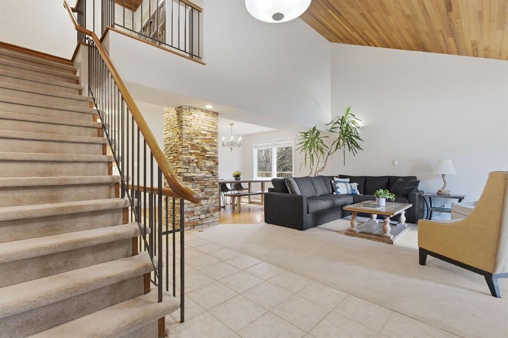 Inside, the spacious two story home delights with over 2500 sq ft of above grade sq ftg and a bright and functional layout designed for family living. Large windows throughout fill the space with natural light and perfectly frame the surrounding greenery. Soaring cathedral ceilings create an airy first impression, while the main rooms provide ample space for everyday living and entertaining alike.
