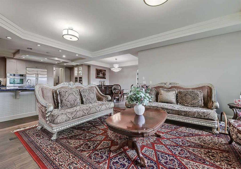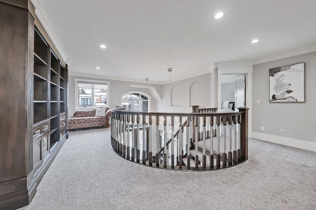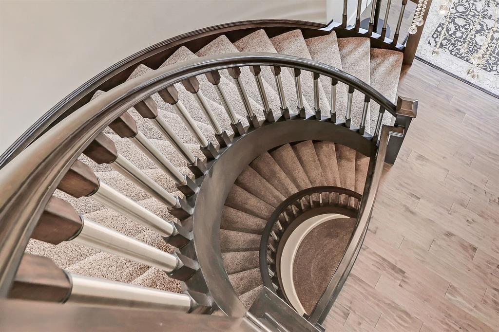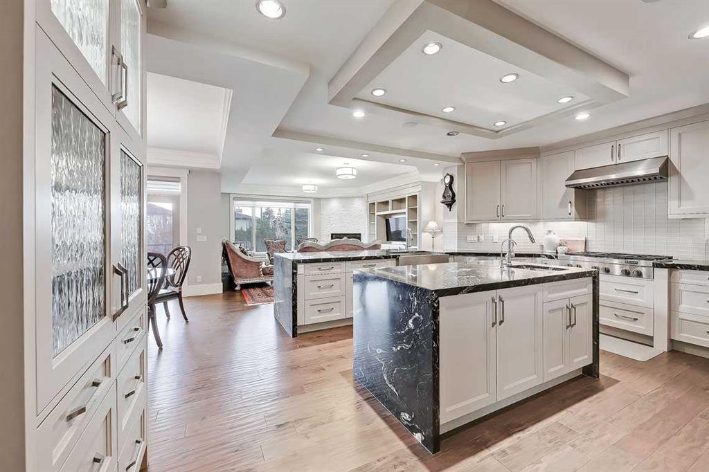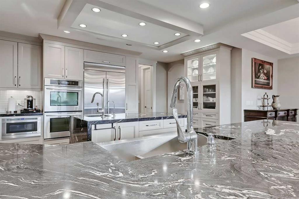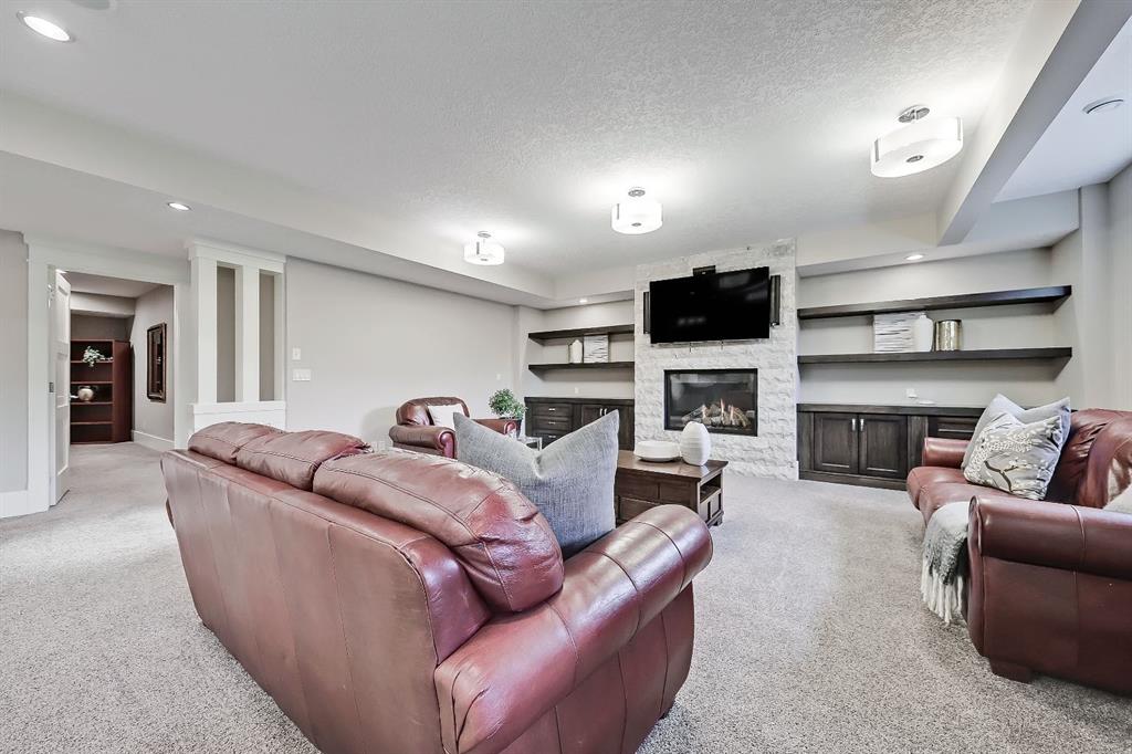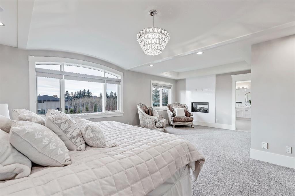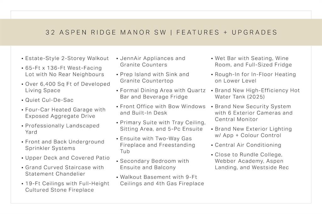 This exceptional Aspen Woods residence captures the best of west-side living—space, light, and quiet sophistication. Set on a 65’ x 136’ lot with a west-facing backyard and no rear neighbours, this well designed home offers over 6,200 sq.ft. of thoughtfully crafted living space. Soaring 19-ft ceilings, a chef-inspired kitchen, elegant living and dining areas, and a full lower-level entertainment zone define this remarkable home. A stone-and-stucco exterior, exposed aggregate drive, and heated 4-car garage set an impressive tone. Inside, a grand curved staircase and statement chandelier anchor the foyer. The living room features double-height ceilings and a full-height stone fireplace beside the formal dining area with bar and display cabinetry making this the perfect place to entertain friends and family. The kitchen connects effortlessly to the family room and breakfast nook, featuring JennAir appliances, granite counters, a prep island, bar seating, and walk-in pantry. A refined office with a built-in granite-topped desk and custom millwork creates a sophisticated and luxurious workspace for ultimate comfort and productivity. Nicely completing this floor is a large laundry with ample counters and storage, a stylish powder room featuring a stunning stone accent wall, and a well-appointed mudroom with custom built-ins. Upstairs, the primary suite is a true retreat with sitting area, walk-in closet, and spa-inspired 5-pc ensuite with two-way fireplace, freestanding tub, dual vanities, and tiled shower. An additional 3 bedrooms include one with ensuite and balcony, plus two sharing a 5-pc bath and loft nook. The walkout lower level impresses with a large rec area, wet bar, wine room, fourth gas fireplace, two bedrooms, and two full baths. Additional highlights include central A/C, in-floor heat rough-in, new high-efficiency hot water tank (2025), covered patio, upper deck, pro landscaping with irrigation, smart exterior lighting, and a six-camera security system. Quietly tucked on a cul-de-sac near top private schools (Rundle, Webber & Calgary Academy), Aspen Landing, Westside Rec, LRT, and pathways—this is elevated west-side living at its finest and the perfect place to call home.