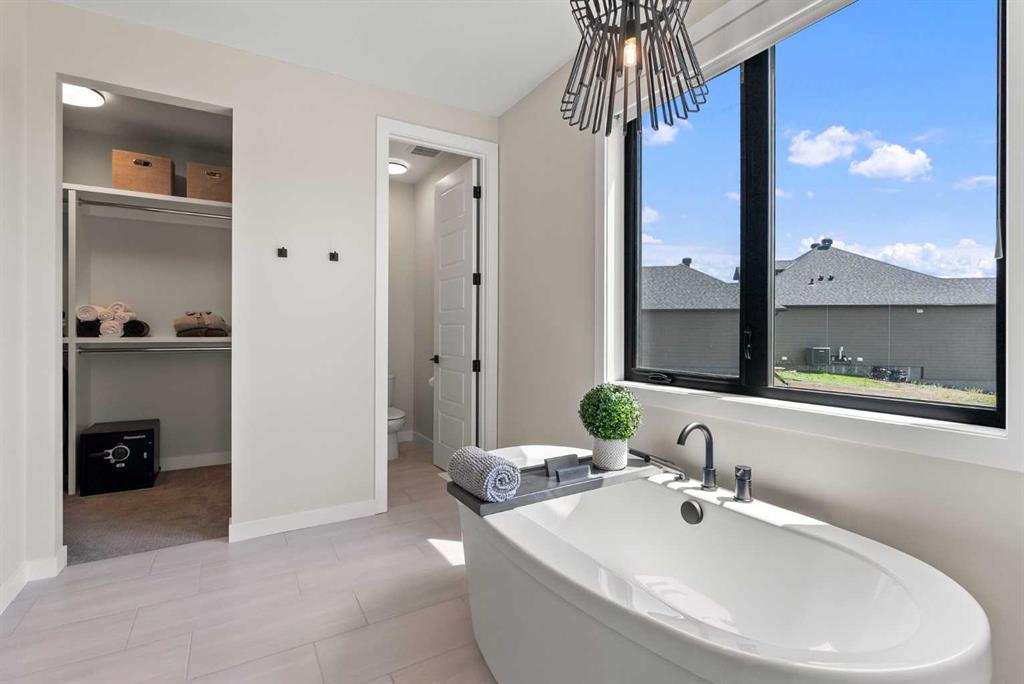 The main level showcases an open, airy design with vaulted ceilings that bath the living areas in natural light. The gourmet kitchen features a large island and soft-close cabinets, seamlessly connecting to the dining and living spaces—an ideal layout for entertaining family and friends. The private primary suite provides a retreat with an elegant ensuite that includes a soaker tub, a glass-enclosed shower, and dual vanities, complemented by a large walk-in closet with built-in organizers. Convenience is at hand with a main-floor laundry located along the corridor to the heated, insulated triple-car garage, ensuring everyday practicality.