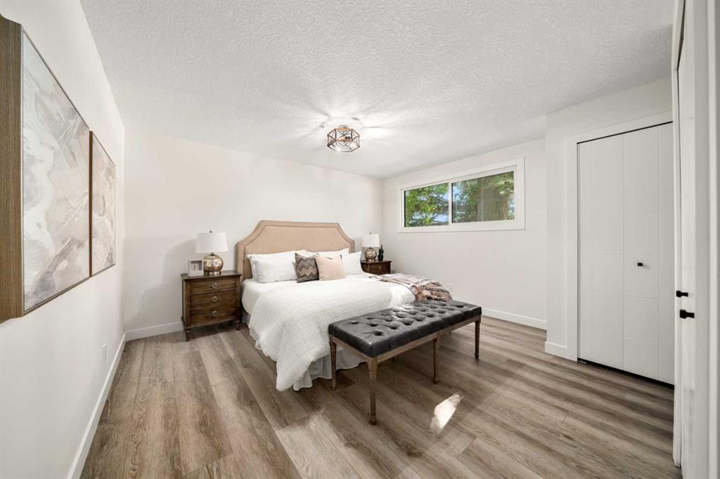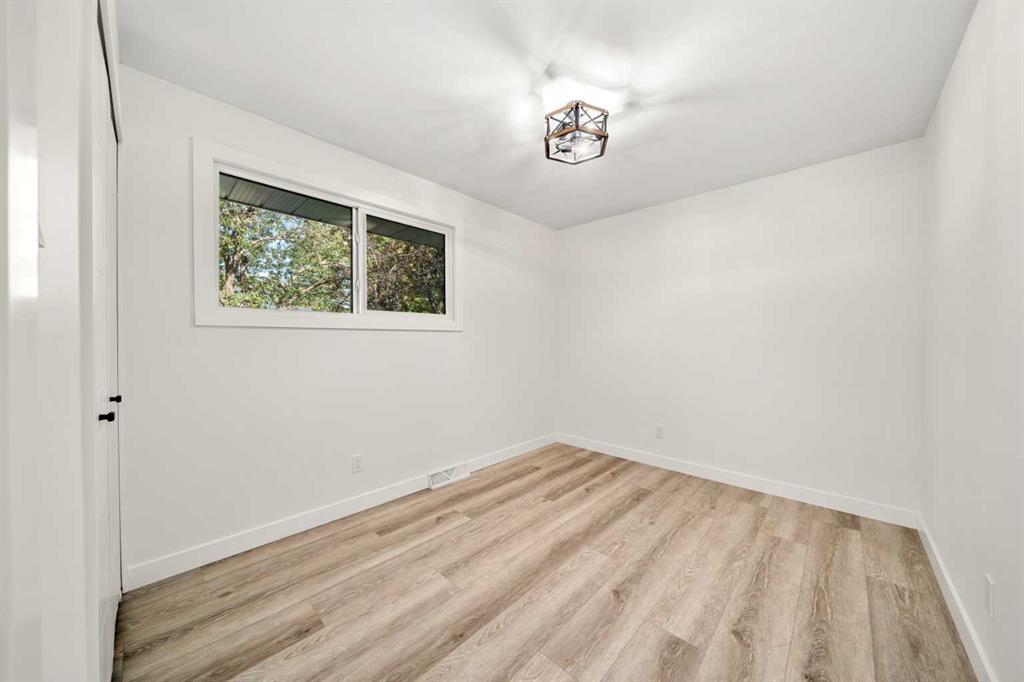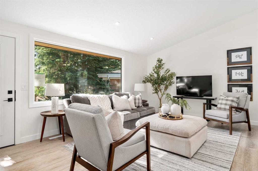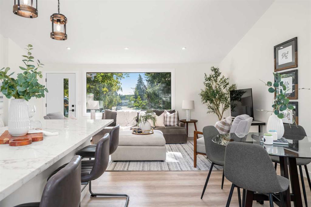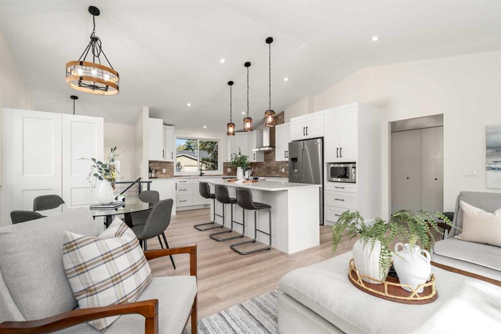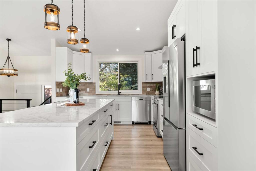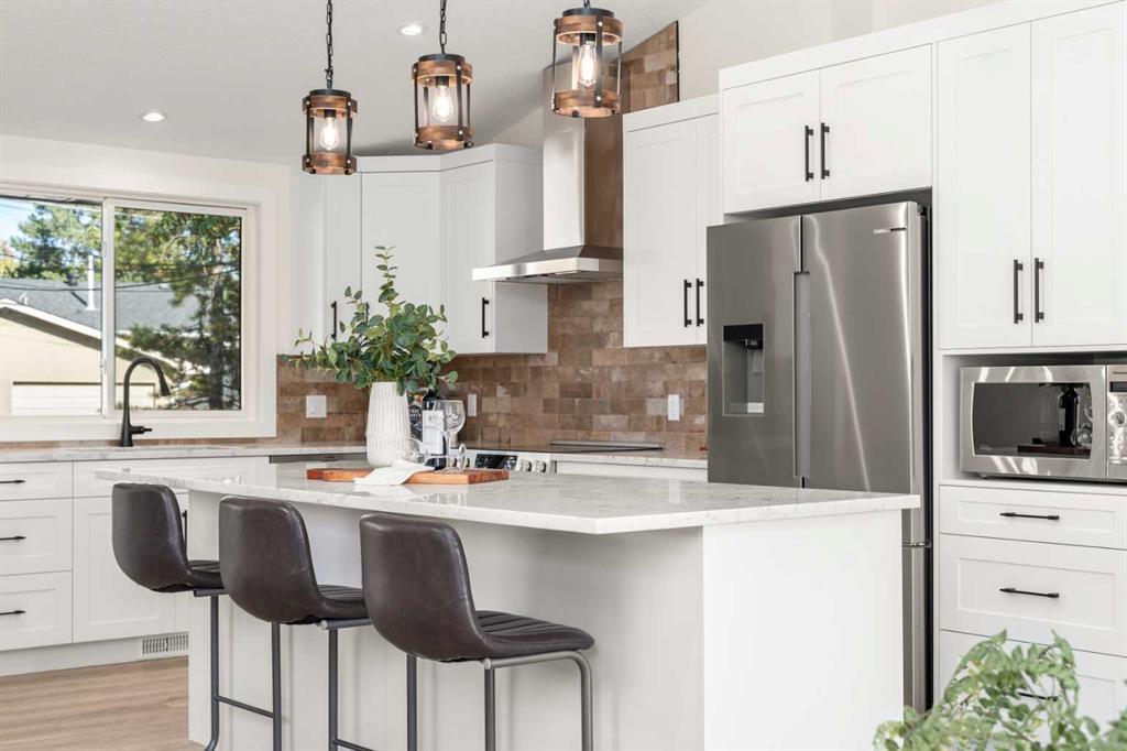 Welcome to BRENTWOOD, one of Calgary’s most beloved family communities, where this PERMITTED RENOVATION transforms a classic bungalow into a modern retreat. Set on a MASSIVE PIE LOT surrounded by mature trees, this residence combines mid-century character with today’s luxury upgrades for a lifestyle that is both stylish and functional. The main floor opens under soaring CATHEDRAL CEILINGS, where a bright front living room looks onto a quiet street through oversized windows. Wide-plank LVP FLOORING runs throughout, enhancing the clean lines of the OPEN CONCEPT LAYOUT. The chef-inspired kitchen is anchored by a large island with flush eating bar, STAINLESS STEEL APPLIANCES with a chimney hood fan, full-height cabinetry, and a BRICK CERAMIC BACKSPLASH. A defined DINING AREA comfortably fits a family table, creating a natural gathering hub for everyday life. The separate sleeping quarters offers three bedrooms, including a spacious PRIMARY SUITE with dual closets and a SPA-LIKE ENSUITE featuring a floating dual vanity and stand-up shower. Two additional bedrooms and a 4pc main bath with soaker tub complete this level, while a handy laundry chute adds convenience for busy families. Downstairs, the FULLY DEVELOPED BASEMENT offers incredible versatility with a large rec room designed for movie nights and games, plus the flexibility to convert part of the space into a 5th bedroom thanks to an existing egress window. this level also includes a 4th bedroom with walk-in closet, a modern 3pc bath with stand-up shower, dedicated laundry room, and abundant storage. Outdoors, the landscaped yard is a true retreat. An EXTERIOR BRICK FIREPLACE adds timeless charm for evenings under the trees, while a COVERED PATIO offers space to barbeque and unwind in every season. With room for a vegetable garden, a shed for storage, and plenty of green space for kids to play, this lot is both beautiful and functional. The DOUBLE DETACHED GARAGE IS INSULATED, HEATED, and features a new door and opener, offering winter comfort and year-round utility. Families will love the walkable proximity to MULTIPLE LEVELS OF SCHOOLING, the UNIVERSITY OF CALGARY, BRENTWOOD LRT STATION, the public library, shopping centres, and community recreation. Nature enthusiasts will appreciate being just minutes from NOSE HILL PARK, one of Calgary’s largest green spaces. This renovated bungalow delivers the design quality of a modern luxury home while preserving the warmth of a family-friendly Brentwood location!