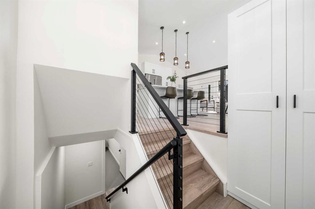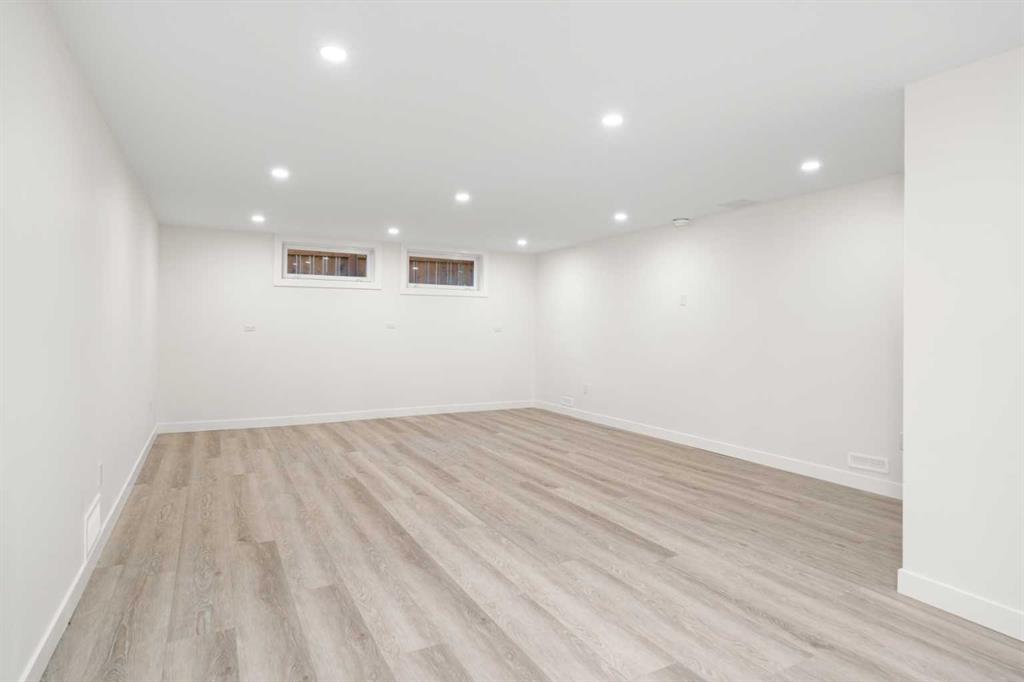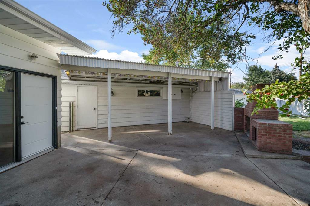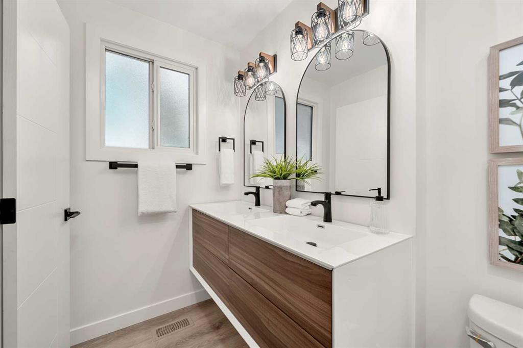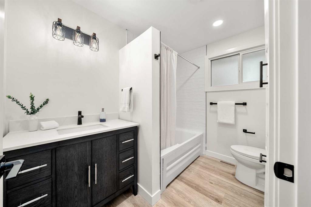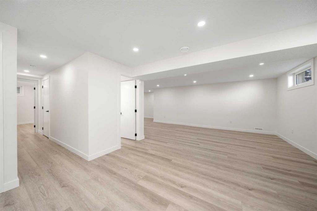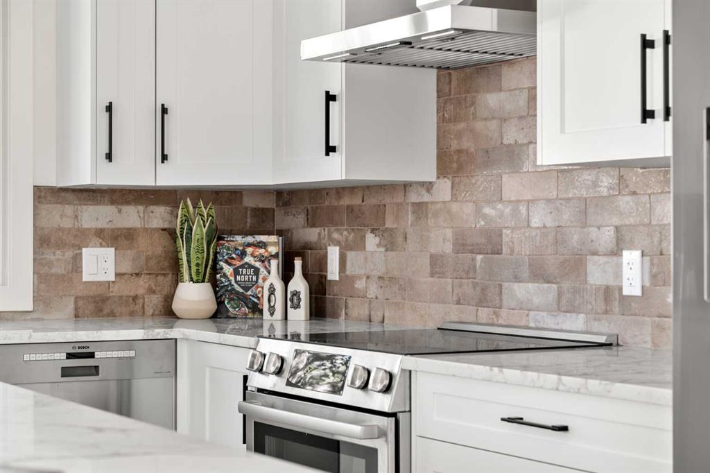 Welcome to BRENTWOOD, one of Calgary’s most beloved family communities, where this PERMITTED RENOVATION transforms a classic bungalow into a modern retreat. Set on a MASSIVE PIE LOT surrounded by mature trees, this residence combines mid-century character with today’s luxury upgrades for a lifestyle that is both stylish and functional. The main floor opens under soaring CATHEDRAL CEILINGS, where a bright front living room looks onto a quiet street through oversized windows. Wide-plank LVP FLOORING runs throughout, enhancing the clean lines of the OPEN CONCEPT LAYOUT. The chef-inspired kitchen is anchored by a large island with flush eating bar, STAINLESS STEEL APPLIANCES with a chimney hood fan, full-height cabinetry, and a BRICK CERAMIC BACKSPLASH. A defined DINING AREA comfortably fits a family table, creating a natural gathering hub for everyday life. The separate sleeping quarters offers three bedrooms, including a spacious PRIMARY SUITE with dual closets and a SPA-LIKE ENSUITE featuring a floating dual vanity and stand-up shower. Two additional bedrooms and a 4pc main bath with soaker tub complete this level, while a handy laundry chute adds convenience for busy families. Downstairs, the FULLY DEVELOPED BASEMENT offers incredible versatility with a large rec room designed for movie nights and games, plus the flexibility to convert part of the space into a 5th bedroom thanks to an existing egress window. this level also includes a 4th bedroom with walk-in closet, a modern 3pc bath with stand-up shower, dedicated laundry room, and abundant storage. Outdoors, the landscaped yard is a true retreat. An EXTERIOR BRICK FIREPLACE adds timeless charm for evenings under the trees, while a COVERED PATIO offers space to barbeque and unwind in every season. With room for a vegetable garden, a shed for storage, and plenty of green space for kids to play, this lot is both beautiful and functional. The DOUBLE DETACHED GARAGE IS INSULATED, HEATED, and features a new door and opener, offering winter comfort and year-round utility. Families will love the walkable proximity to MULTIPLE LEVELS OF SCHOOLING, the UNIVERSITY OF CALGARY, BRENTWOOD LRT STATION, the public library, shopping centres, and community recreation. Nature enthusiasts will appreciate being just minutes from NOSE HILL PARK, one of Calgary’s largest green spaces. This renovated bungalow delivers the design quality of a modern luxury home while preserving the warmth of a family-friendly Brentwood location!