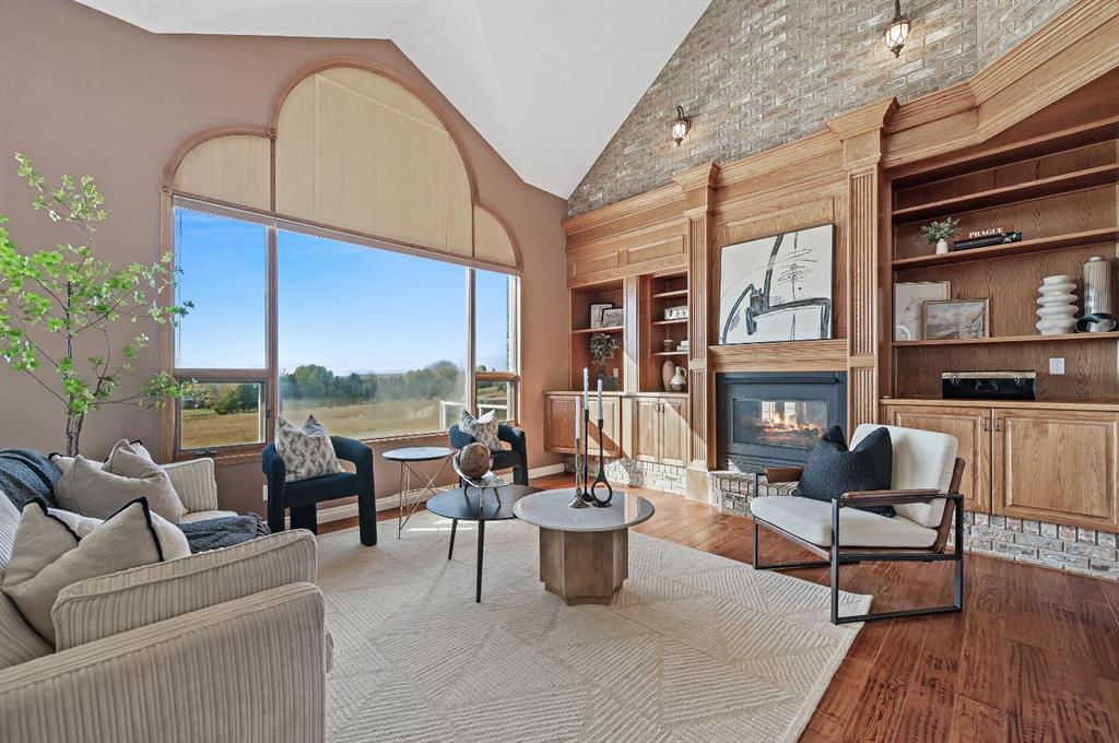 The moment you arrive, you’re greeted by a grand circular drive and timeless exterior that sets the tone for what lies inside. A barrel-vaulted entryway leads to an inviting open-concept layout, blending warm wood tones, soaring ceilings, and picture windows that frame the surrounding countryside.