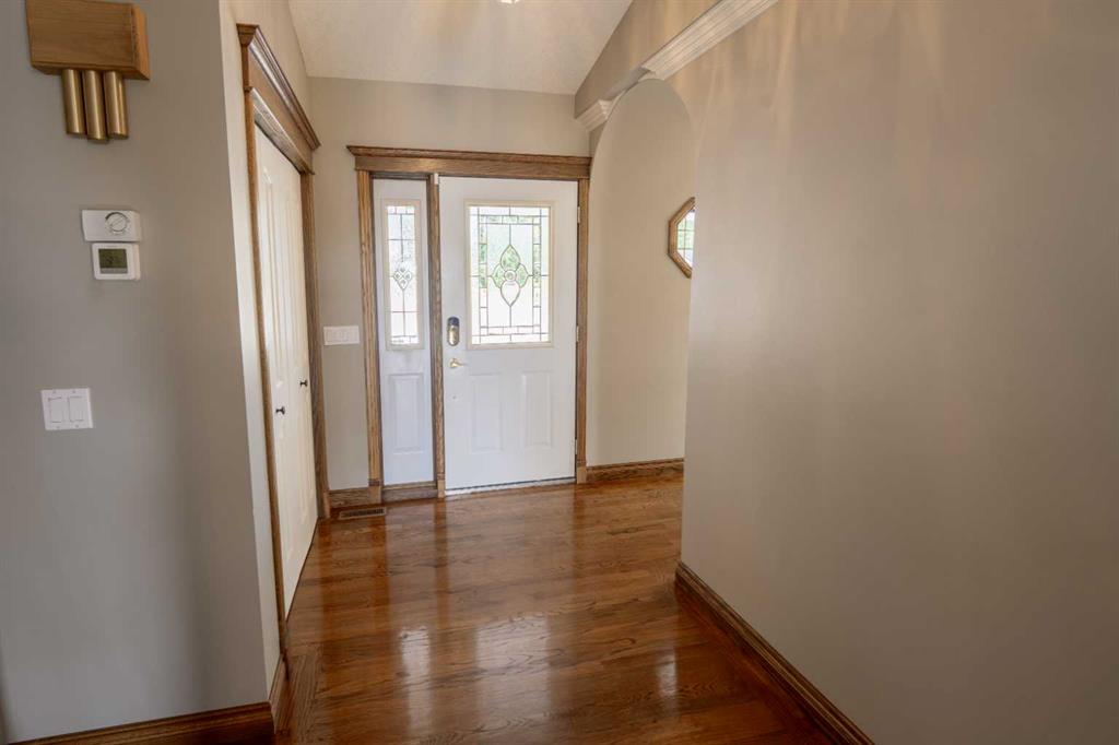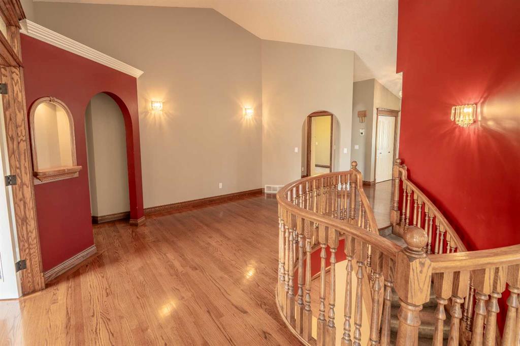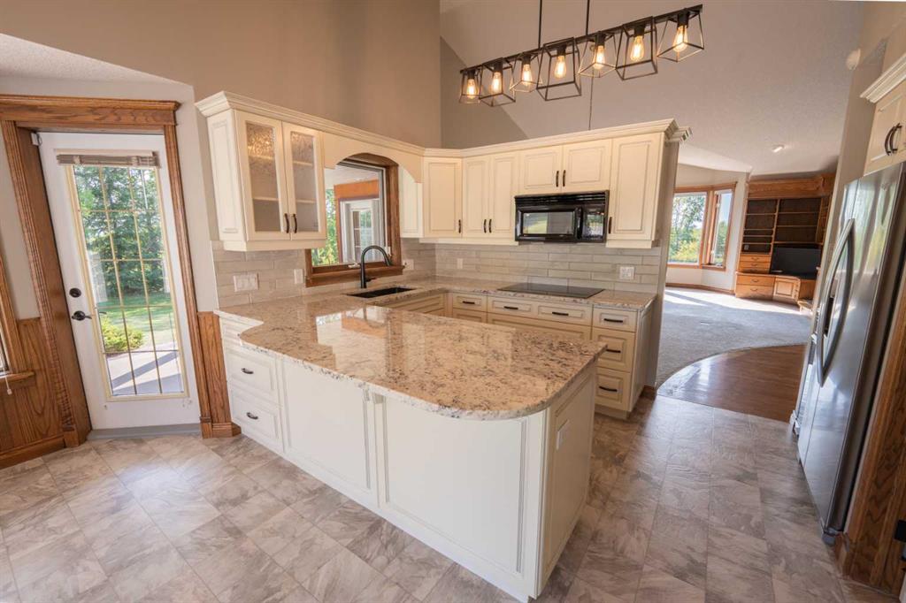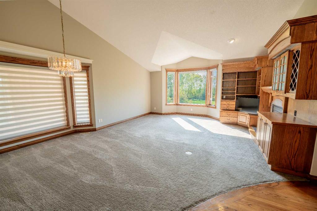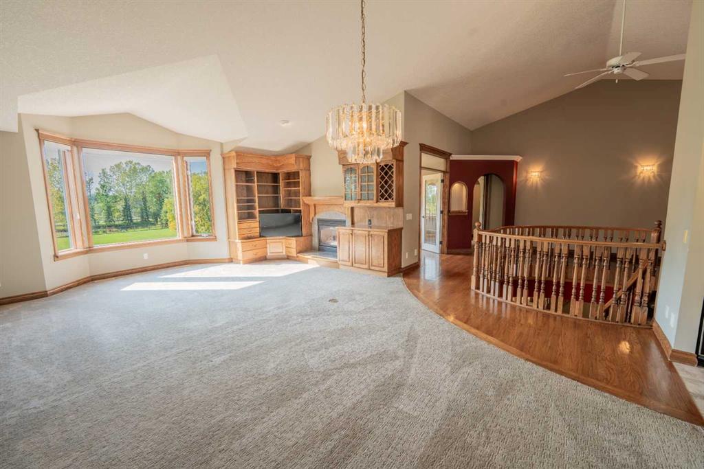 A gently curved driveway leads to the inviting wraparound front porch and ample guest parking. Inside, the spacious foyer opens to hardwood floors, soaring vaulted ceilings, and a beautifully designed living and dining area highlighted by a custom entertainment centre and a gas fireplace with mantle. The kitchen features a cozy breakfast nook, oversized pantry, and direct access to the wraparound deck—perfect for outdoor dining and barbecuing. An enclosed sunroom provides additional year-round enjoyment or the option of a greenhouse. The main level is complete with two generously sized bedrooms, including a comfortable primary retreat.