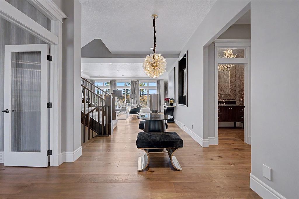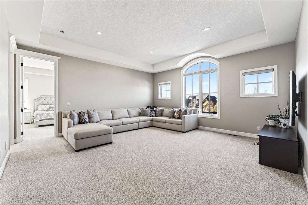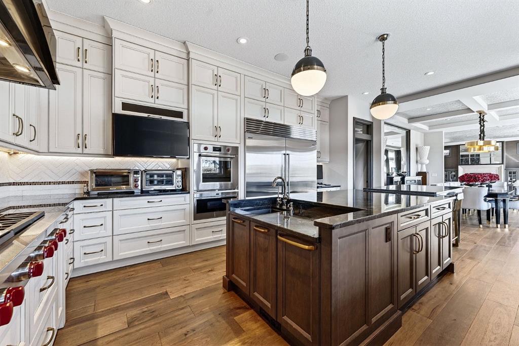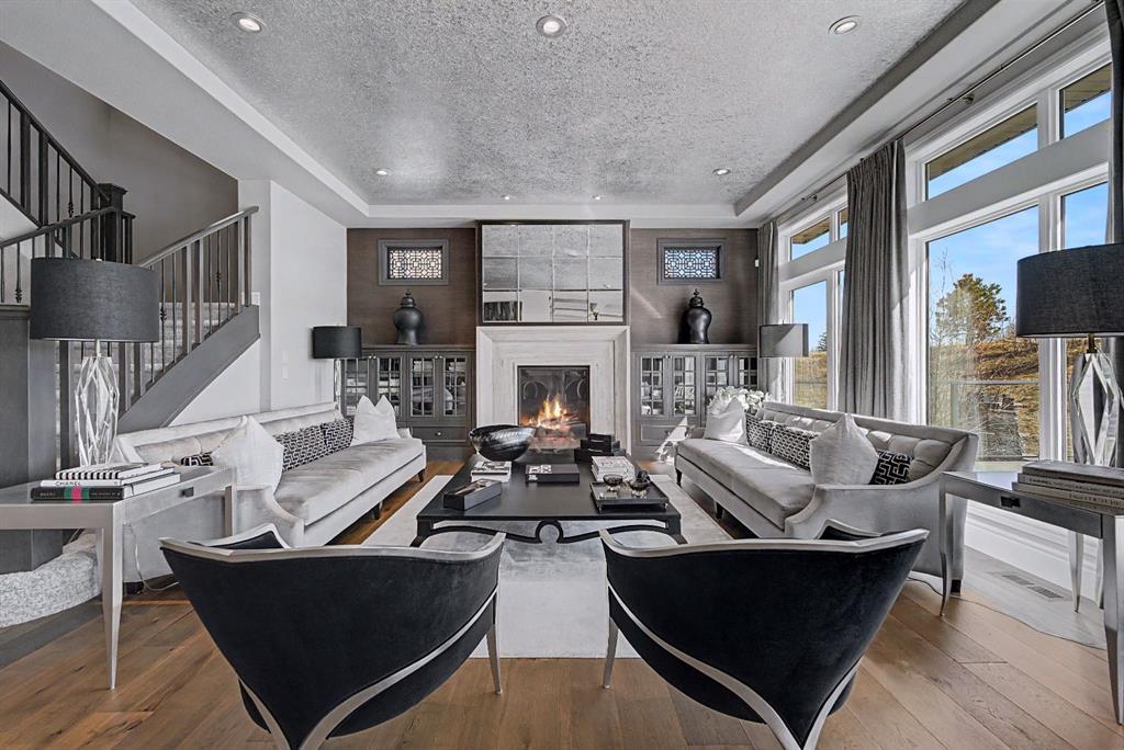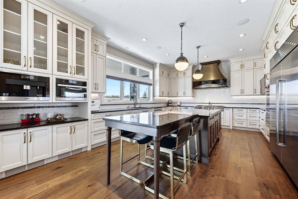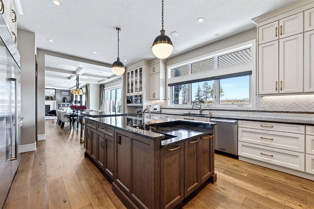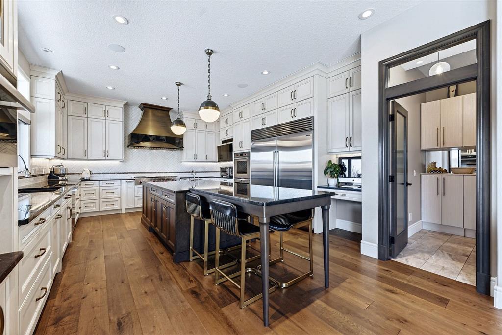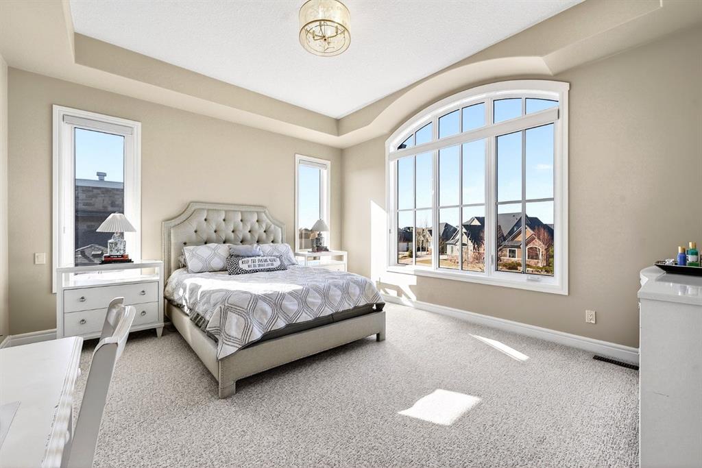 Welcome to this exceptional, never-before-listed luxury estate in Artesia at Heritage Pointe, proudly offered by its original owners, custom built by Albi, and professionally designed by James McIntyre, featuring over 6,122 sq ft of total living space. From the moment you enter, you are welcomed by a grand layout that seamlessly blends elegance and functionality, including a spacious executive office, a refined living area, and a stunning dining space anchored by a chef-inspired kitchen with an oversized island, premium finishes, and a generous walkthrough pantry with extensive built-ins for effortless organization. The main floor is completed by a thoughtfully designed mudroom with sink and a beautifully appointed powder room. Upstairs offers a rare and highly sought-after layout featuring three true primary bedroom suites, each thoughtfully designed for comfort and privacy, along with a versatile workspace, a bright central family area, and the convenience of an upper-level laundry. The main primary retreat is a showpiece, featuring a spa-inspired ensuite with a light therapy jetted tub, double-sided fireplace, an oversized walk-in shower with dual fixtures, and expansive his and hers walk-in closets and vanities. The fully developed walkout basement continues to impress with three additional bedrooms, including a fourth primary-style suite, two full bathrooms, a theatre room, home gym with cork flooring, a spacious recreation area, a second laundry, and an elegant bar with wine cellar. Outdoor living is equally remarkable with a full-width upper deck, a covered lower patio, rough-ins for a hot tub, and phantom screens, all backing onto a beautifully open setting that enhances the home’s sense of privacy and scale.