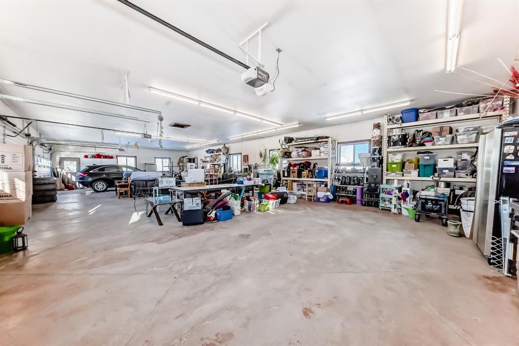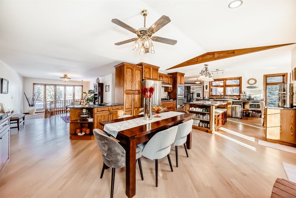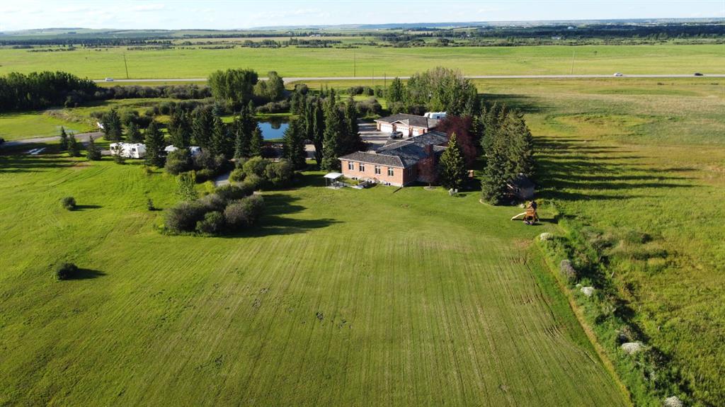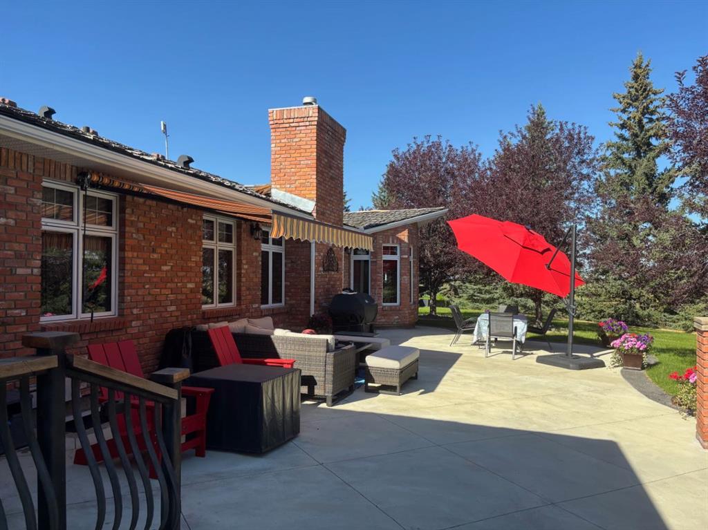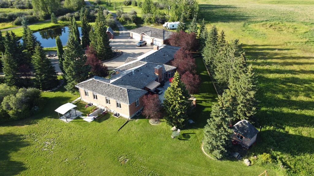 Welcome to this sprawling, solid brick, ranch-style bungalow nestled on 4 acres in coveted Springbank, 20 minutes from DT Calgary, offers 5 beds and 4.5 baths in over 6400 sqft of living space featuring an incredible 2100+ sqft 6 car garage w/ in-floor heating, a fully finished basement w/ two staircases. This luxury estate home is open plan and has unparalleled attention to detail including double, solid oak front doors, 10' ceilings, rich hardwood which was recently refinished in a white oak style (2024), and acid wash flooring welcome you upon arrival. This home is a classic gem made from the finest materials such as solid oak and acid wash flooring as you enter into the large sunken living room w/ in-floor heating, a two-sided real rundle stone wood-burning fireplace, a granite wet bar and double patio doors leading out to the large stamped concrete front patio. Kitchen boasts a huge granite-top island, a breakfast nook surrounded by walls of windows, new fridge, double wall oven, new dishwasher, gas cooktop, pantry with rolling shelves and leads out to the sandstone-coloured patio. The informal dining room is the perfect space for hosting family and friends w/ a brick wood-burning fireplace, stunning vaulted ceilings, a wet bar, wine storage to keep your favourites on hand, and patio doors leading out to the backyard patio. Fully renovated 4-piece ensuite w/ a free standing soaking tub w/ a view and large shower. The second bedroom also has 3 large windows solar blinds, darkening curtains as well as a large walk-in closet w/ a motion light and sliding door, a new 3-piece ensuite w/ a large window, and double patio doors that lead to a beautiful private patio w/ wrought iron and wood railings. All the windows have been replaced with triple pane, Low-E windows (2022). Lower level is entertainers dream w/ an enormous rec room w/ ton of seating space around the FP and space for a media unit plus three bedrooms (2 w/ large walk-in closets w/ laminate flooring and Low-E windows, solar blinds and darkening curtains), a laundry room, and third bedroom currently used as a storage room. Newer hot water tank, new washer and dryer, new high-pressure septic mound system including brand new pumps in septic tank and holding tank, two furnaces and a boiler for in floor heating, 4 electrical panels, and more in supplements. The addition of a concrete stairway (2024) has allowed for a walk-up feature leading out of the basement, perfect for older children still living at home, multi-generational households or an AirBnB suite. The basement has also been equipped with a kitchenette... Opportunities for small businesses abound in this property including: AirBnB which has successfully been run for two years, storage businesses in the oversized garage, trailer storage on the gravel pad. Extensive landscaping, three patios, a hot tub, private pond, and a pond-side enormous fire pit. Located in one of the most sought-after school districts in Alberta w/ easy access to the mountains.