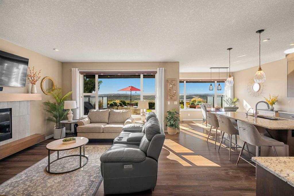 Step inside to discover a BRIGHT, OPEN-CONCEPT FLOOR PLAN designed to emphasize SPACE, LIGHT, AND COMFORT. The main level features SOARING CEILINGS and EXPANSIVE WINDOWS that frame the panoramic views. The warm and inviting LIVING ROOM centers around a GAS FIREPLACE, creating a cozy yet sophisticated atmosphere.