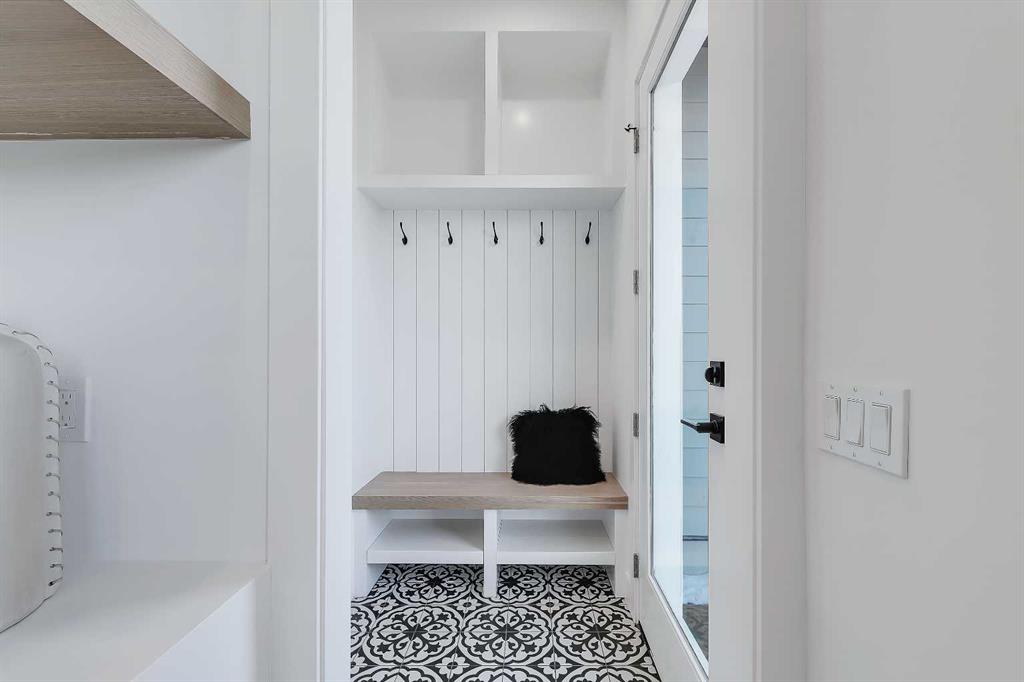 The main floor showcases a bright and open layout with a front dining area surrounded by large windows, filling the space with natural light. The central kitchen is thoughtfully designed with ceiling-height cabinetry, quartz countertops, a large island with seating, and modern lighting. A standout feature is the glassed-in office with a built-in workstation, perfect for working from home or a quiet study space. At the rear, the living room features a sleek fireplace with built-in shelving and oversized windows overlooking the backyard. A convenient mudroom with built-in storage connects to the yard, offering a practical everyday entry.