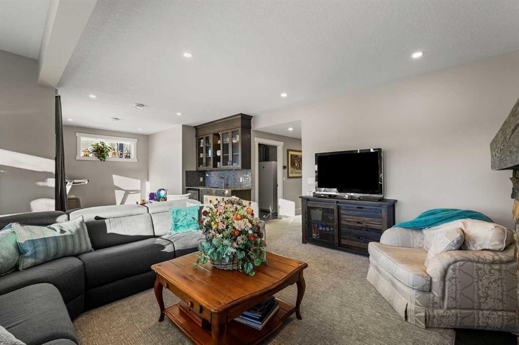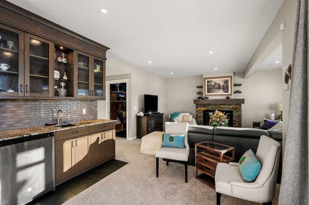The Walk Out Basement has been professionally developed with permit and is an absolute delight. The family room features large, wetland-facing windows and a beautiful fireplace that would be right at home in a Banff lodge. A custom Oak Wetbar features an exotic leathered granite counter and a perfect space for a work out corner or card table that steps out onto the covered lower patio, which features a second gas line connection. The basement also includes a large guest room and a stunning, top-of-the-line washroom with a fully tiled bath surround a nice deep tub, a quartz ledge, and a stunning custom vanity cabinet.