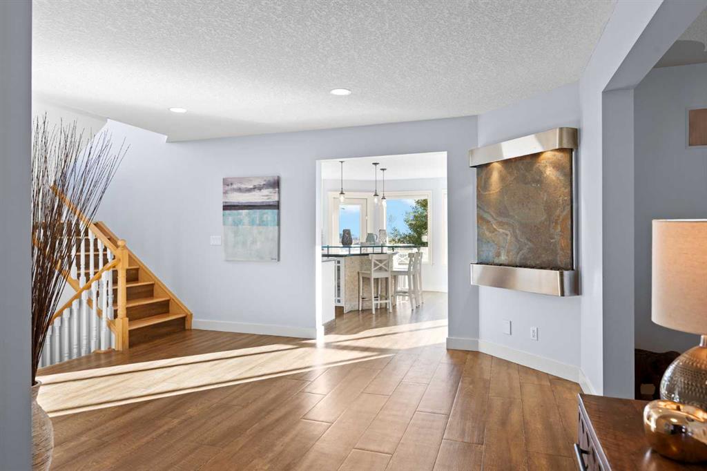 As you enter the grand foyer, you’re greeted by a tranquil spa-inspired water feature, setting the tone for the sophistication that follows. The main living area boasts soaring 17’ ceilings, a cozy gas fireplace, and vinyl plank flooring throughout, creating an airy and inviting atmosphere. The gourmet kitchen is a chef’s dream, featuring granite countertops, a large entertaining island, built-in fridge, and gas range. Step outside to the massive deck, fully updated in 2024, where you can take in sweeping views of Calgary’s skyline. Adding to the functionality of the main floor are a formal dining room, front sitting room/office, and laundry/ mud room area - that leads into the attached oversized double garage.