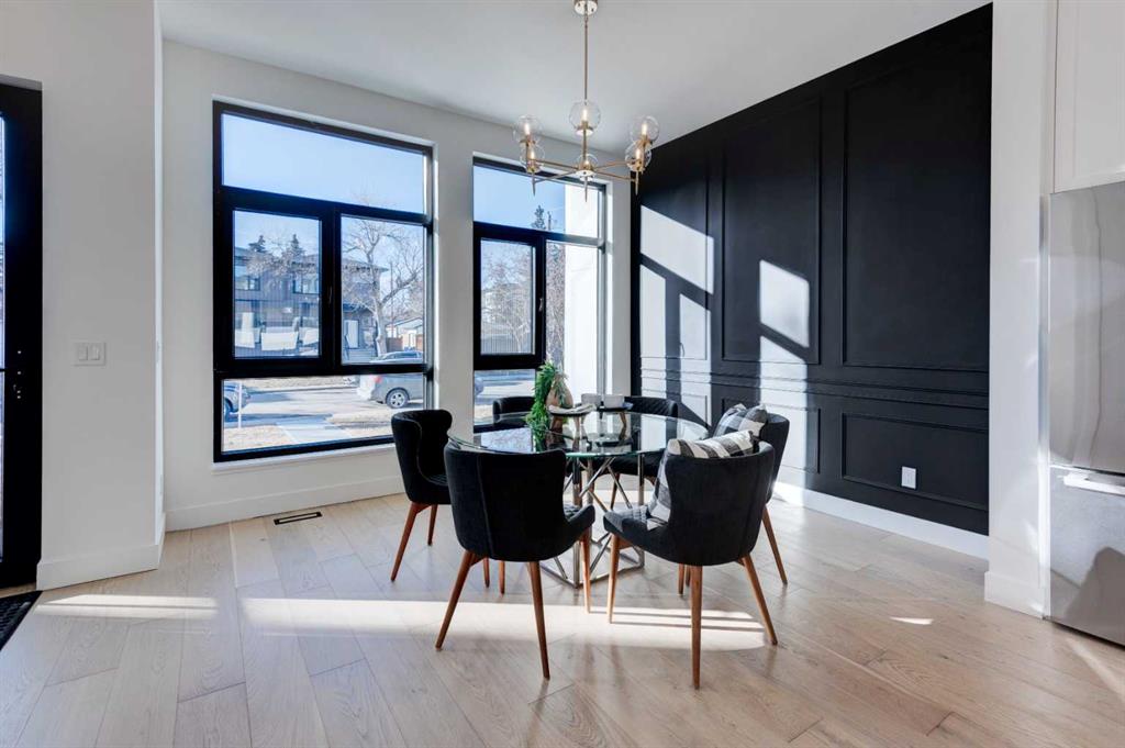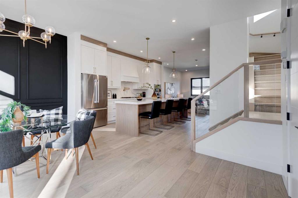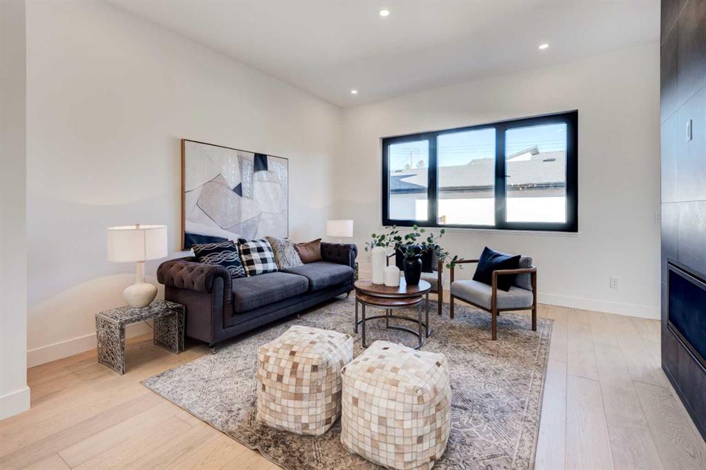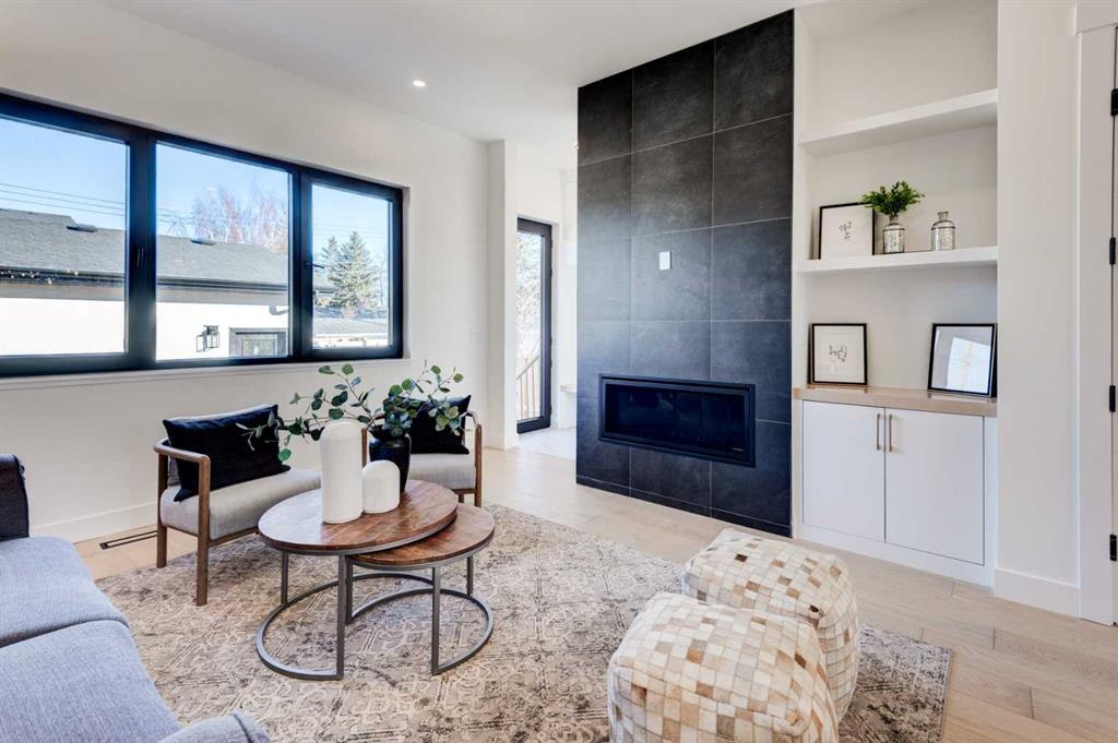 From the moment you arrive, the contemporary exterior design makes a strong first impression with clean architectural lines, large windows, and modern finishes that blend seamlessly into the neighborhood. The landscaped front approach welcomes you into a bright and functional interior designed for everyday living and entertaining. The main floor features a spacious open-concept layout and wide-plank engineered hardwood flooring that enhances the sense of space and warmth throughout. The front living area is highlighted by an elegant fireplace feature wall and oversized windows that allow natural light to pour in, creating an inviting atmosphere.