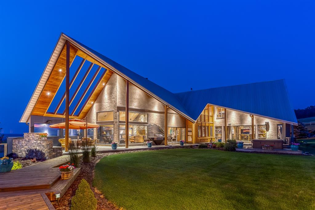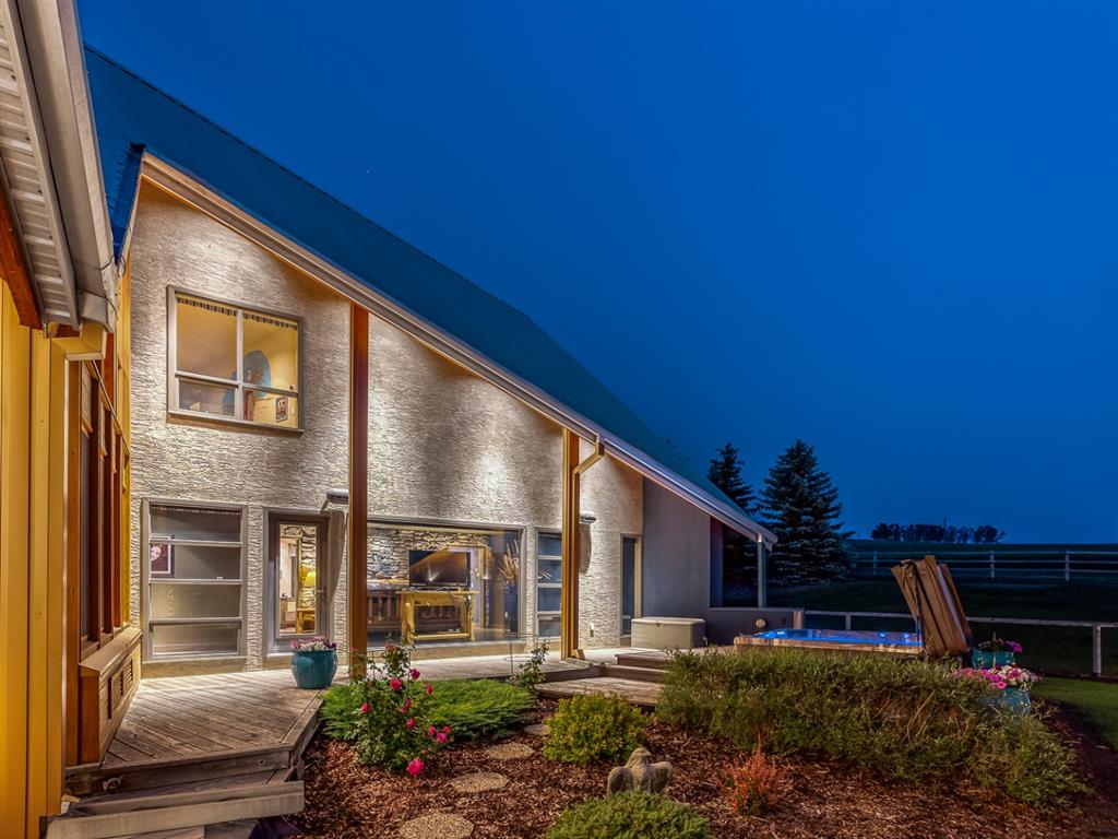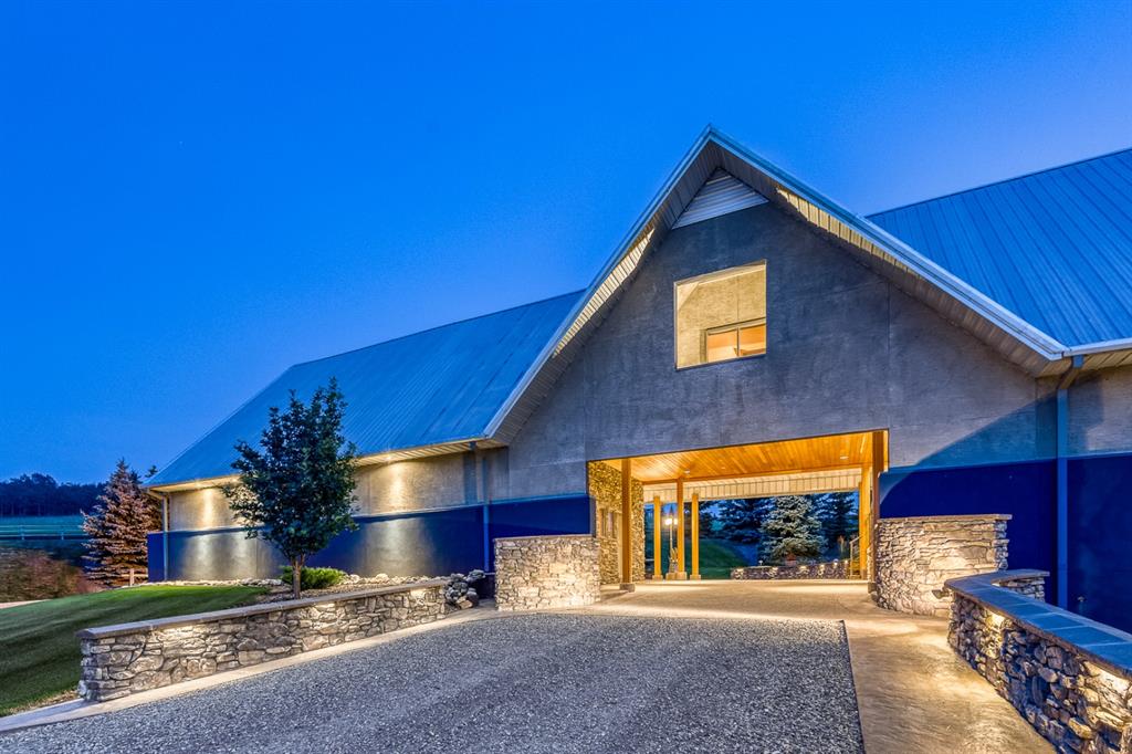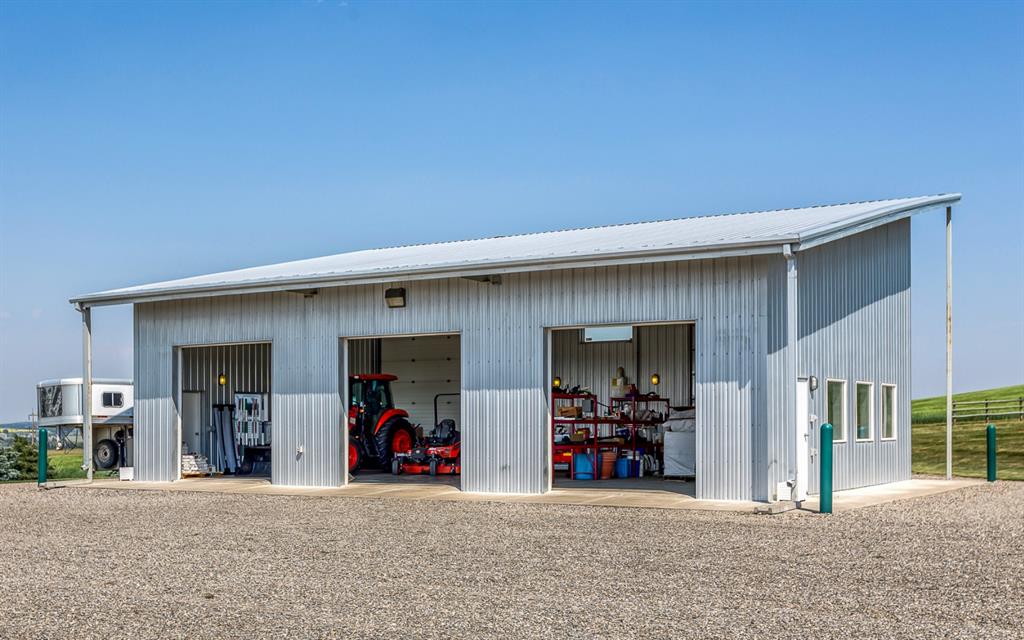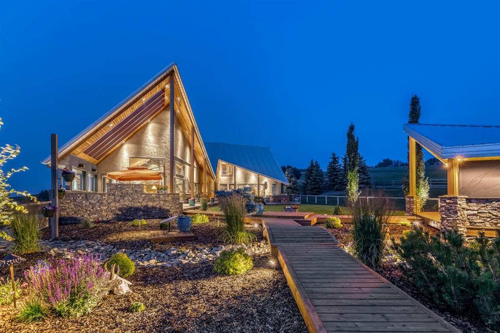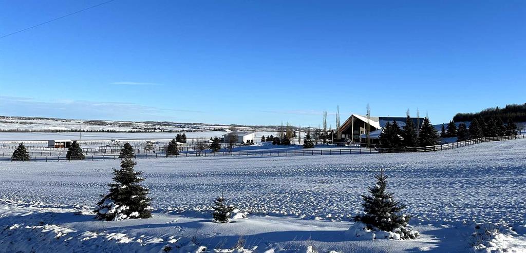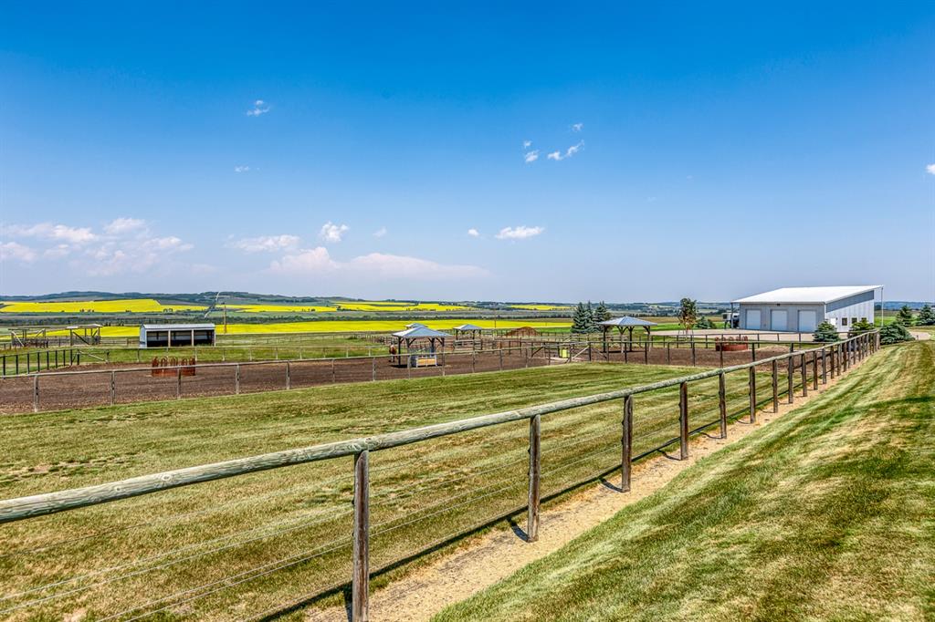 Simply spectacular this fully furnished original owner property features 5700 sq ft of developed living space. This gorgeous Jeremy Sturgess built & designed home sits on a scenic 65-acre plot just minutes west of Okotoks with the foothills framing a view of the Rockies. Reminiscent of a traditional alpine farmhouse complete with vehicle storage, stables & a tool shed all connected under a functional carriage way. The edgy design was purposeful in capturing the stunning 360-degree vistas from every room & unveils the patchwork of prairie fields rolling to meet the front ranges of the Rockies. The outdoor living space is sheltered behind the angular roof line perfectly protecting the courtyard area complete with a pavilion, hot tub, built in entertaining areas, gardens, pathways & surround sound speakers. Enter through the grand breezeway & prepare to be awed with the soaring vaulted ceilings & the cozy open/functional floor plan. On the main there are floor to ceiling windows meant to move the outside living space to the indoors & the grand stone double sided fireplace which separates the living room from the kitchen & eating spaces. Entertain in your gourmet kitchen with top-of-the-line appliances,10 ft Island, an abundance of counter & cabinet space & choose if you will dine along side the fireplace or in the Sunroom. The entire home features in-floor heat for our chilly winter nights. The private Master suite features views to the west, the pavilion & the outdoor living area. It features a luxurious ensuite, large walk-in closet & laundry. There is also a powder room & a large country mudroom to complete this level. Upstairs the 2 generous bedrooms feature work spaces with desks, Jack and Jill bathroom & one features a small tree house feel deck. Over looking the main floor past the willow handrails in the loft is a home office space, guest bedroom suite complete with living area & a full bath. At the end of the evening retreat downstairs to the Media room for a movie or entertain guests in the family/ games room. Pool, darts, poker & a cold beverage while enjoying your favorite sports on TV. The oversized triple garage has been transformed into the ultimate car enthusiast retreat with heated epoxy floors, custom cabinets & more. Outside attached through the carriage way is a heated 5 stall barn with rubber mats, waterers, loft, feed room, tack room & wash bay. There is an outdoor 125 x 250 ft sand ring for riding & all the grass & sand paddocks with shelters your horse’s hearts desire. With 55+ acres in crop and the horse paddocks newly seeded to perfect horse grass mixture the property could be close to self sustaining. The heated drive through 1500 sq ft shop has been designed to accommodate all equipment, feed, delivery trucks & supplies. Extensive irrigated landscaping allows for perfectly manicured grounds all around the home which is completely fenced with post & rail electric fencing. Simply Exquisite , just bring your suitcase and your animals !!!