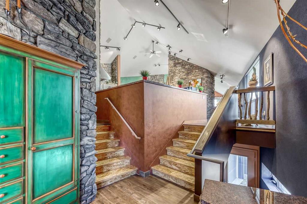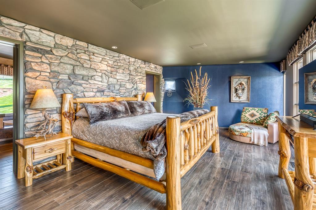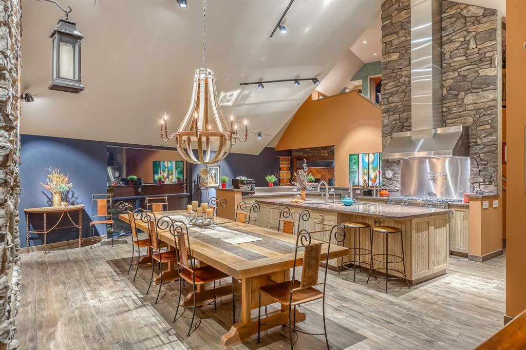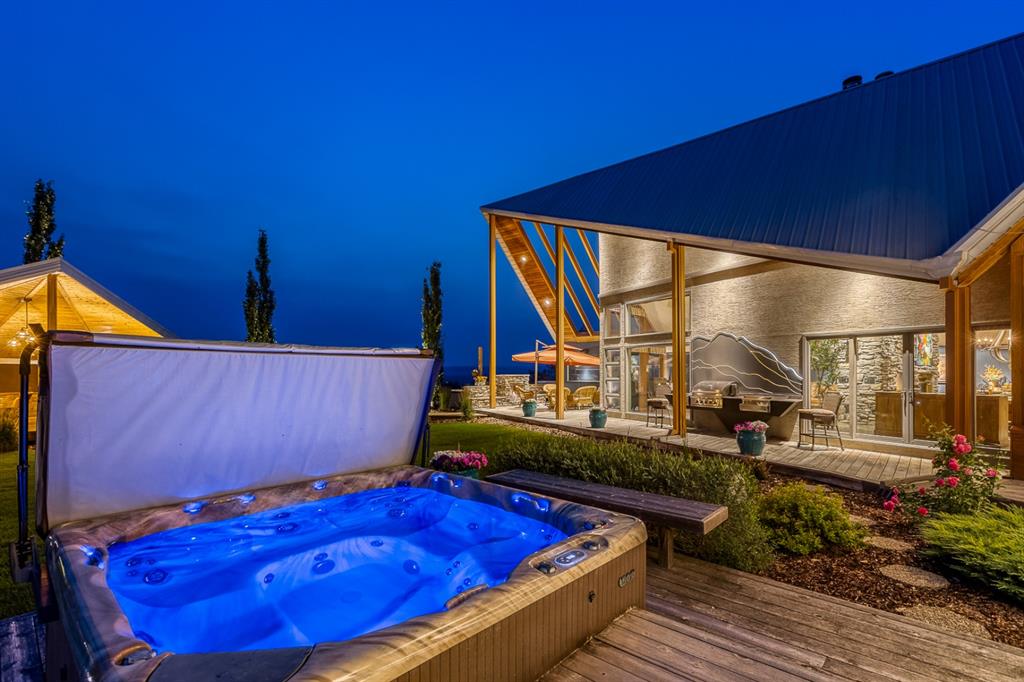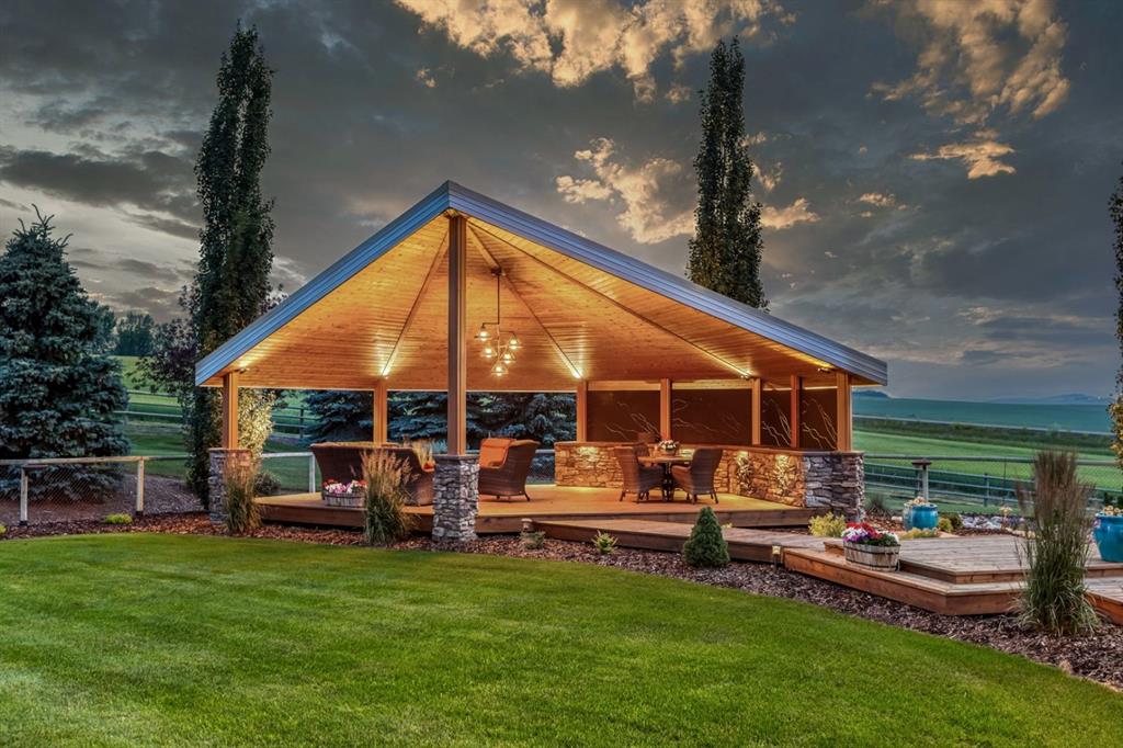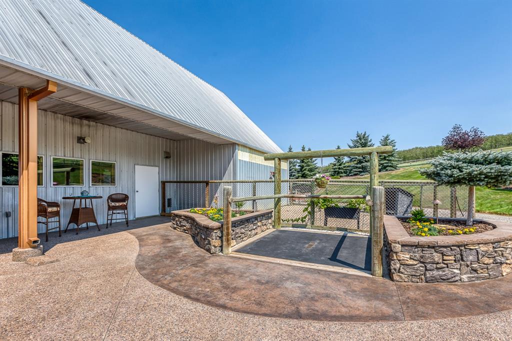 Simply spectacular this fully furnished original owner property features 5700 sq ft of developed living space. This gorgeous Jeremy Sturgess built & designed home sits on a scenic 65-acre plot just minutes west of Okotoks with the foothills framing a view of the Rockies. Reminiscent of a traditional alpine farmhouse complete with vehicle storage, stables & a tool shed all connected under a functional carriage way. The edgy design was purposeful in capturing the stunning 360-degree vistas from every room & unveils the patchwork of prairie fields rolling to meet the front ranges of the Rockies. The outdoor living space is sheltered behind the angular roof line perfectly protecting the courtyard area complete with a pavilion, hot tub, built in entertaining areas, gardens, pathways & surround sound speakers. Enter through the grand breezeway & prepare to be awed with the soaring vaulted ceilings & the cozy open/functional floor plan. On the main there are floor to ceiling windows meant to move the outside living space to the indoors & the grand stone double sided fireplace which separates the living room from the kitchen & eating spaces. Entertain in your gourmet kitchen with top-of-the-line appliances,10 ft Island, an abundance of counter & cabinet space & choose if you will dine along side the fireplace or in the Sunroom. The entire home features in-floor heat for our chilly winter nights. The private Master suite features views to the west, the pavilion & the outdoor living area. It features a luxurious ensuite, large walk-in closet & laundry. There is also a powder room & a large country mudroom to complete this level. Upstairs the 2 generous bedrooms feature work spaces with desks, Jack and Jill bathroom & one features a small tree house feel deck. Over looking the main floor past the willow handrails in the loft is a home office space, guest bedroom suite complete with living area & a full bath. At the end of the evening retreat downstairs to the Media room for a movie or entertain guests in the family/ games room. Pool, darts, poker & a cold beverage while enjoying your favorite sports on TV. The oversized triple garage has been transformed into the ultimate car enthusiast retreat with heated epoxy floors, custom cabinets & more. Outside attached through the carriage way is a heated 5 stall barn with rubber mats, waterers, loft, feed room, tack room & wash bay. There is an outdoor 125 x 250 ft sand ring for riding & all the grass & sand paddocks with shelters your horse’s hearts desire. With 55+ acres in crop and the horse paddocks newly seeded to perfect horse grass mixture the property could be close to self sustaining. The heated drive through 1500 sq ft shop has been designed to accommodate all equipment, feed, delivery trucks & supplies. Extensive irrigated landscaping allows for perfectly manicured grounds all around the home which is completely fenced with post & rail electric fencing. Simply Exquisite , just bring your suitcase and your animals !!!