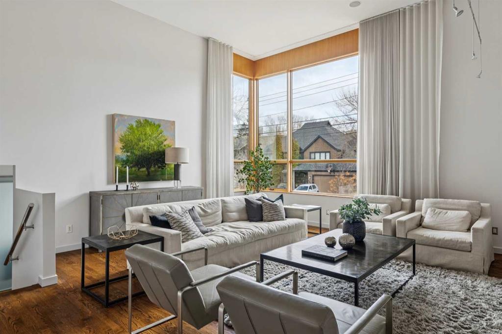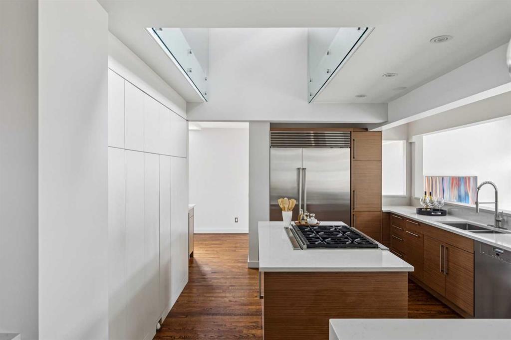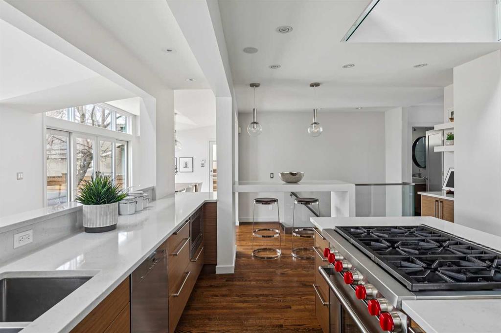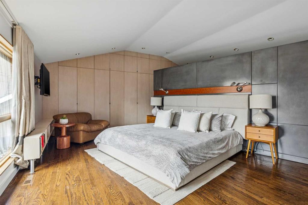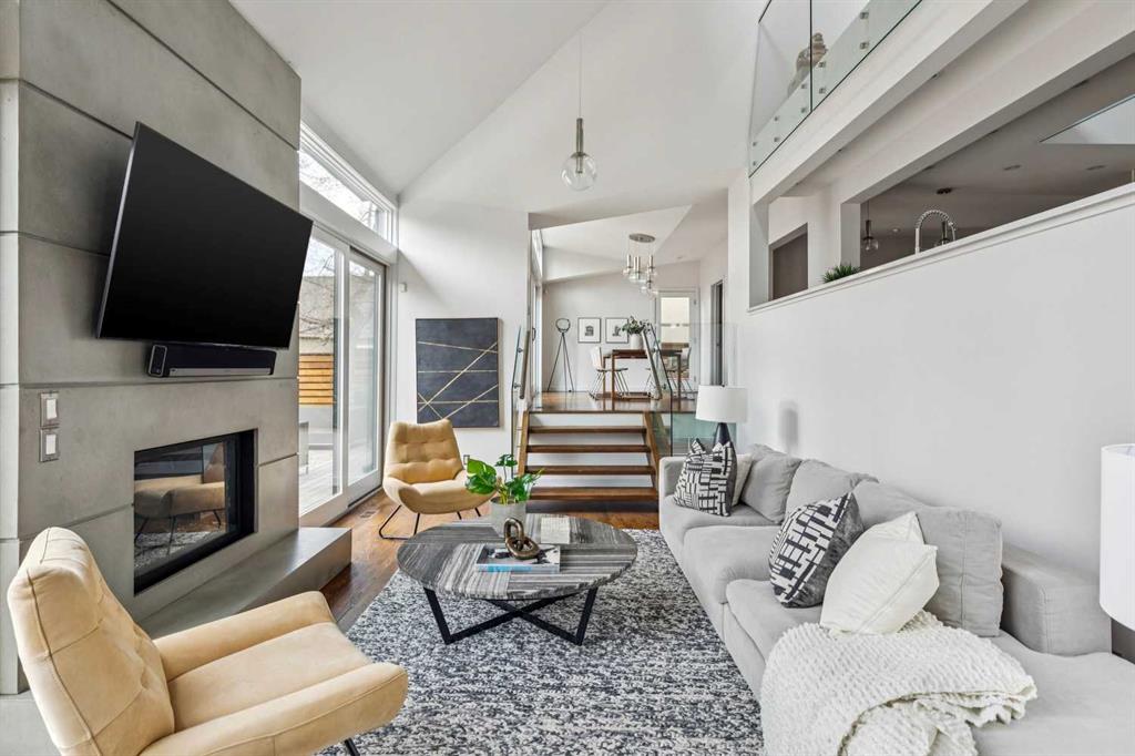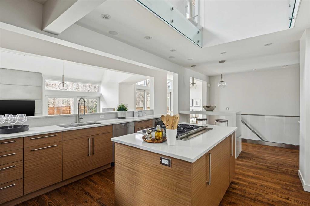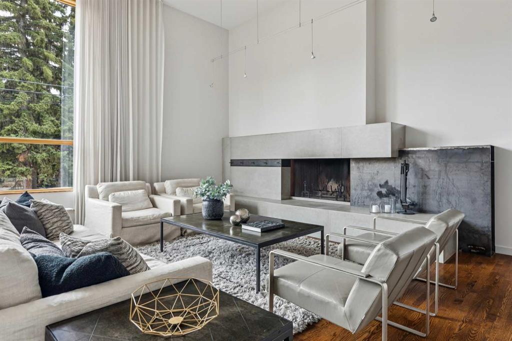 Open house Saturday April 25 2:30–4 pm. One of a kind two story executive family home in prime East Elbow Park location offering over 4000 square feet above grade, a total of 5 bedrooms, double attached garage + beautiful sunny west facing backyard. This modernist home features an intriguing layout + expansive principal rooms throughout. The elevated living room showcases soaring ceilings + a striking concrete framed wood-burning fireplace, while the formal dining room provides an impressive space for entertaining. At the front of the home, a comfortable self-contained sitting room/den with sliding glass doors offers a private designated space away from the hub of the house. The chef’s kitchen, renovated approximately 10 years ago, is well laid out with professional appliance, an island, abundant storage + overlooks the sunken family room which along with the large informal dining area are filled with natural light from a wall of windows + patio doors that open onto the private west facing backyard complete with deck + mature trees. To complete the main floor there is a cheery laundry room with added storage + an added feature of a main floor bedroom with easy access to a 3-piece bath that adds versatility to the property. Upstairs, four generously sized bedrooms are all ensuited . The primary suite is a standout with a floating concrete + cherry wall, an efficient closet system, a well-appointed ensuite + its own private office space. The exterior offers strong contemporary curb appeal with newer finishes completed in 2024 + a welcoming glass entry. Additional features include a double heated attached garage with epoxy flooring, large mudroom with extra storage, developed lower level (renovated in 2024) + newer rear windows. Ideally located on a very quiet street that is within walking distance to all levels of schools, 4th Street shopping, the pathway system + the Glencoe Club. A rare opportunity to own a distinctive architectural home in one of Calgary’s most sought-after neighborhoods.