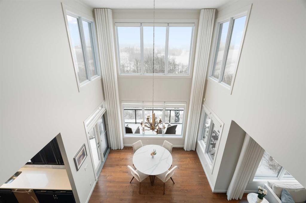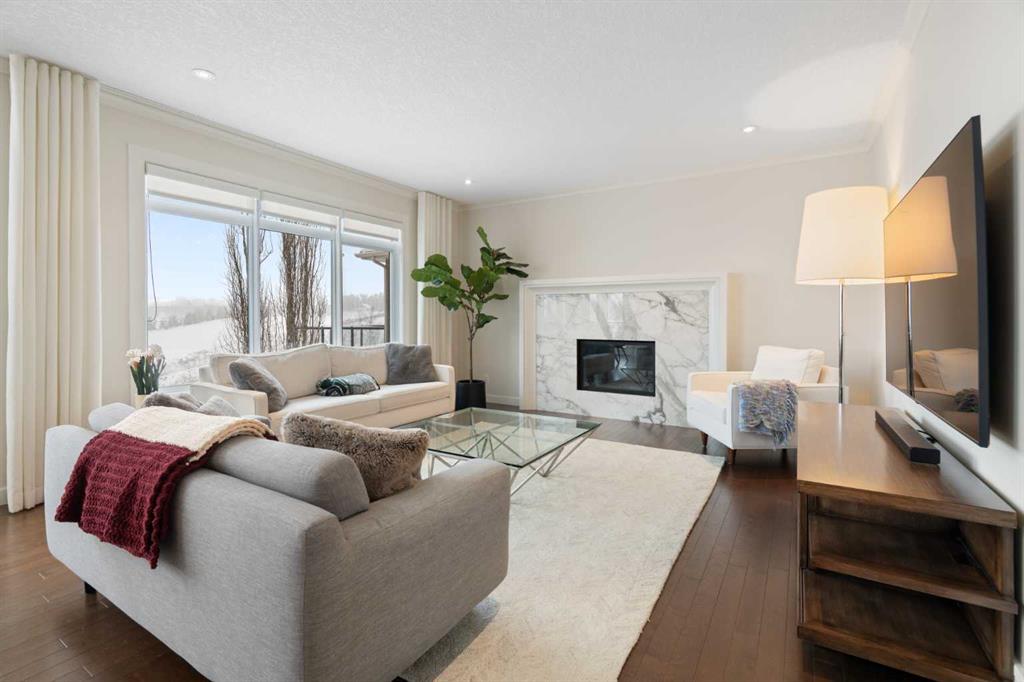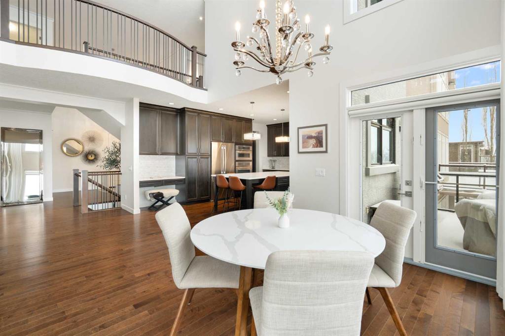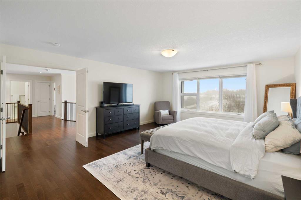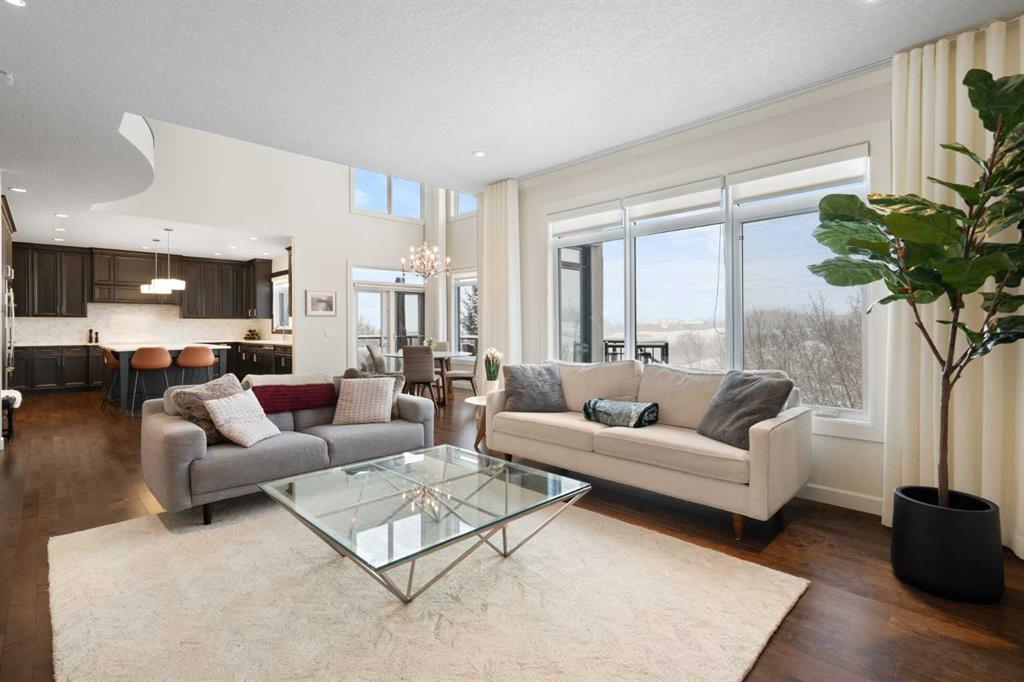 Soaring ceilings and a grand foyer set the tone, while floor-to-vaulted-ceiling windows in the breakfast nook flood the main level with natural light and frame the view. The chef-inspired kitchen features timeless white quartz countertops, stainless steel appliances, custom cabinetry, a large island for gathering, and a walk-through butler’s pantry connecting directly to the formal dining room—perfect for effortless entertaining.This home’s open layout flows into the living room, anchored by a sophisticated gas fireplace, creating an inviting space for both quiet evenings and hosting guests. From the breakfast nook, step out onto the expansive upper deck with a gas line for BBQ, ideal for enjoying warm evenings and the sweeping west-facing views. A private office/den, 2-piece powder room, and a functional mudroom complete the main floor with direct access to the triple attached garage featuring epoxy flooring and slat-wall organization.
