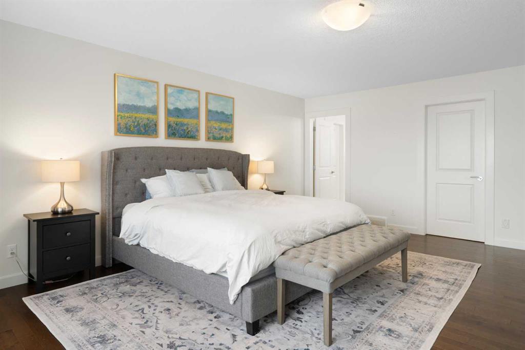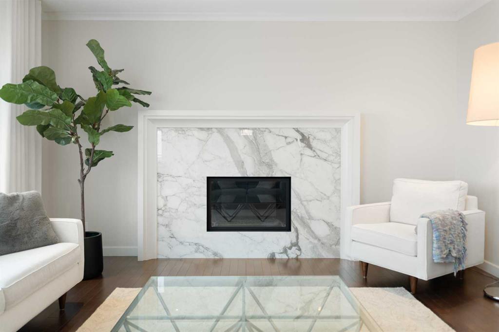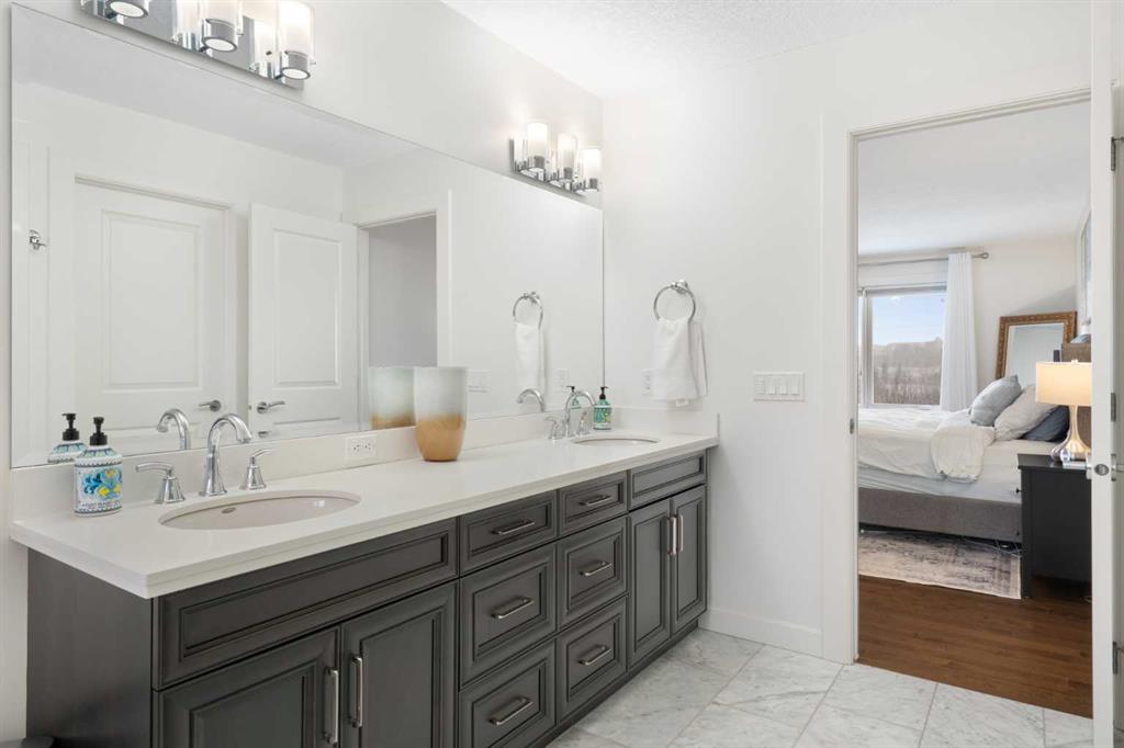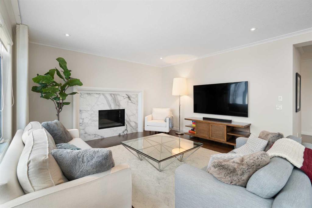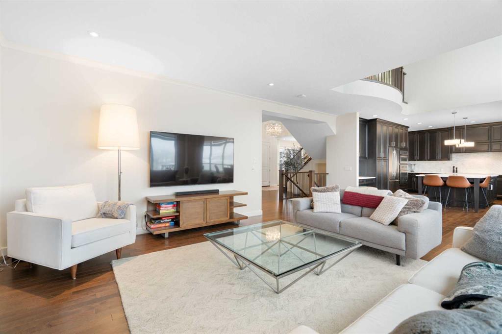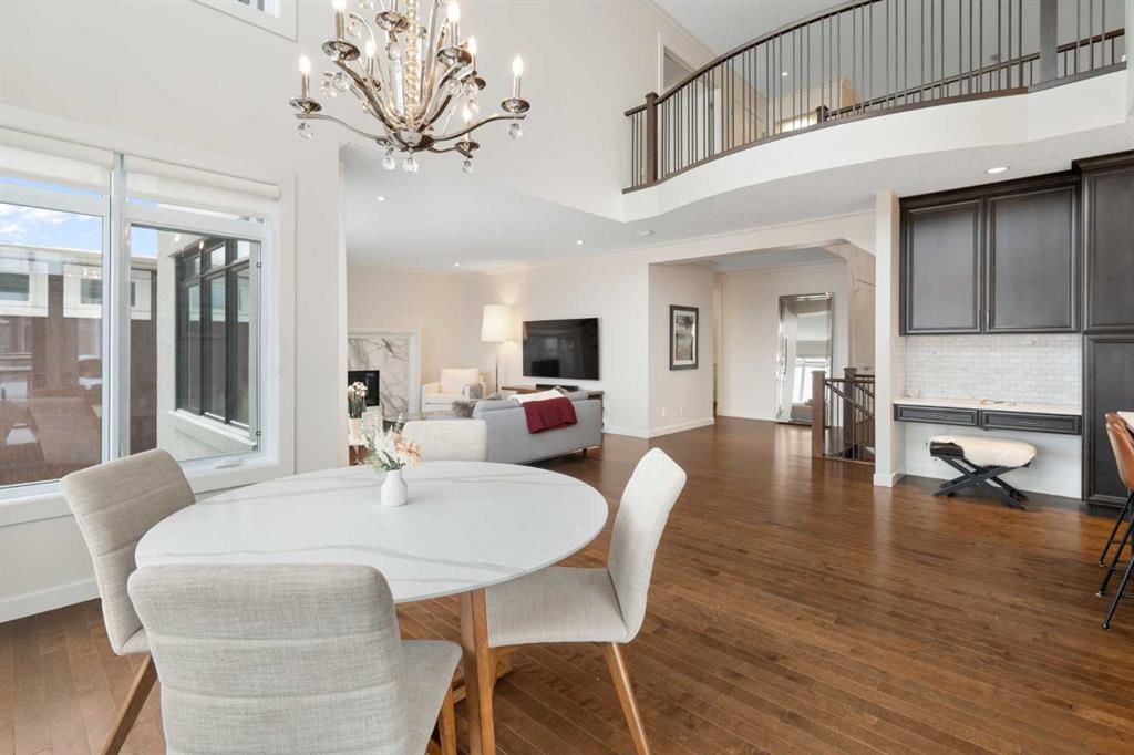 Soaring ceilings and a grand foyer set the tone, while floor-to-vaulted-ceiling windows in the breakfast nook flood the main level with natural light and frame the view. The chef-inspired kitchen features timeless white quartz countertops, stainless steel appliances, custom cabinetry, a large island for gathering, and a walk-through butler’s pantry connecting directly to the formal dining room—perfect for effortless entertaining.This home’s open layout flows into the living room, anchored by a sophisticated gas fireplace, creating an inviting space for both quiet evenings and hosting guests. From the breakfast nook, step out onto the expansive upper deck with a gas line for BBQ, ideal for enjoying warm evenings and the sweeping west-facing views. A private office/den, 2-piece powder room, and a functional mudroom complete the main floor with direct access to the triple attached garage featuring epoxy flooring and slat-wall organization.