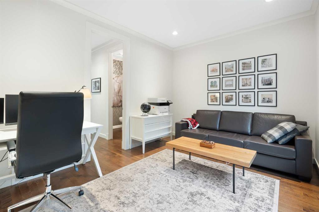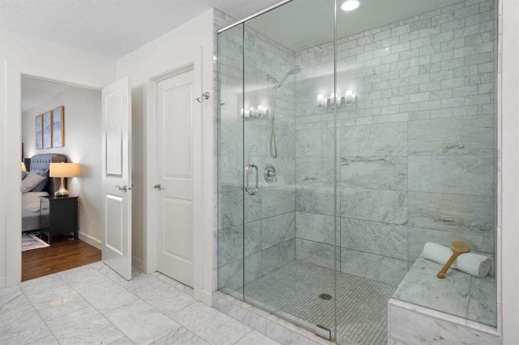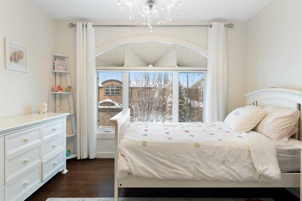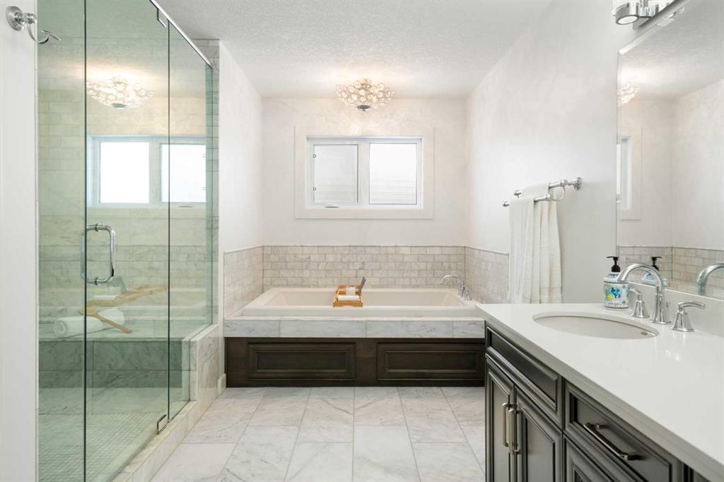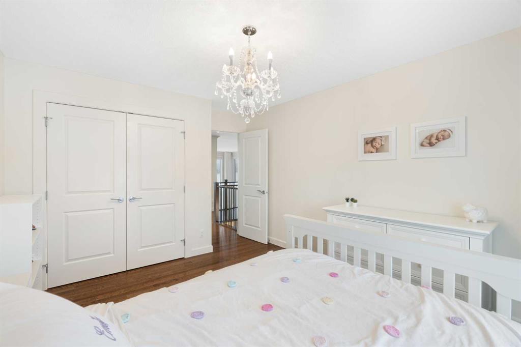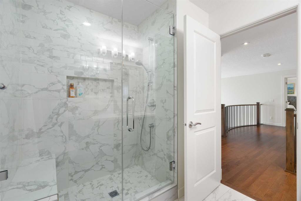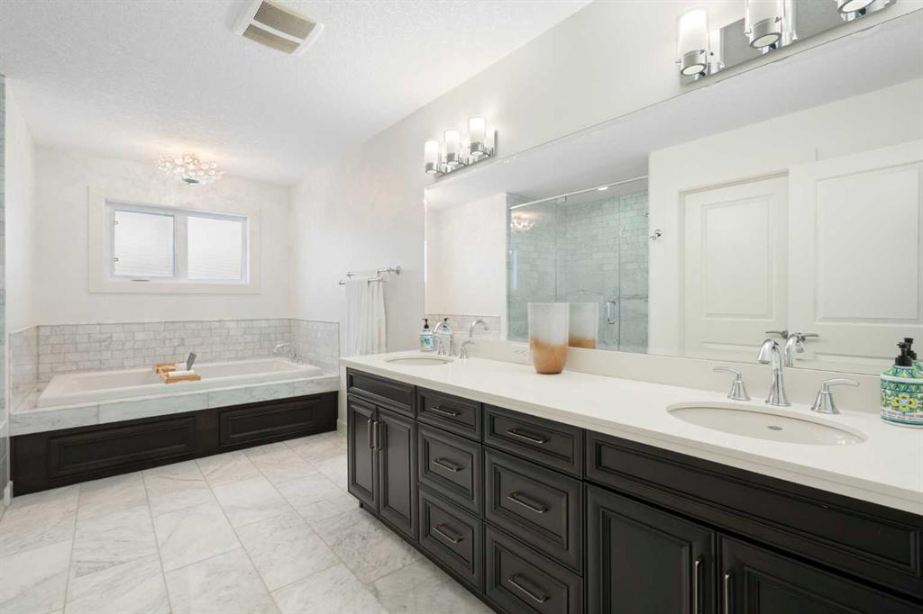 Upstairs, the primary suite occupies its own private wing, creating a true retreat. A walkway overlooking both the grand foyer and the kitchen below leads to the separate wing where the two additional generously sized bedrooms are located. The primary suite features a spa-inspired 5-piece ensuite with dual vanities, private WC, standalone shower, and deep soaker tub, along with a walk-in closet complete with custom built-ins. A 4-piece bathroom and upper-level laundry room add comfort and convenience, while central air conditioning ensures comfort throughout the warmer months.