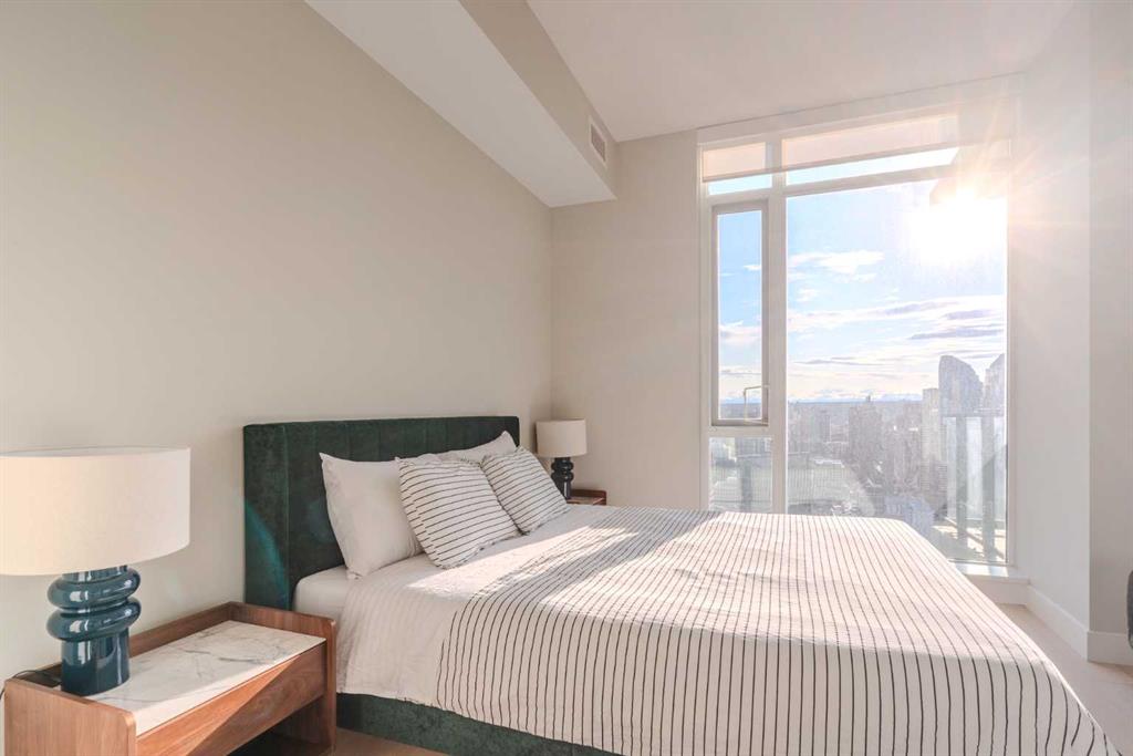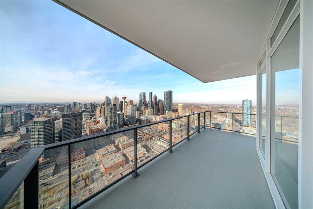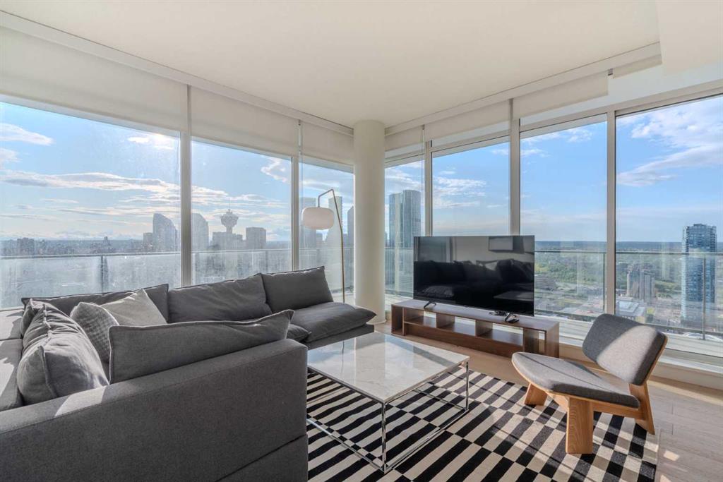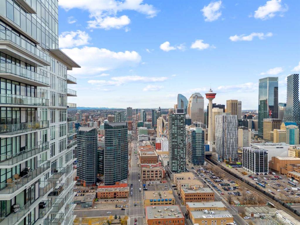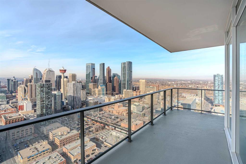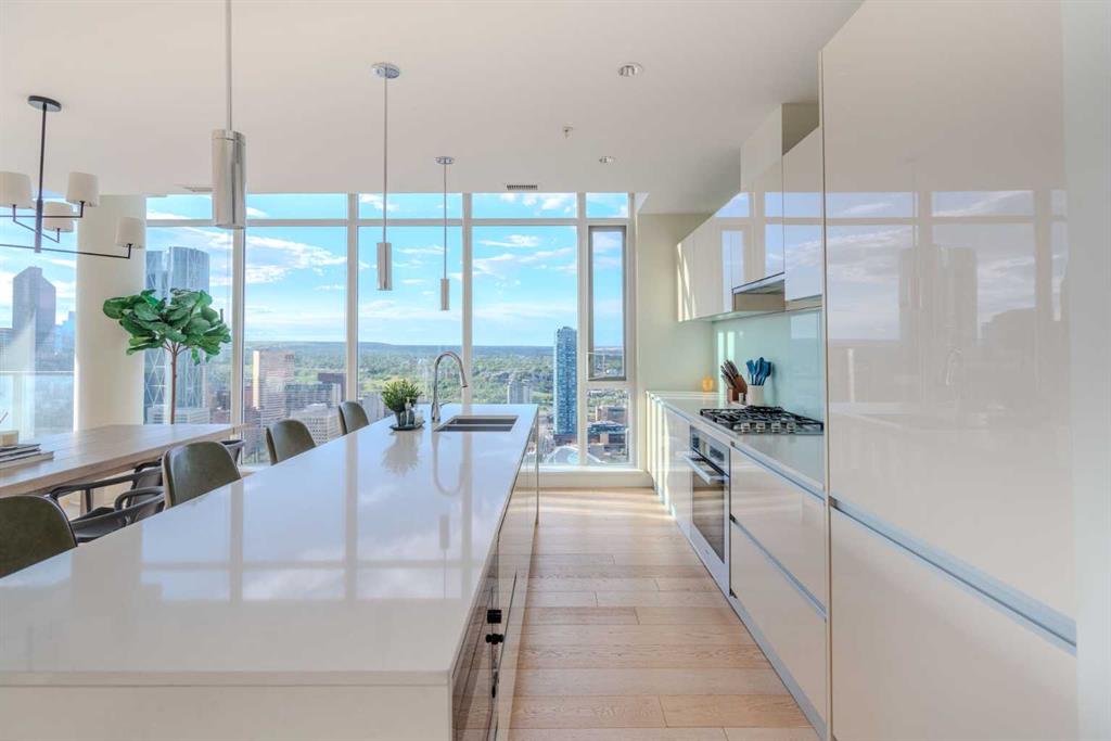 Enjoy unobstructed, panoramic views of both the downtown skyline and the majestic Rocky Mountains through floor-to-ceiling windows that flood the home with natural light. The north-west exposure is completely un-obstructed corner to corner, ensuring privacy and an incredible backdrop to every room. A expansive wraparound balcony comes complete with natural gas connection. The sleek, modern kitchen is equipped with Miele appliances and premium Armony Cucine cabinetry from Italy, complete with a sophisticated silent-close system found throughout the kitchen and both ensuites.