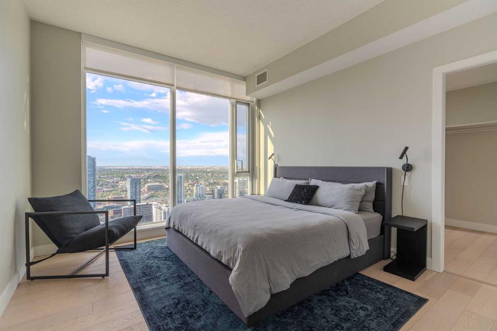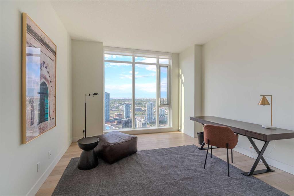 Welcome to The Guardian, Calgary’s prestigious and tallest residential tower. This remarkable, triple-mint condition 40th-floor residence offers an exclusive opportunity to experience luxury living high above the city. Featuring 1,739sq.ft., 2 bedrooms + den, 2.5 bathrooms, and soaring 9’6” ceilings, this sub-penthouse home showcases exceptional quality and design.