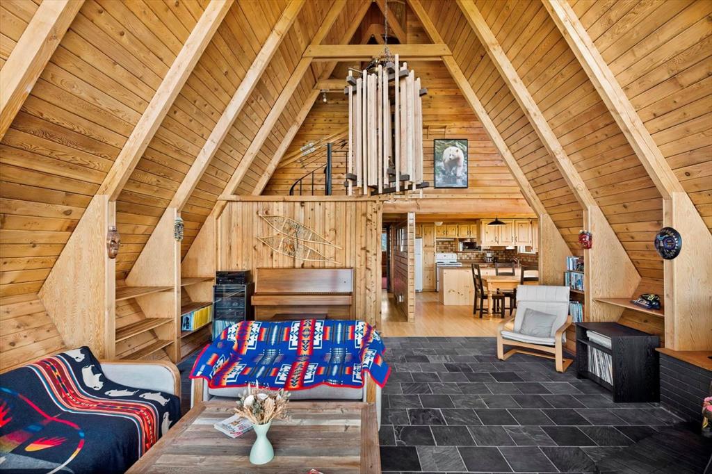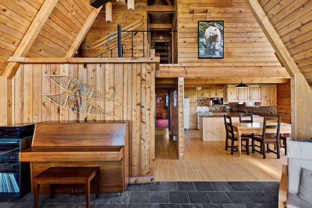 Step inside and your eyes are instantly drawn to the great room's dramatic wall of windows framing ever-changing vistas - morning fog drifting along the river valley, chinook arches sweeping winter skies, and storm clouds rolling across the landscape in nature's constant theatre. Warm cedar walls and ceilings create an intimate atmosphere, while natural slate flooring grounds you in earthy elegance. Vintage skis and snowshoes adorning the walls speak to outdoor living - evenings by the fire after days spent exploring the outdoors.