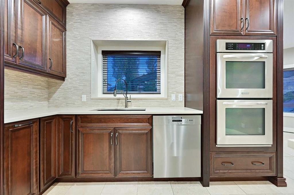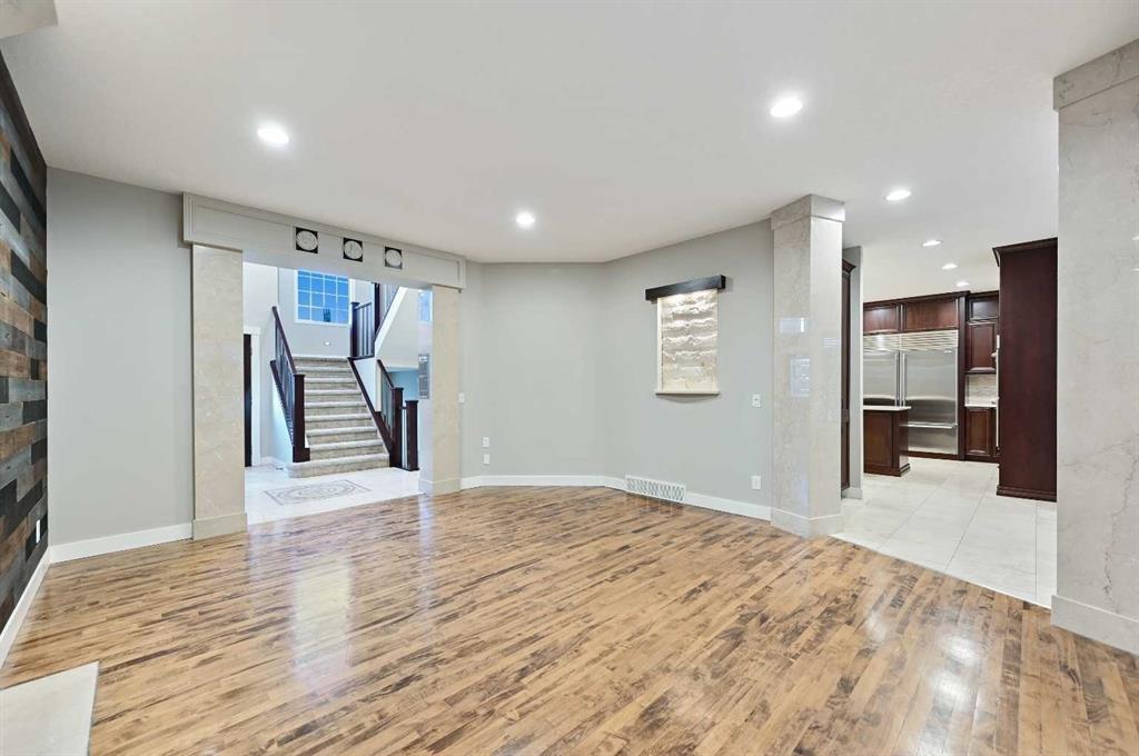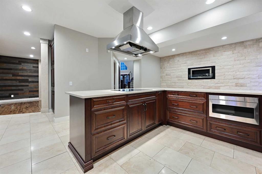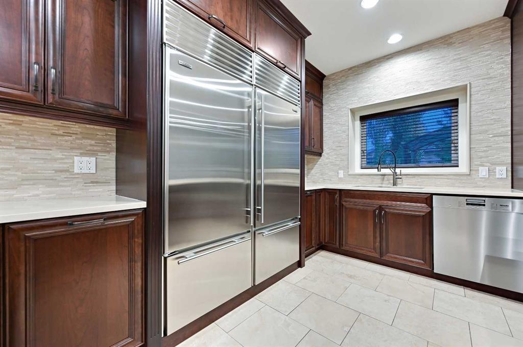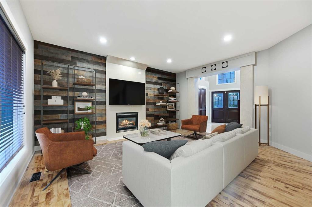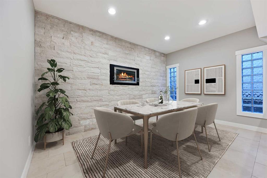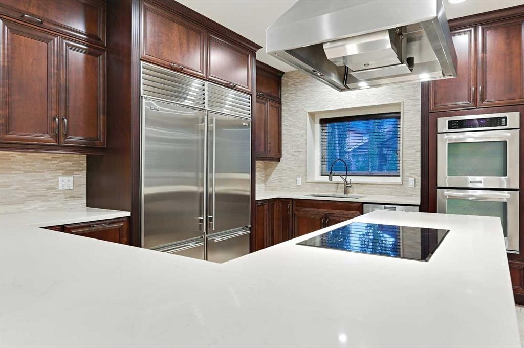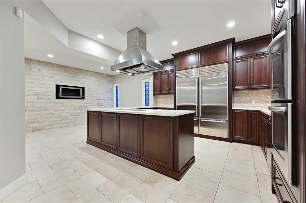 Inside, an extra-wide foyer welcomes you to the open-concept main level, finished with travertine tile, and soft contemporary tones. Expansive windows flood the space with natural light. The chef-inspired kitchen features Cherry Oak cabinetry, quartz countertops, a prep island with induction cooktop, dual Sub-Zero fridges, high-end KitchenAid appliances and pantry. The adjoining dining room is highlighted by a stone feature wall and modern firebox, while the living room impresses with rich hardwood floor, marble pillars, a gas fireplace with quartz surround, and a distressed wood feature wall.