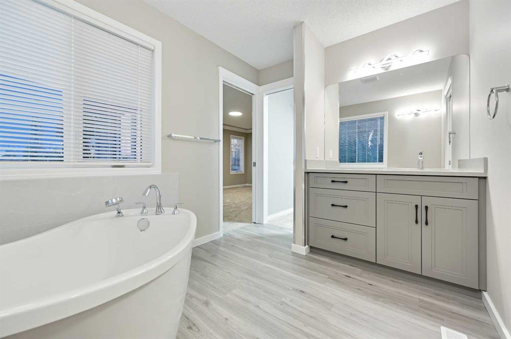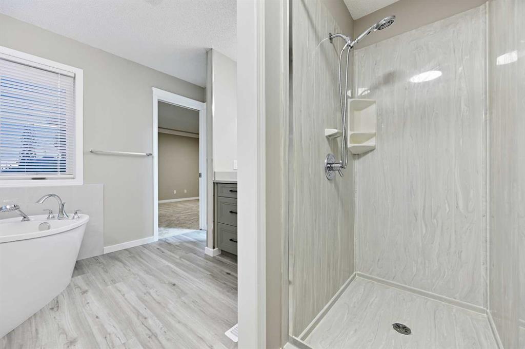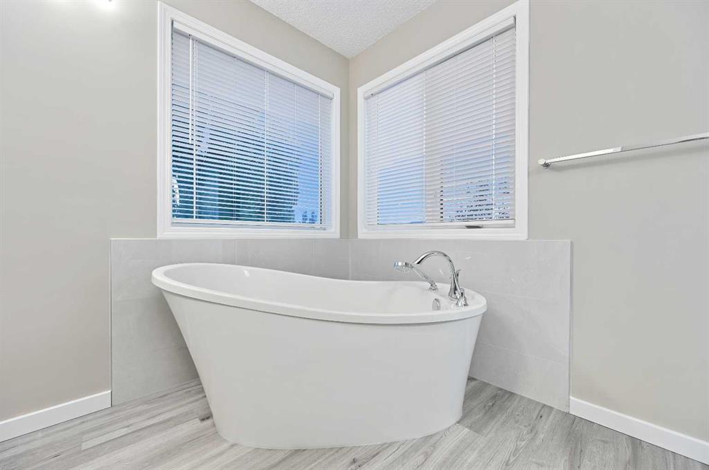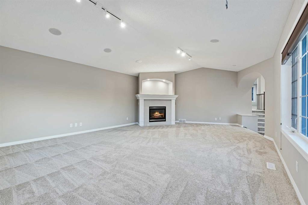 Upstairs, a vaulted bonus room with fireplace offers a cozy retreat. The serene primary suite includes a spa-like 4-piece ensuite with soaker tub, glass shower, quartz vanity, and water closet. Two additional spacious bedrooms, a full bath, and laundry complete this level.