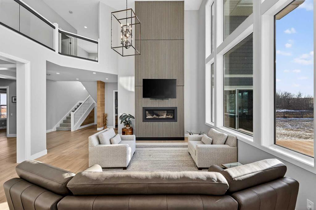Step inside to soaring 20-foot ceilings, oversized windows, and sun-filled living spaces anchored by a modern fireplace. The main floor is thoughtfully laid out with a private home office, a grand living room, and a refined dining area with a statement feature wall and fireplace. The chef’s kitchen is fully outfitted with newer high-end appliances including a brand new chef's dream gas stove and dual ovens, quartz countertops, a large island, modern cabinetry and a walk-in pantry, perfectly blending function and style. A generous recreational flex space offers endless possibilities. An ideal games room, home gym, theatre, man cave, or easily converted into a main-floor bedroom with exterior access to the massive deck.