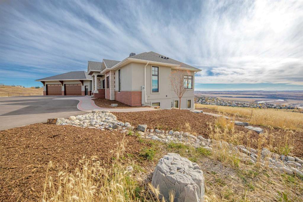 Nestled on 11.76 acres of pristine land, this magnificent 4500 SF walk-out bungalow offers breathtaking panoramic views of the mountains, valley, and Town of Cochrane. Meticulously crafted by McKinley Masters, this home seamlessly blends luxury, comfort, and functionality. The entry features a water wall and expansive windows that highlight the stunning views. The open living area includes a sitting room, dining area, and a chef's kitchen with a timeless scullery and walk-in pantry. The primary bedroom offers spectacular views, a 4-piece ensuite with a dry sauna and laundry facilities, plus a large walk-in closet. The main level also includes a 2-piece bath, elevator, and large mudroom leading to a 4-car (66 x 30) garage with epoxy flooring, dog wash, side attached single garage and elevator access. The lower level has 2 bedrooms, a 4-piece bath, a 3-piece ensuite, a media room, a private office, and a studio opening onto a covered and screened patio with a fire pit. Outdoor features include a front gate with a paved drive, fully fenced property, and stunning landscaping. Additional amenities are a powered C-Can for extra storage, and utilities serviced to the west side of the home. Call today to view.