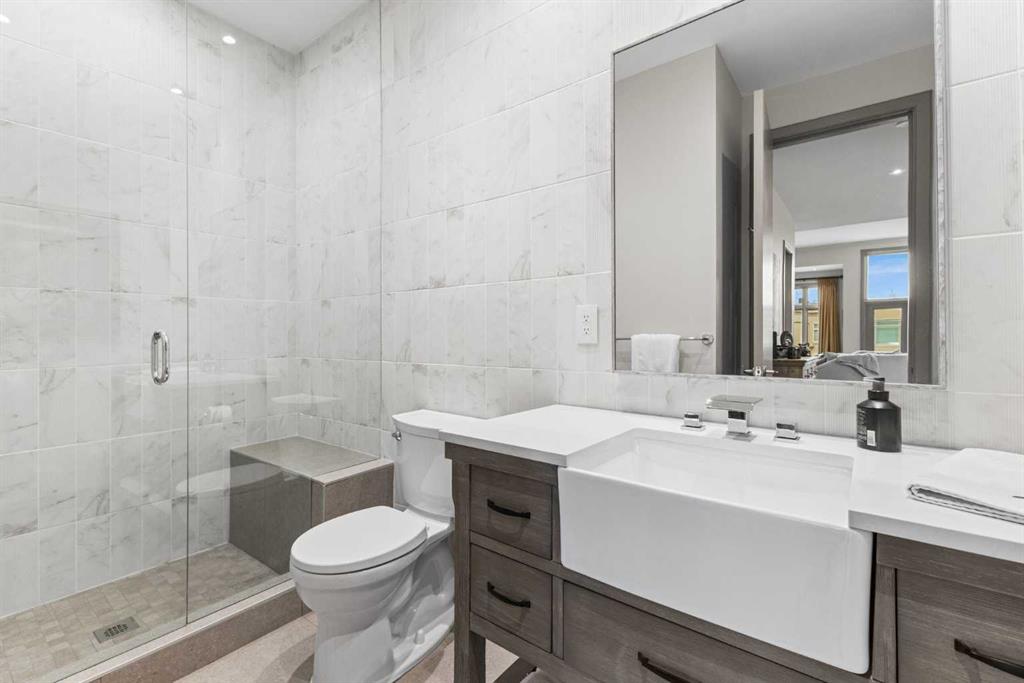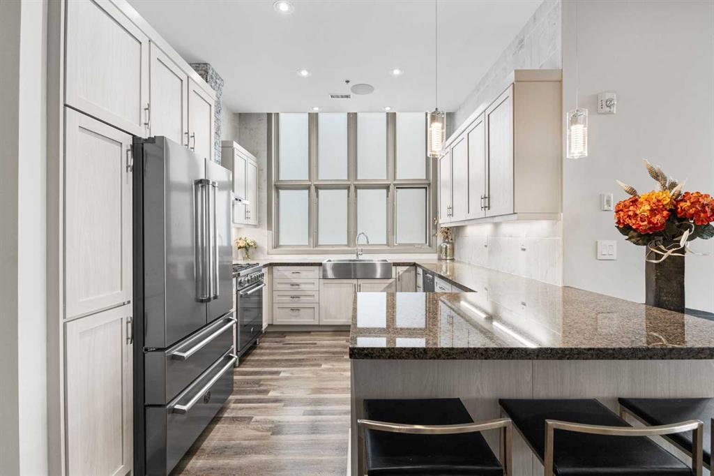 Exceptional completely renovated 2 bedroom, 2 bath penthouse residence offering over 1500 sq ft of luxurious living space in coveted Eau Claire, just steps to picturesque Prince’s Island Park & scenic Bow River pathways. This well-appointed condo presents hardwood floors, soaring ceilings & is drenched in natural light, showcasing a spacious living room with terrace access & anchored by a stunning floor to ceiling fireplace. A formal dining room adorned with an elegant chandelier affords ample space to entertain family & friends. The kitchen is beautifully finished with granite counter tops, eating bar, plenty of storage space & all new high-end stainless steel appliances. Just off the living room, the primary bedroom with balcony access features abundant closet space & private 5 piece ensuite with dual sinks, relaxing freestanding soaker tub & separate shower. The second bedroom & 3 piece bath are ideal for guests. Other notable features include in-suite laundry, 3 large terraces with north & west views, halogen recessed lighting, in-floor heat, central air conditioning, humidification through forced air & power blinds on high windows. Also enjoy the convenience of 2 titled underground parking stalls near the elevator, one titled storage space & recently renovated common areas. The central location can’t be beat – Bow River pathways & Prince’s Island Park & the Peace Bridge are just steps away plus downtown restaurants & amenities are close by. This elegant residence offers the ultimate in exclusivity & privacy with only 4 units on the floor & no noise from above.