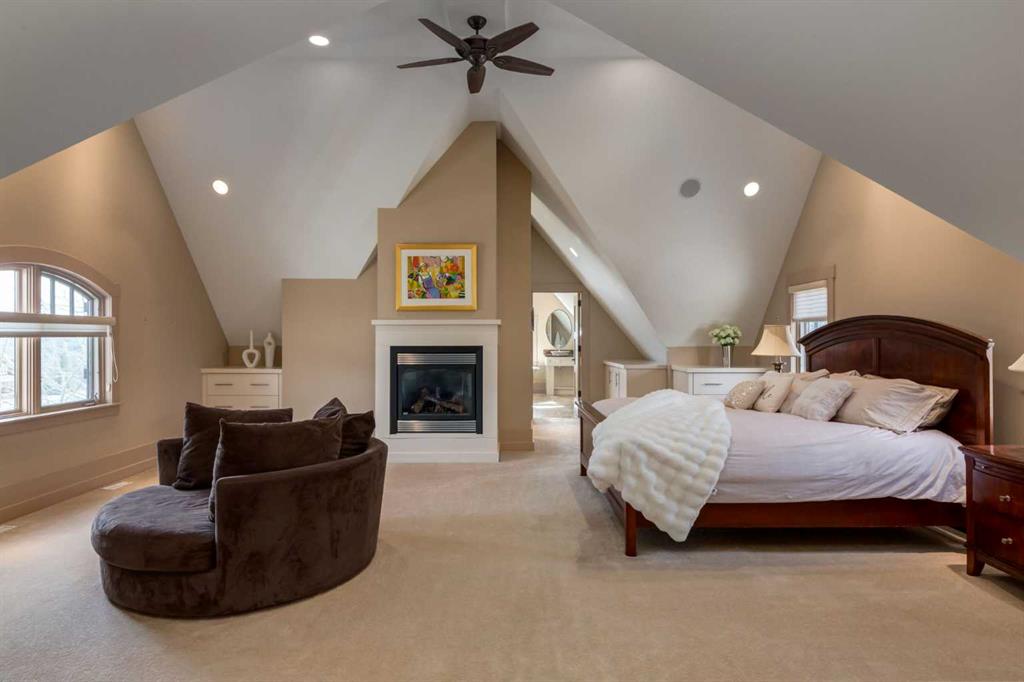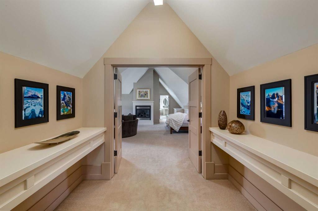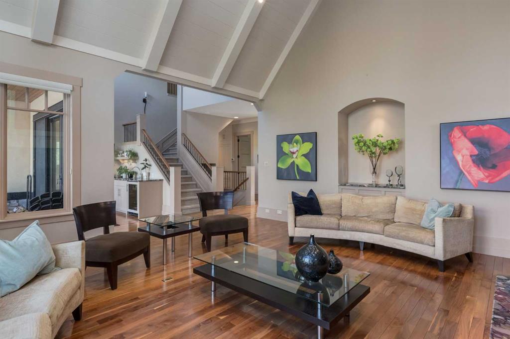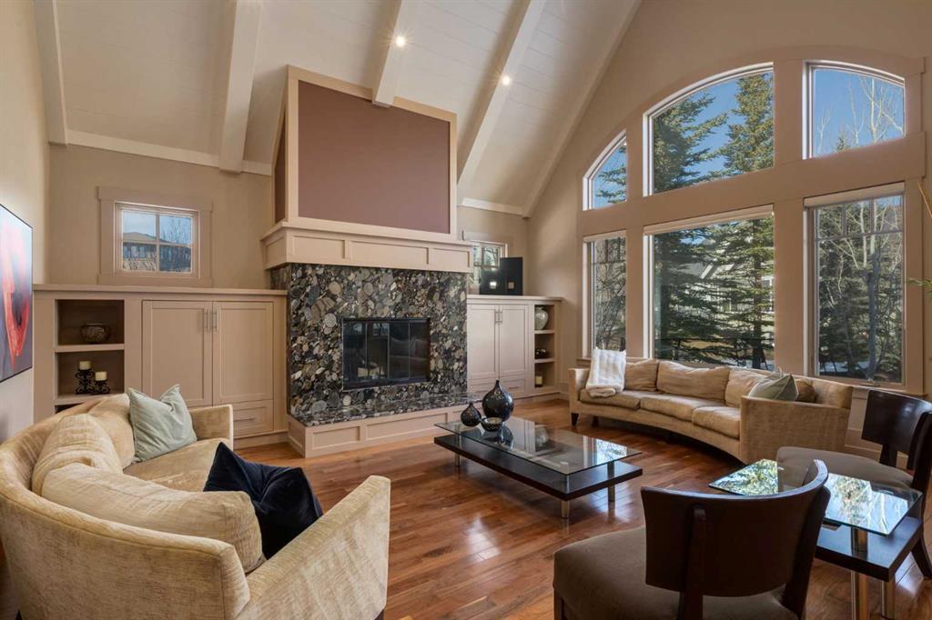 Welcome to luxury living in the prestigious community of Elbow Valley—an award-winning neighborhood just minutes from the city. Surrounded by forests, rivers, and lakes, this custom-built two-story home offers an exceptional lifestyle with a rare four-car heated garage offering over 5690 square feet of living area. As you arrive, the sense of privacy and natural beauty immediately sets the tone. As you enter the home there is a spacious foyer with built-in cabinetry. Just off the entrance is a private powder room and an impressive living room featuring soaring 20-foot vaulted ceilings, abundant natural light, built-in cabinetry, and a cozy wood-burning fireplace. The main floor also showcases an elegant formal dining room with vaulted ceilings highlighted by a two-way fireplace that connects seamlessly to the Italian-inspired chef’s kitchen, complete with high-end appliances, a large island, and stunning marble countertops. Adjacent to the kitchen is a bright breakfast nook with access to a barbecue patio and a secondary entrance to the home. The large mudroom has a second half bathroom leading to the garage which features storage cabinet, built in bike racks, and a dog washing station. Step outside to enjoy the beautifully treed and private backyard featuring a covered deck, fire pit area, and space for a trampoline—perfect for family gatherings and outdoor relaxation.
