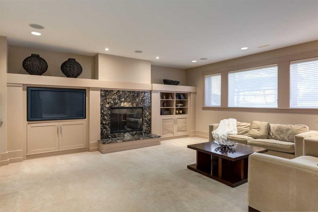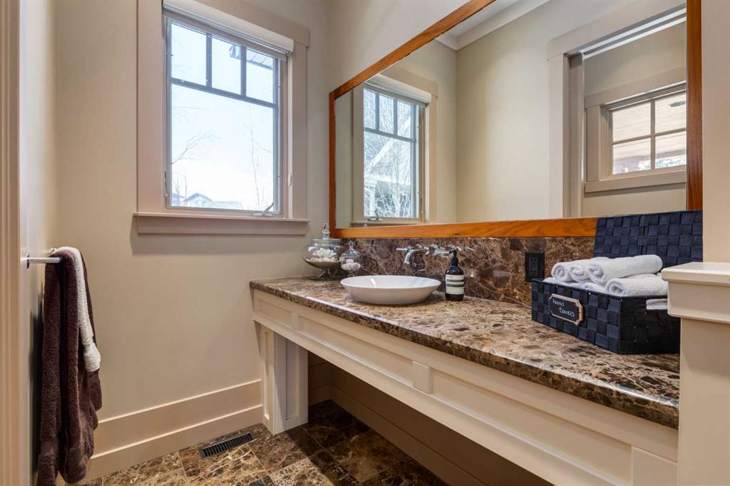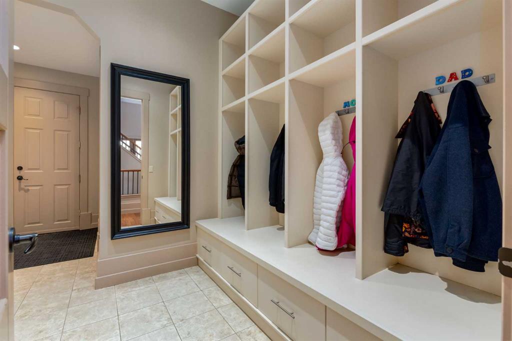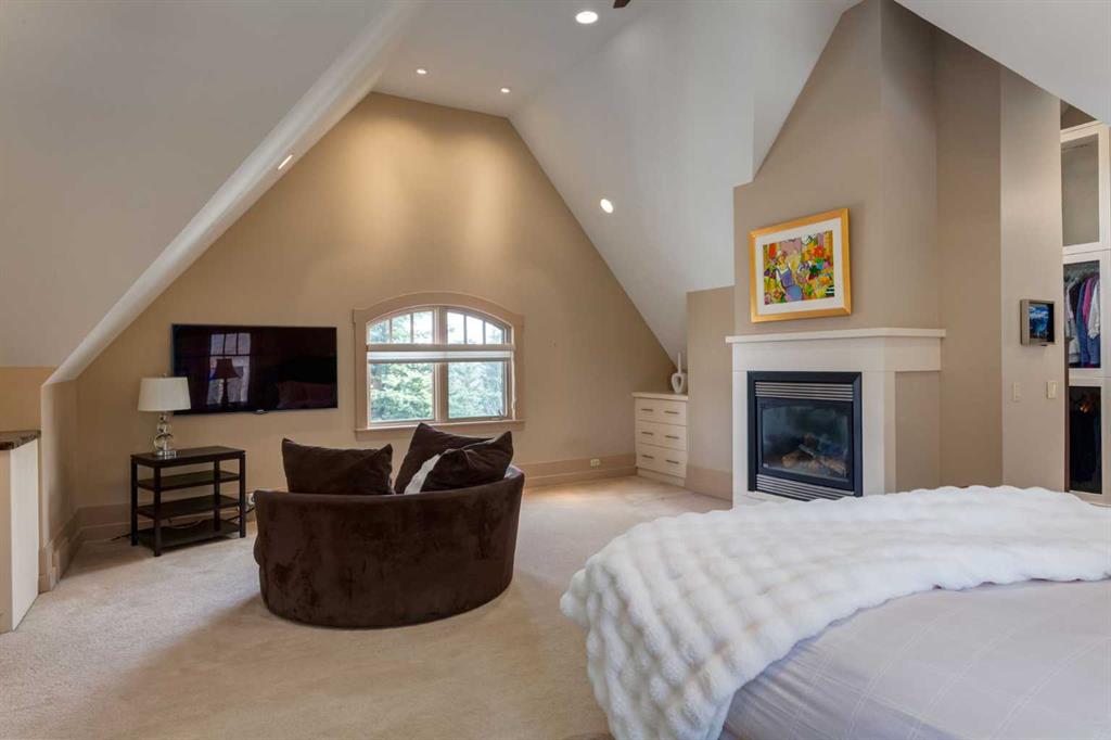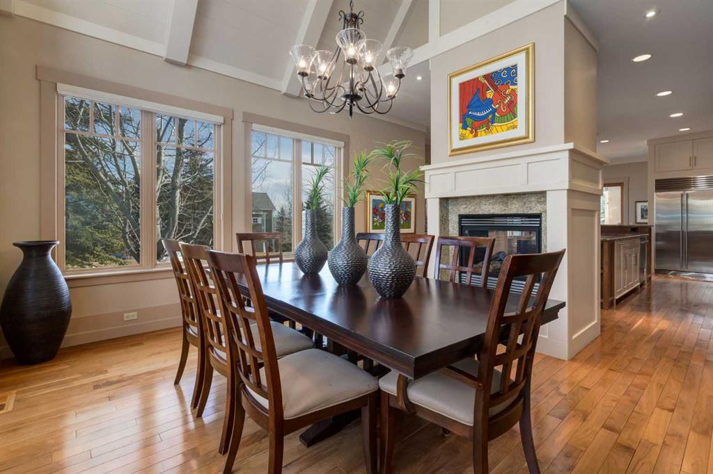 Welcome to luxury living in the prestigious community of Elbow Valley—an award-winning neighborhood just minutes from the city. Surrounded by forests, rivers, and lakes, this custom-built two-story home offers an exceptional lifestyle with a rare four-car heated garage offering over 5690 square feet of living area. As you arrive, the sense of privacy and natural beauty immediately sets the tone. As you enter the home there is a spacious foyer with built-in cabinetry. Just off the entrance is a private powder room and an impressive living room featuring soaring 20-foot vaulted ceilings, abundant natural light, built-in cabinetry, and a cozy wood-burning fireplace. The main floor also showcases an elegant formal dining room with vaulted ceilings highlighted by a two-way fireplace that connects seamlessly to the Italian-inspired chef’s kitchen, complete with high-end appliances, a large island, and stunning marble countertops. Adjacent to the kitchen is a bright breakfast nook with access to a barbecue patio and a secondary entrance to the home. The large mudroom has a second half bathroom leading to the garage which features storage cabinet, built in bike racks, and a dog washing station. Step outside to enjoy the beautifully treed and private backyard featuring a covered deck, fire pit area, and space for a trampoline—perfect for family gatherings and outdoor relaxation.