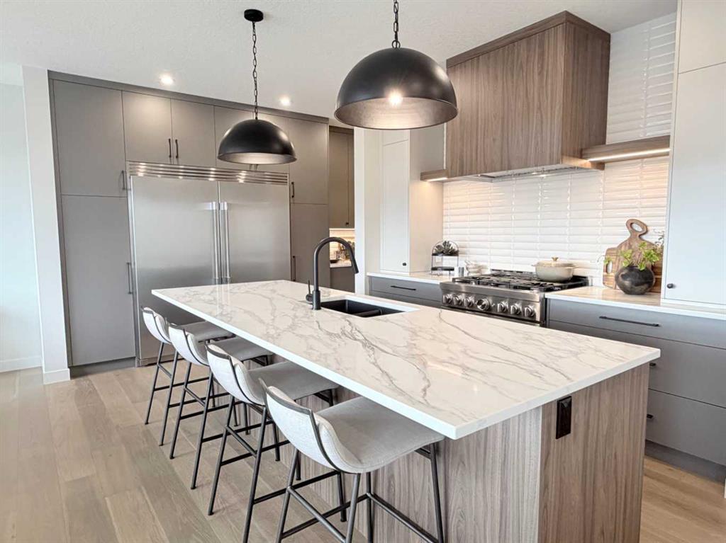 Step inside to discover a bright, open-concept layout enhanced by triple-pane Low-E² windows that flood the home with natural light. The gourmet kitchen is a true showpiece, boasting full-height modern cabinetry to the 9-foot ceiling, an oversized island, and a premium appliance package including a built-in stainless steel double fridge/freezer, upgraded gas range, dishwasher, microwave, hood fan, and bar fridge—perfect for both entertaining and everyday living. A butler’s pantry adds extra prep space and storage.