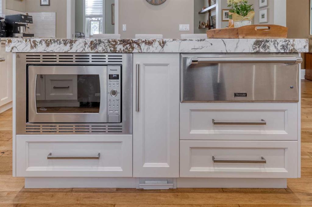The main level features 10’ ceilings, oversized windows, engineered hickory hardwood flooring, extensive custom built-ins, and a spacious great room anchored by a 44” gas fireplace with integrated 5.1 surround sound and custom cabinetry. The sun-filled chef’s kitchen includes a 6-burner gas range, 48” built-in refrigerator, built-in warming drawer, pot filler, waterfall-edge granite island, and under-cabinet and island lighting. The upgraded cabinets offer ample storage, custom wooden drawer organizers, lazy-Susan corner units, pull-out pot drawers, a spice pull and a pull-out waste basket system.