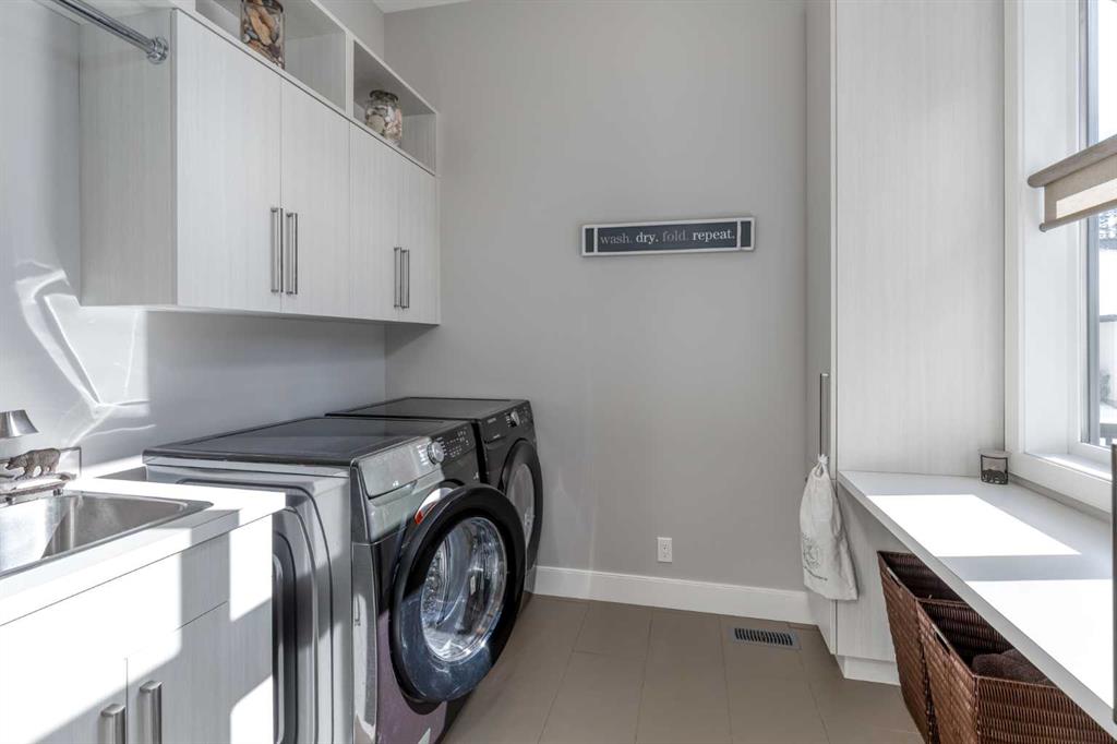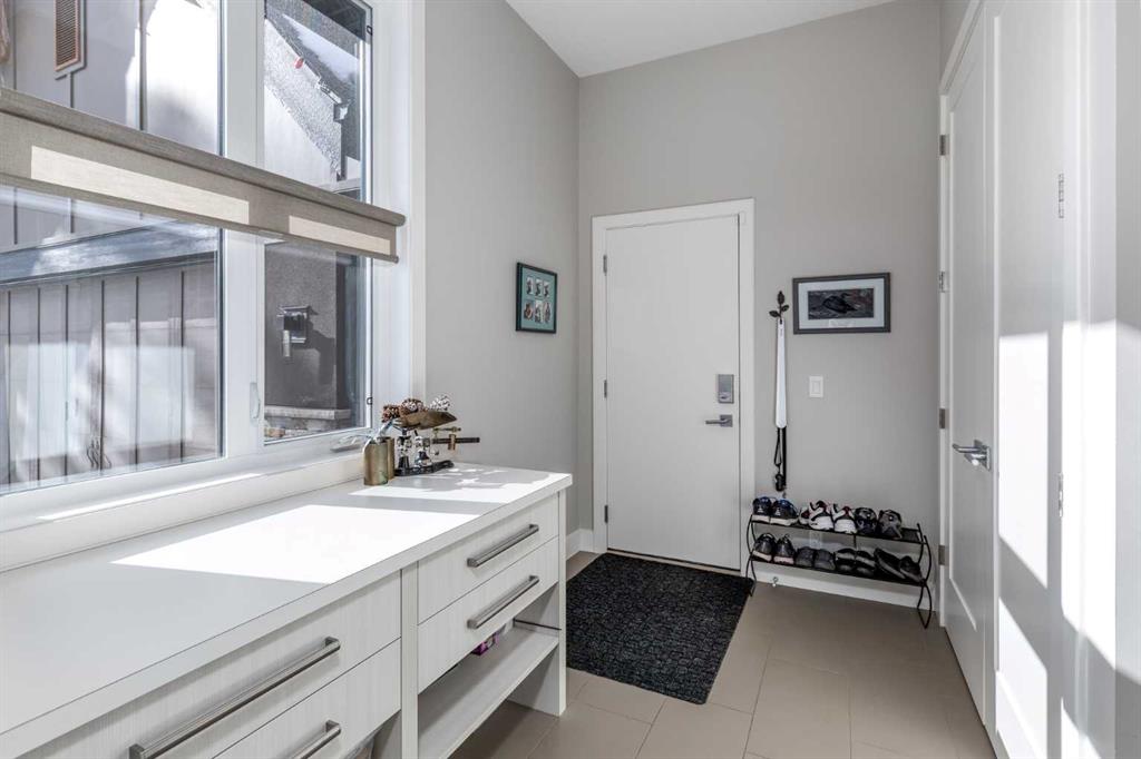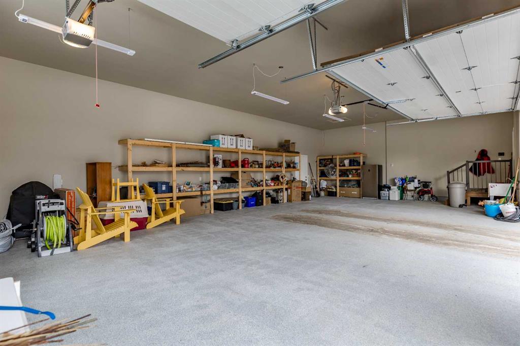 The 1153 sq ft, triple-car garage offers 12’ ceilings, 9’ doors, in-floor heat, epoxy-coated floors, hot/cold water service, built-in shelving and an entrance to both the side yard and the Mudroom.