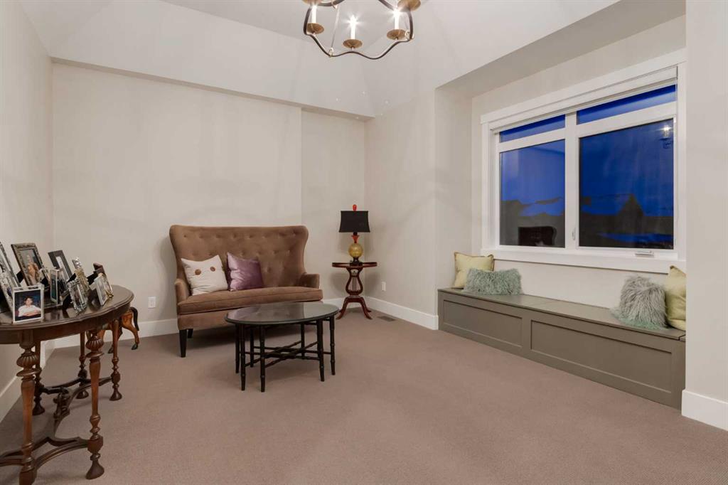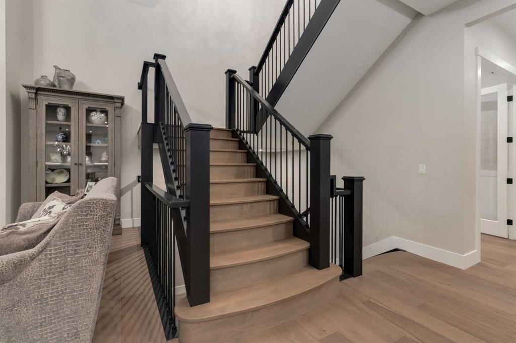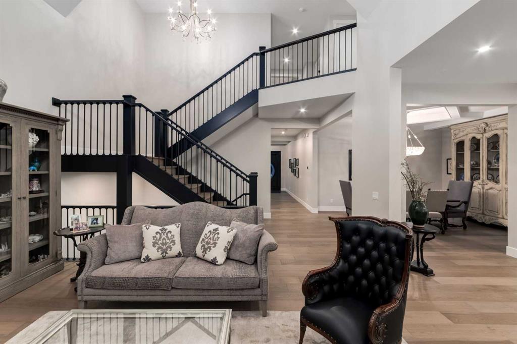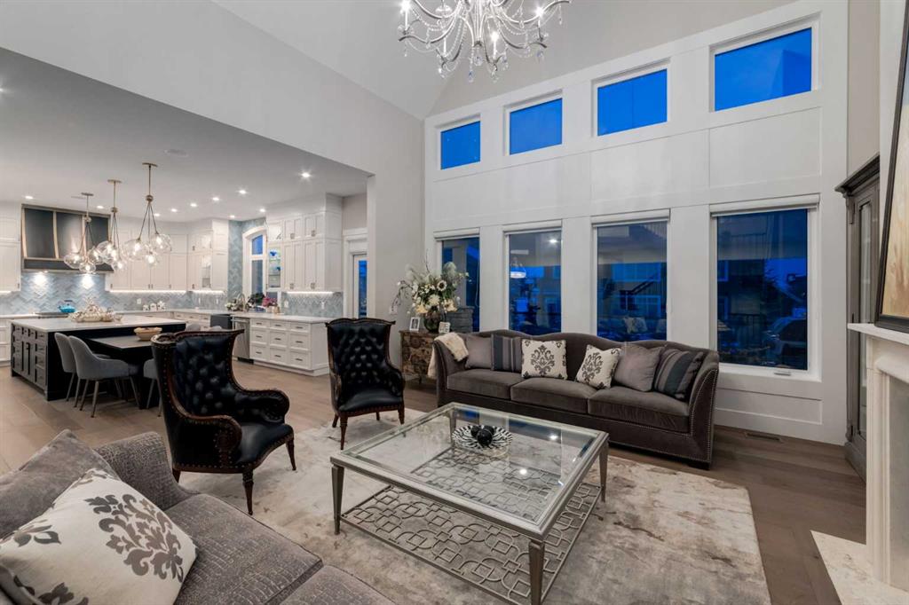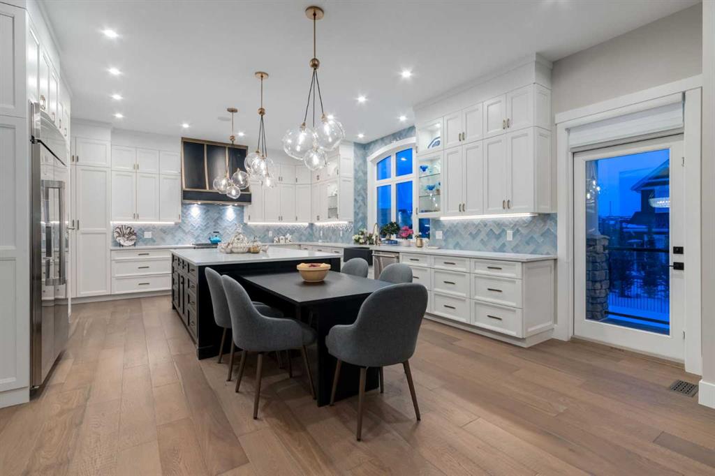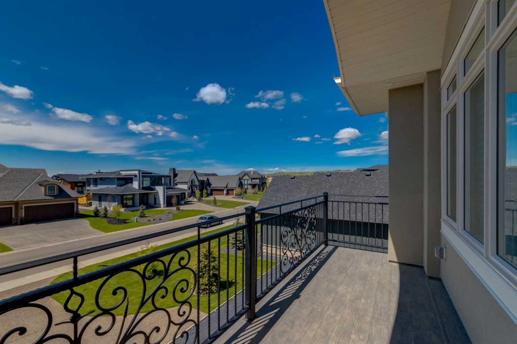 Masterfully executed in a transitional design style, this exquisite Family Home showcases nearly 5,500 sf of impeccable luxury defined by unparalleled craftsmanship and the highest quality of finishes throughout, including an ELEVATOR for easy accessibility to all three floors. The exterior architecture exudes a timeless appeal from the peaked rooflines to the "eyebrow" detailing to the rich stone accents, incredible window designs, a front veranda & upper balcony, and a striking "piece de resistance" front door. The beautifully landscaped front and back gardens impress with perfectly manicured flower beds, and a textural mélange of shrubs and trees. The home's layout is outstanding, while the interior design elements leave a lasting impression on the most discerning "eye for design". The main floor boasts soaring ceiling heights with coffered detailing, impressive, large windows flooding the interior with streams of natural light, custom millwork designs, beautiful, wide-plank hardwood floors, timeless floor and backsplash tile designs, and last but not least, exquisite "Schonbek" chandeliers. The grand, light-filled great room features a magnificent fireplace. It is open to the decadent kitchen and an elegant dining room perfectly suited to hosting dinner parties for family and friends. The front study offers complete privacy and leads to a unique "plant sunroom". The custom-designed kitchen is a chef's dream featuring high-end appliances, ample storage with pullout units, a gigantic center island, timeless quartz countertops, a coveted "Hammersmith" range hood, and last but not least, an impressive chevron pattern backsplash design executed with the utmost precision. Beautifully custom-designed stairs ascend to the upper level complete with three bedrooms and a bonus room, perfectly suited for the children's play area, a TV/games room, or a study room. The master suite is a luxurious retreat complete with wool carpeting, a showpiece chandelier, its own West-facing balcony and a lavish spa-like ensuite and "dressing room" - a fashionista's dream. Each of the children's bedrooms offers its own chic ensuite bath. The lower level is a true "entertaining haven" featuring a family/TV room that opens onto a private patio area, a wet bar complete with custom furniture-piece units, a wine room, three additional bedrooms, one of which being designated as an exercise room, a full bathroom and a large storage/cold room area. The double and single garage spaces are heated. The single garage is complete with 220 V wiring to allow for an EV charging station. The monthly HOA fees include front yard maintenance, including weekly mowing/trimming; weekly curbside garbage/recycling pickup; snow removal on the streets, sidewalks, pathways & the central plaza; maintenance of the central plaza, cascading ponds, outdoor kitchen, and playgrounds. Please refer to the community website for a wealth of information. MUST BE SEEN!
