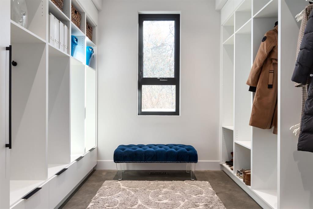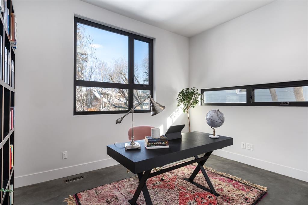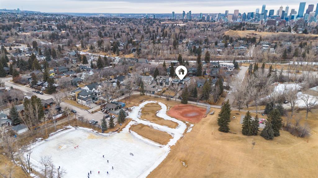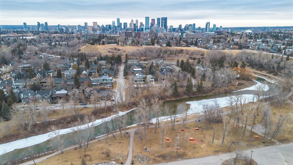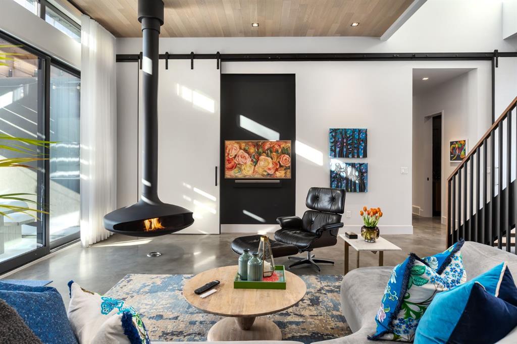 Set within one of Calgary’s most sought after inner city pockets, this architecturally driven residence blends scale, design & everyday livability. Situated on a south facing lot just over ¼ acre, a rare inner city offering, this custom Homes by Avi build with interiors by Connie Young Design balances striking architecture with functional living & exceptional craftsmanship. Featured in a design magazine & recognized with multiple awards, the home reflects a level of design rarely seen within inner city living. The 1.5 storey layout offers the primary suite, two bedrooms & a den on the main level, plus two upper bedrooms each with ensuite & a bonus room, creating flexibility for families, right sizers, or executive living. Architectural features include polished concrete floors with in floor radiant heat, brushed oak engineered hardwood ceilings, recessed LED lighting, triple pane windows, & an open riser staircase beneath soaring 20 foot ceilings enhancing light & volume. The main living area features 12 foot ceilings, a suspended Scandinavian inspired gas fireplace, & two steel barn doors that open for flow or close for privacy from the bedroom wing. Oversized sliding glass doors connect the dining area to the front patio, while the mudroom offers built in storage & organization. Designed for everyday living & entertaining, the kitchen features book matched walnut inspired cabinetry, floating cabinets, porcelain tile backsplash, & a premium appliance package with Wolf built in wall oven, steam convection oven, Sub Zero integrated refrigeration, vertical freezer, & oversized wine fridge. The primary retreat offers patio access, a walk in closet, & a spa inspired ensuite with 14 foot ceilings, oversized steam shower & soaker tub, bidet toilet, & custom wood feature wallpaper for a five star hotel feel. Mechanical highlights include a high efficiency boiler, two furnaces, two central A/C units, HRV, water softener, sump pump, main floor mechanical room, & heated attached garage with epoxy floors & integrated wall storage. Oversized sliding glass doors open to a pergola covered patio with hot tub & gas fire table for effortless indoor outdoor living. The south facing backyard overlooks the outdoor skating rink, playgrounds, baseball diamond, & green space with direct access to the Elbow River, pathways, Stanley Park Outdoor Pool, Lawn Bowling Club, tennis courts, plus nearby amenities including the Saddledome & MNP Community & Sport Centre. Minutes to downtown, top rated schools, the Glencoe Club, & Calgary Golf & Country Club. The unfinished basement offers a blank canvas with nearly 10 foot ceilings, ready to customize. With protected sight lines, no direct rear neighbours, & seamless access to green space, this home offers privacy & architectural elegance. Architecturally stunning & designed for everyday living, a rare inner city opportunity.