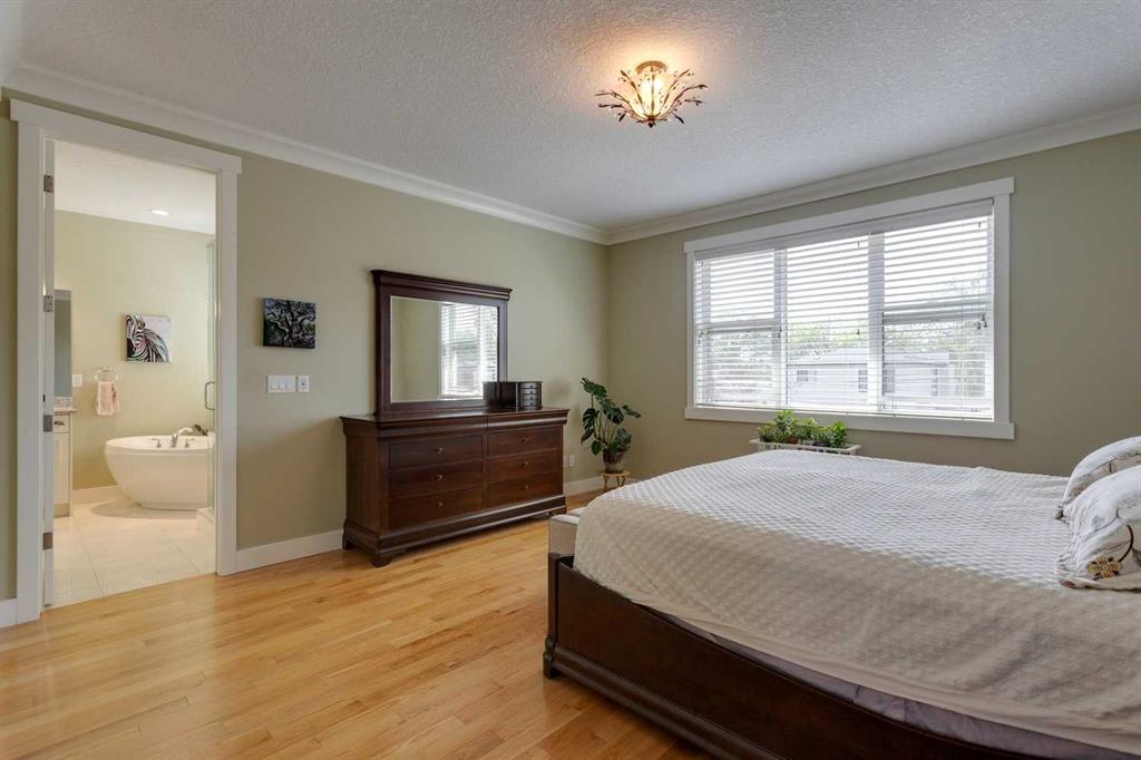 Outdoors, the south-facing backyard private yard features professional landscaping, concrete patios and walkways, a BBQ gas line, a large greenhouse, garden beds, and fruit-bearing apple trees and grapevines. The oversized double garage offers Hardy board siding, 10’4” ceilings, 220V outlets, and a built-in workbench, all accessed by a paved alley for added convenience.