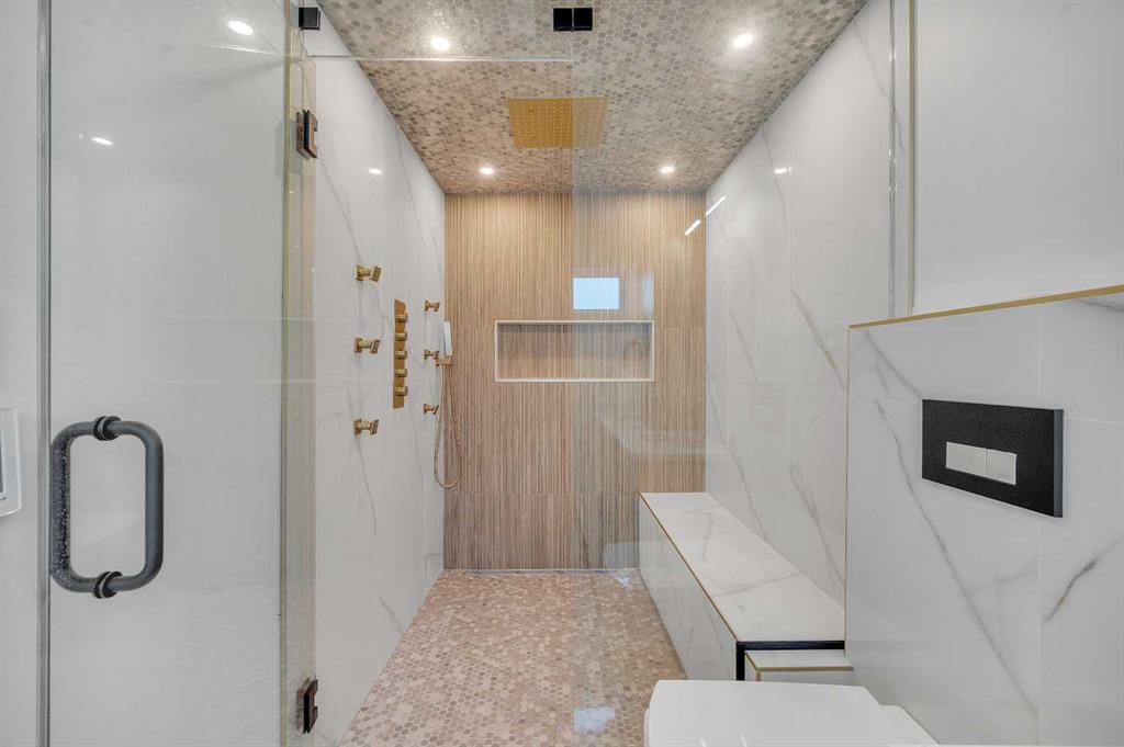 The kitchen transitions seamlessly to the light filled Living room with a stone tile centerpiece wrapping the cinder log style fireplace. Incredibly spacious and fits the whole family as well as guests when entertaining. Open right to the backyard deck via sliding doors. The main floor also hosts an office complete with extensive built in shelfing and oversized windows allowing natural light to pour in. Moving upstairs takes us through the Glass handrail staircase. Upstairs has three bedrooms, the laundry and a spacious bonus room. The master bedroom overlooks the front yard and comes complete with a beautiful ensuite and walk in closet.. The Ensuite has his and her vanities, and a massive tiled walk in shower with a overhead rainhead. Every bedroom is massive with large closets and yard views. The bonus room is the perfect family room with the wood grain flutes and sleek gold tile feature wall making the ultimate backdrop for entertainment. The large and spacious basement comes with a media room, 2 additional bedrooms, another bathroom and a wet bar. Because this home is on a pie lot, that means the backyard is much larger then a traditional rectangle lots and that allows for a massive triple garage while still giving way to huge amenity space. A tremendous amount of parking thanks to the cul-de- sac front access parking as well as the triple garage means the whole family has ample parking space. Large amounts of leisure space outside as well. Enjoy the rear deck, or the concrete Patio surrounded by young Aspens fitted with a firepit, barbeque and gazebo for summer lounging. The exterior of this home is adorned with fire resistant stucco and Roman Stone giving this home a beautiful timeless look. Minutes from Market Mal, the University of Calgary and the bow river. Peerless layout, finishes and location, book a showing today for this classic inner city masterpiece.
