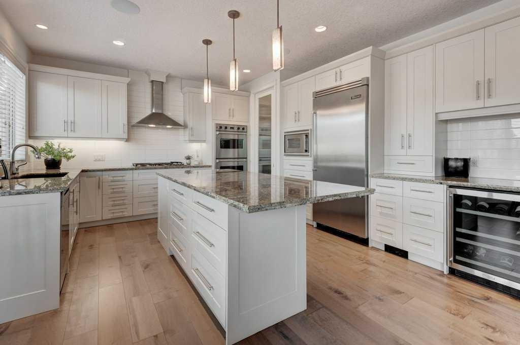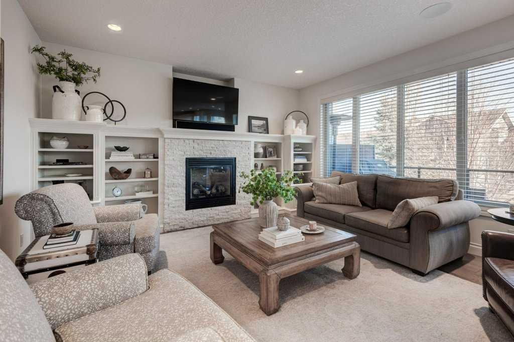 Welcome to 436 Evergreen Circle SW, an elegant, family-friendly home with thoughtful design and a luxurious feel. From the moment you step inside, the open layout, engineered hardwood throughout, and abundance of natural light make a lasting impression. The main floor features a generous living room anchored by a stone-surround fireplace and custom built-ins, perfect for cozy evenings or entertaining. A wall of windows leads into the bright dining area and out onto a raised balcony, ideal for morning coffee or summer BBQs.