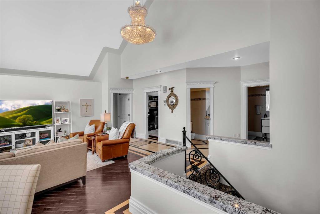 The upper level is a haven of comfort with 5 additional bedrooms and 2.5 bathrooms, including a serene primary suite with a spa-inspired 5-piece ensuite. A central bonus room with a private balcony offers an ideal retreat for relaxation or family time.