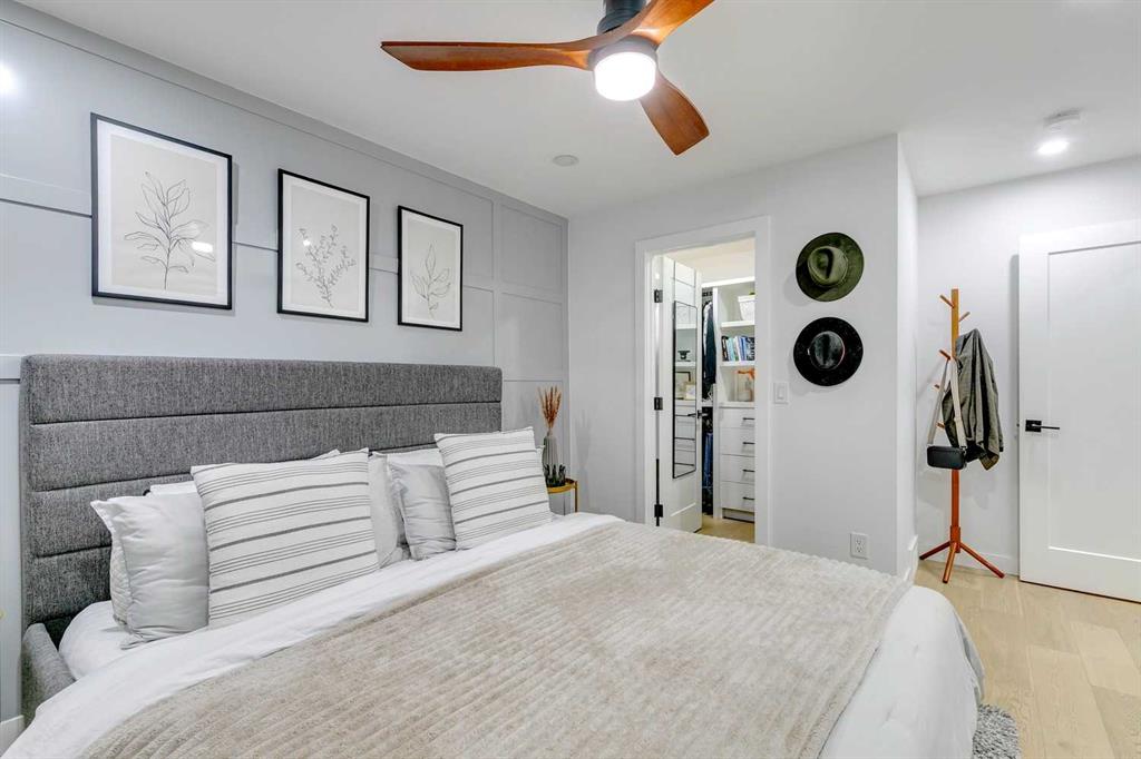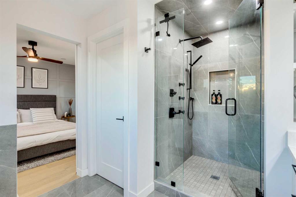Upstairs, you’ll find continued hardwood flooring and a stunning primary suite designed for comfort and sophistication. The room features a soft grey accent wall, large window, custom walk-in closet, and a beautiful barn door that leads to the luxurious spa inspired 5-piece ensuite. The ensuite includes a modern double-sink vanity, freestanding soaker tub, and a glass-enclosed shower with. A secondary bedroom overlooks the front yard and green space across the street, while a nearby 4-piece bathroom offers matching quartz counters with a tiled tub & shower combo.