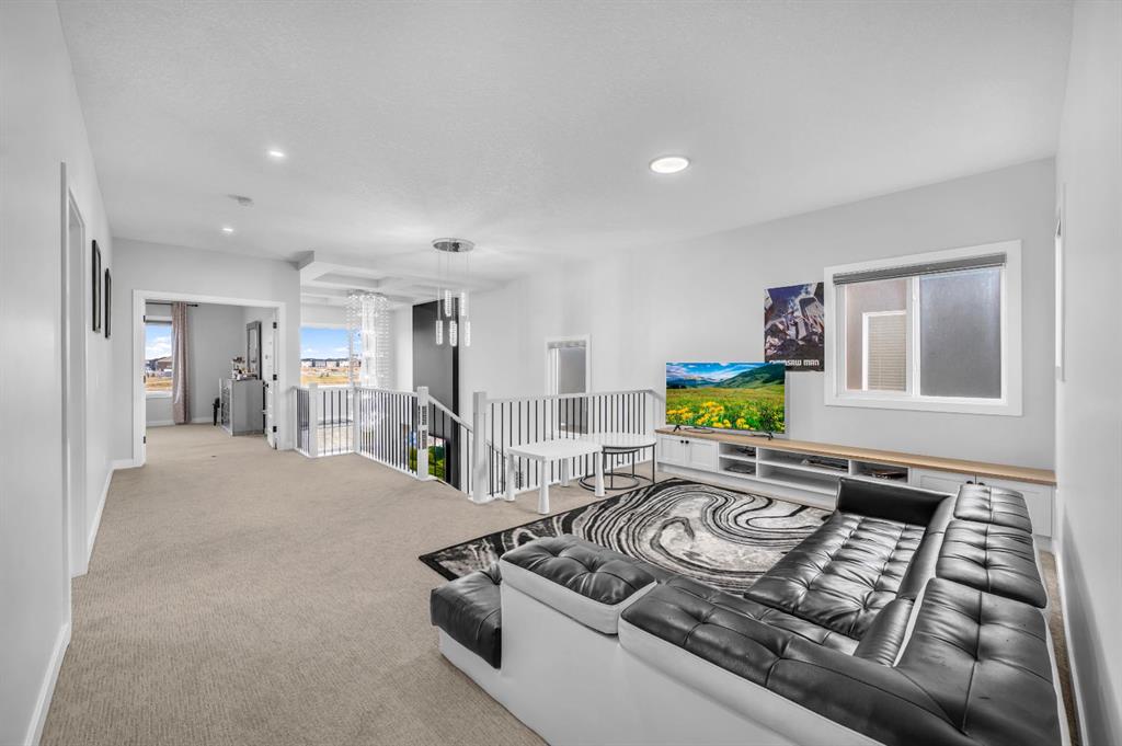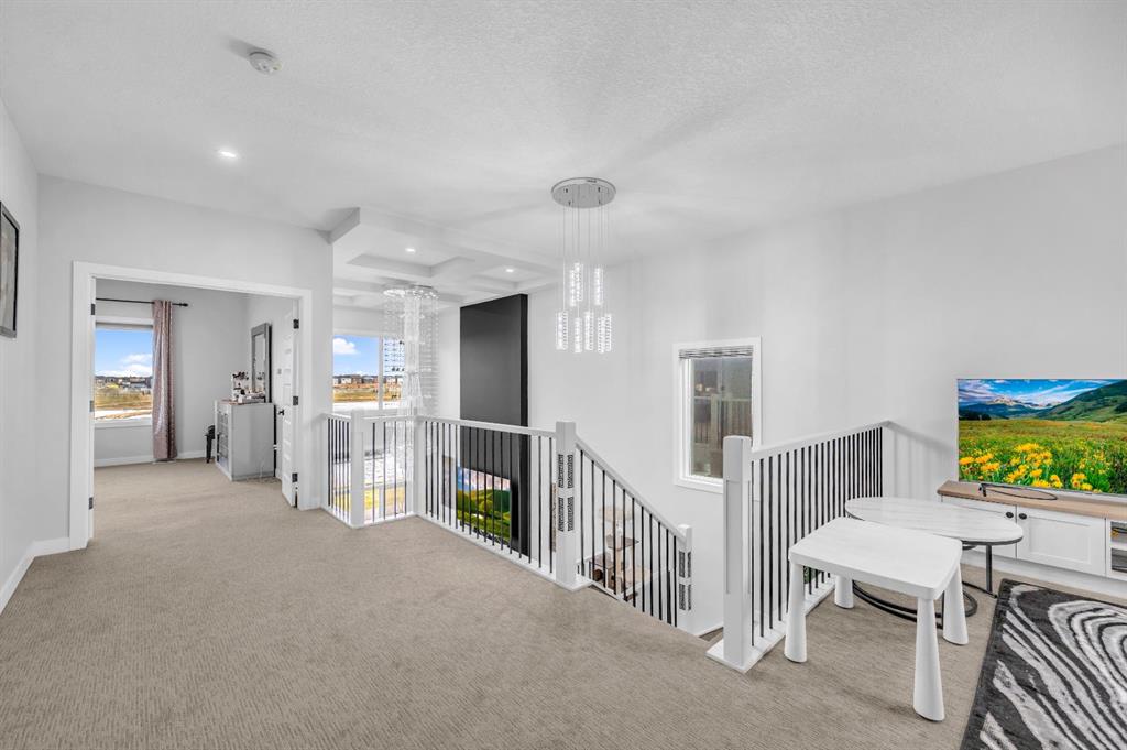 The upper level continues to impress with four beautifully appointed bedrooms, including two opulent primary suites. The main primary retreat offers a spa-inspired ensuite complete with luxurious finishes and an expansive walk-in closet. A spacious and airy loft overlooks the living room below, providing a versatile lounge or relaxation space.