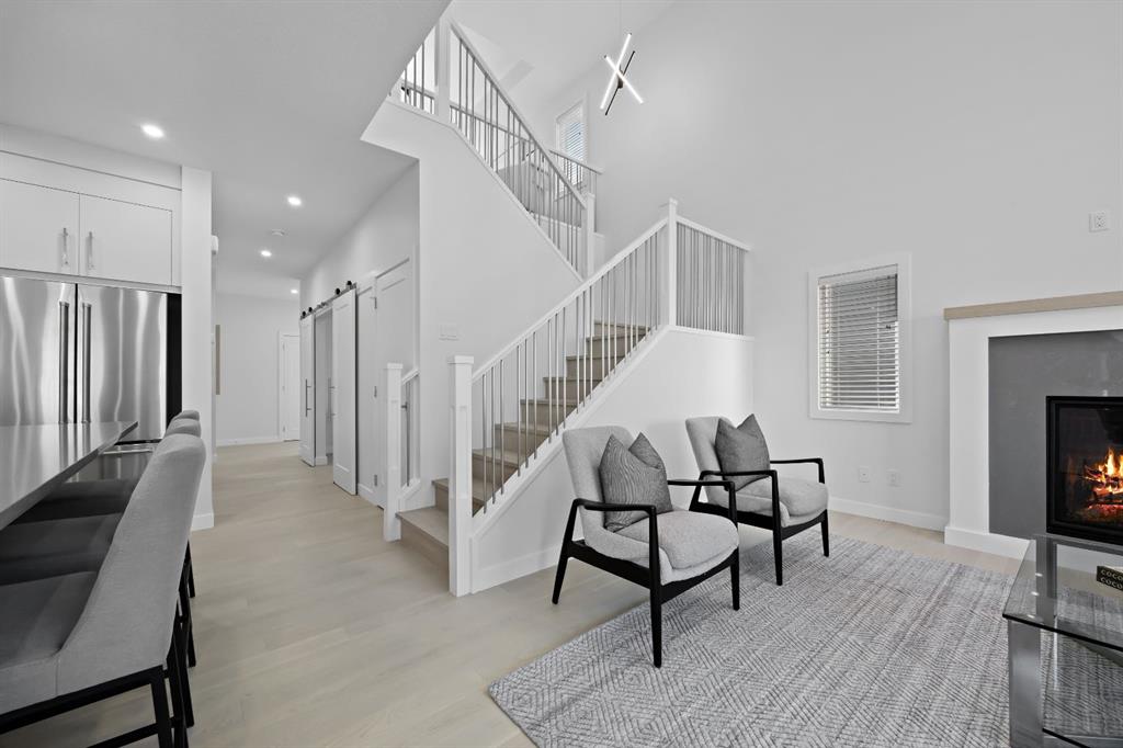 The kitchen seamlessly flows into the sun-filled great room, where soaring two-story ceilings create a grand and airy atmosphere. A striking quartz-faced fireplace adds warmth and style, making it the perfect gathering place for cozy evenings or vibrant entertaining. With 9’ ceilings, wide-plank hardwood floors, a versatile main-floor den, and a chic 2-piece powder room, every detail has been curated for comfort, convenience, and sophistication.