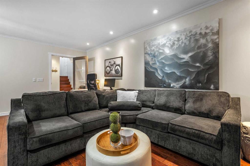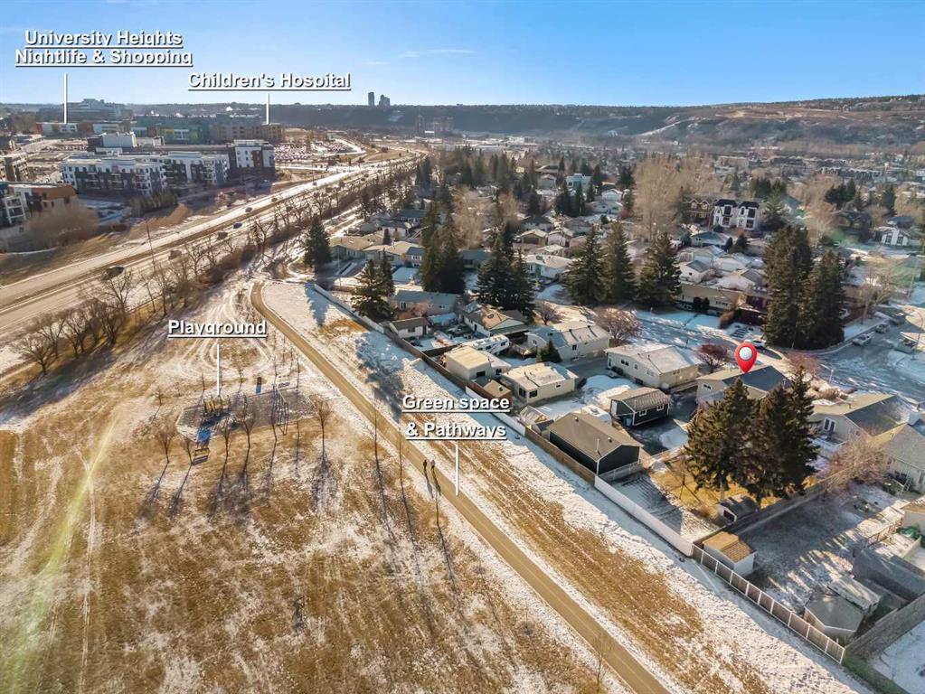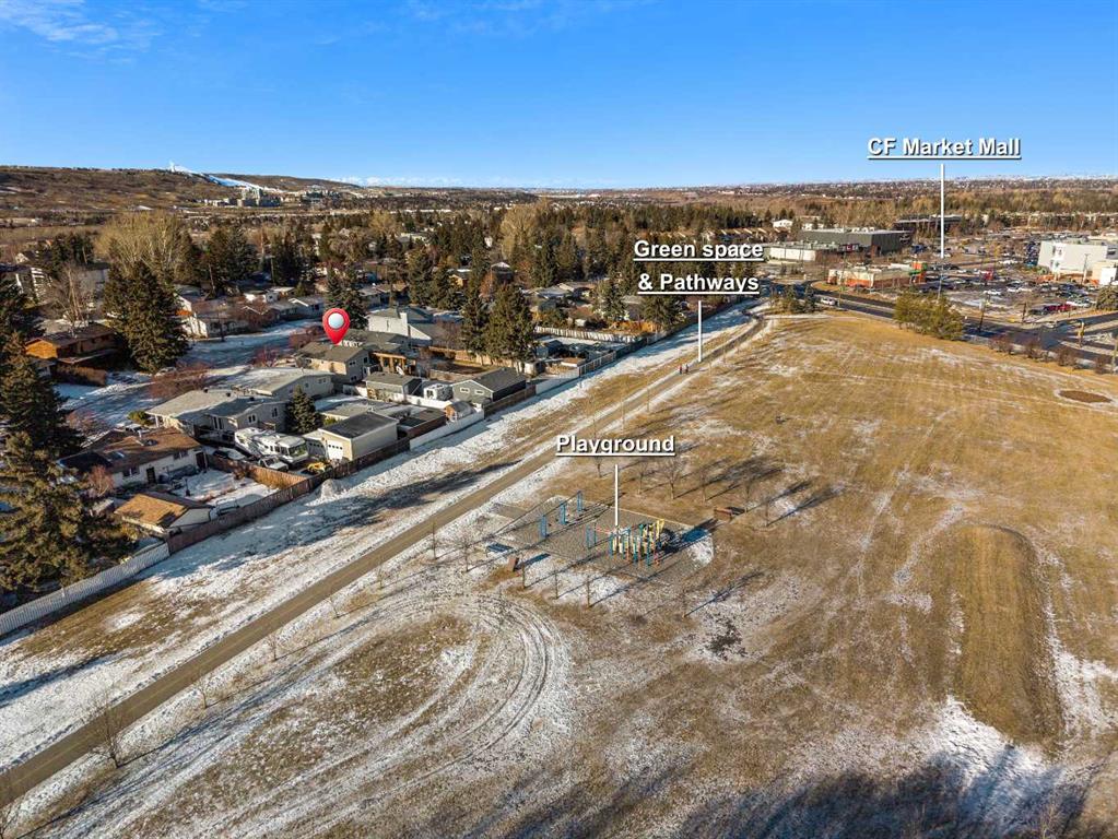 The fully developed lower level adds significant flexibility. A large family room offers generous space for movie nights, games, or a second living area. Two additional well-sized bedrooms are complemented by a thoughtfully designed bathroom with a private vanity room and a separate enclosed shower. A spacious laundry area and ample storage complete the level. The outdoor space is equally impressive. A long paved driveway, rear RV parking, and a fully fenced yard provide exceptional usability of the lot. Mature trees and established landscaping create a sense of privacy and permanence. A two-person Spaberry hot tub and large poly shed are included. Two heated garages further enhance the functionality of the property. The newer oversized rear garage is fully insulated and heated and offers excellent space for parking, workshop use, hobbies, or organized storage, including metal shelving. The second heated garage is currently set up as a gym and provides additional flexible space depending on lifestyle needs. This dual-garage setup is a rare offering. Additional features include air conditioning, on-demand hot water system, water softener, security system, and thoughtful storage throughout. Backing onto green space and within walking distance to an off-leash park, playgrounds, shops, restaurants, and everyday amenities, this property offers space, character, and flexibility in one of NW Calgary’s most desirable communities.