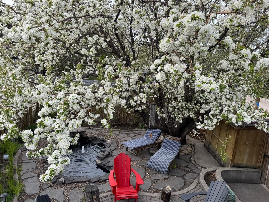 Outdoors, the professionally landscaped yard offers a private, tranquil setting with mature trees, a stamped concrete patio, and a serene pond—an ideal backdrop for relaxing or entertaining.