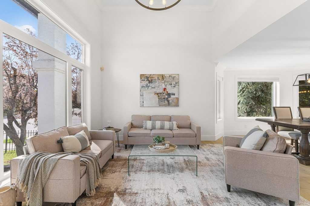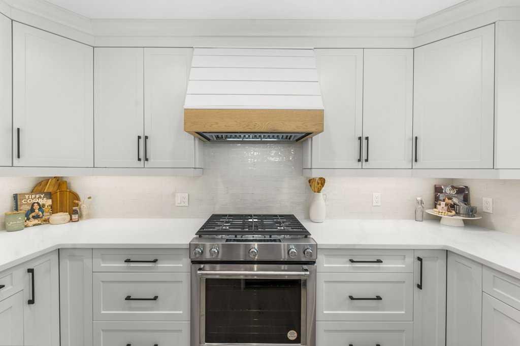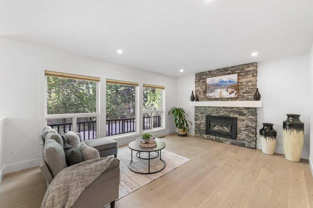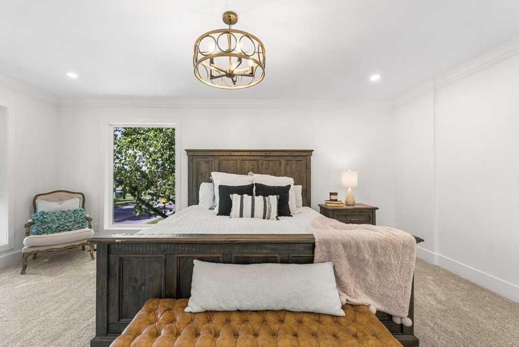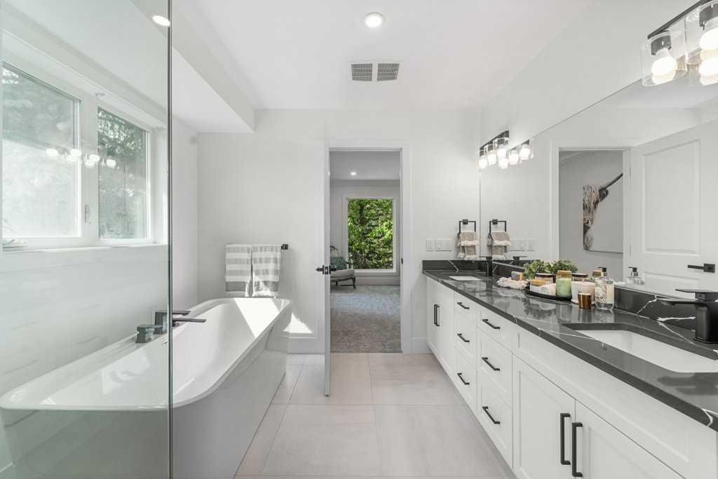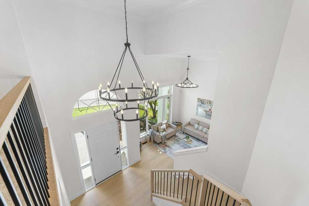 Inside, you are immediately enveloped by the home’s light and airy ambiance, accentuated by soaring ceilings, expansive windows, and a fresh, neutral palette. Every detail has been thoughtfully curated—from the modern black spindles and designer lighting to the elegant hardware and timeless finishes. The showpiece kitchen blends form and function with sleek quartz countertops, high-end stainless steel appliances, crisp white cabinetry, and a large breakfast bar that flows effortlessly into the dining area and cozy family room with a stunning gas fireplace.