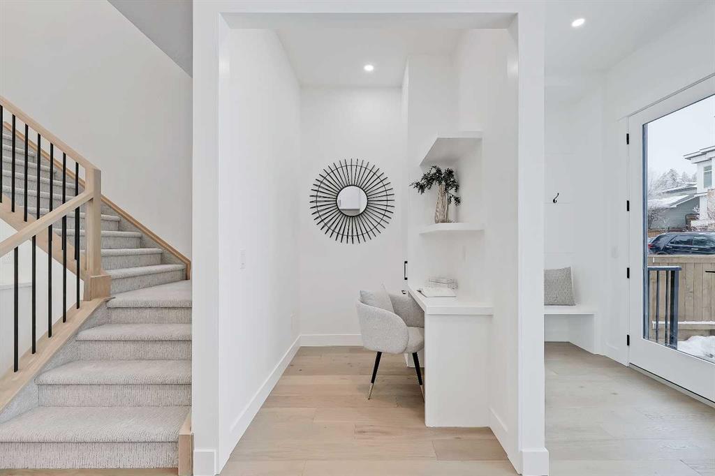 Welcome to a home where contemporary elegance meets everyday comfort in the heart of MONTGOMERY. Situated on a quiet street in this sought-after inner-city community, this stunning new build is designed with both style and function in mind, offering a thoughtfully crafted layout including a WALKOUT BASEMENT w/ COVERED PATIO SPACE, high-end finishes, and incredible natural light throughout. From the moment you step inside, the open-concept main floor makes an immediate impression. You’re greeted by a lovely glass wall in the front foyer, looking into the main floor home office with a built-in desk. The heart of the home is the designer kitchen—a perfect blend of modern aesthetics and practicality. A waterfall island anchors the space, complemented by custom cabinetry, quartz countertops, and top-tier appliances, including a gas range and French door fridge. A built-in pantry offers storage space, while a built-in coffee counter adds more cabinetry and room for small appliances. The front dining area is spacious enough for large gatherings, while the living room is designed for relaxation and entertaining, featuring a sleek gas fireplace and oversized patio doors that open to the upper deck and SOUTHWEST-FACING BACKYARD. A stylish built-in bench and hooks in the mudroom provide everyday convenience, and a chic powder room completes the main level. Upstairs, the primary suite is stylishly finished with a tray ceiling and a spacious walk-in closet with custom built-ins. The generous ensuite is a masterpiece, featuring a freestanding soaker tub, a walk-in shower with a bench, dual vanities, and elegant finishes. Two additional bedrooms each have built-in closets, while a beautifully finished main bath adds even more functionality along with the full laundry room with tile floor and built-in cabinetry. The legal 2-BED LOWER SUITE is a fully independent living space featuring a modern kitchen with full-height cabinetry, quartz countertops, and a stainless steel appliance package. The thoughtful layout includes a bright living room, two spacious bedrooms with built-in closets, a stylish 4-piece bath, dedicated laundry, and a private backyard entrance. The highlight of this space, though, is the full WALKOUT PATIO – the covered space is perfect for enjoying the outdoors year-round, with the additional convenience of a fully private entrance! Located in Montgomery, this home offers an unbeatable lifestyle. Enjoy quick access to the Bow River pathways, Shouldice Park, and Winsport, perfect for outdoor enthusiasts. The community is home to fantastic local restaurants, trendy coffee shops, and boutique shopping while offering easy access to Market Mall, Foothills Hospital, the University of Calgary, and major roadways for a seamless commute. Don’t miss your chance to own this beautifully designed home in one of Calgary’s most desirable neighbourhoods! *Photos from show suite finishes may vary*